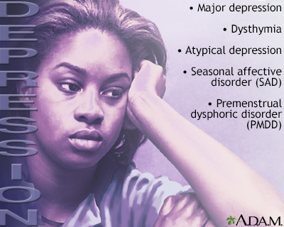 Depression - InDepth Seasonal affective disorder - InDepth; Blues - InDepth; Gloom - InDepth; Sadness - InDepth; Melancholy - InDepthAn in-depth report on the causes, diagnosis, treatment, and prevention of depression.HighlightsWhat is Depression?Depression is a mood disorder in which overwhelming feelings of sadness, loss of pleasure, guilt, and hopelessness interfere with daily life. People with depression also suffer from sleep problems, difficulty concentrating, fatigue and low energy, changes in appetite, and recurring thoughts of death or suicide. In medical terms, depression is also referred to as major depression, major depressive disorder, or clinical depression. American Psychiatric Association Treatment GuidelinesThe American Psychiatric Association's guidelines for the treatment of people with major depressive disorder include: Exercise and other healthy behaviors (good nutrition, sleep hygiene, reducing use of tobacco, alcohol, and other harmful substances) are recommended for helping improve mood symptoms. Drug treatment is recommended for severe single and recurrent depressive episodes. Antidepressants are the main drugs used to treat depression. Individual or group therapies of various modalities can also be very helpful in the treatment of depression. Electroconvulsive therapy (ECT) may be helpful for people with treatment-resistant depression, particularly for people who have not responded to medication. Transcranial magnetic stimulation and vagus nerve stimulation are also possible options. Researchers are studying new types of brain stimulation treatments for depression. IntroductionThroughout life everyone experiences periods of temporary unhappiness and emotional pain. However, when sadness persists and impairs daily functioning, it may indicate a depressive disorder. Severity, duration, and the presence of other symptoms are the factors that distinguish normal sadness from clinical depression. Clinical depression is classified as a mood disorder. The two main types are: Major depressive disorder, also called major depression Persistent depressive disorder (dysthymia), which is chronic but less severe major depression Other depressive disorders include: Disruptive mood dysregulation disorder Premenstrual dysphoric disorder Depression due to substance abuse, medications, or a medical condition Depression can also have different features or "specifiers." For example, depression may occur with: Anxious distress with anxiety-type symptoms such as feeling tense, restless, fearing something awful may happen, fearing losing control, or having difficulty concentrating because of worry. Mixed features, when elevated mood, inflated self-esteem, grandiosity, or racing speech or thoughts occur in a person who is mainly depressed. These are similar to the manic or hypomanic (milder) symptoms found in bipolar disorder. However, bipolar disorder is a separate illness. (Bipolar disorder can also have mixed features when depression occurs in someone who is mainly manic.) Atypical features, which are characterized by mood reactivity, the ability to experience improved mood in response to favorable experiences. Atypical features are accompanied by two or more symptoms such as sensitivity to rejection, hypersomnia (oversleeping), overeating, and leaden paralysis (feelings of heaviness in the arms and legs). Psychotic features, when delusions or hallucinations are present. Seasonal pattern, when major depression occurs regularly during a particular time of the year, such as the fall or winter. This is often referred to as seasonal affective disorder. Previous imagePlay SlideshowStop SlideshowNext image / Depression is defined as a mood disorder, and there are several types. Major depression is sometimes referred to as unipolar depression to distinguish it from bipolar depression, which is found in bipolar disorder. Bipolar disorder, formerly called manic-depression, is characterized by periods of depression alternating with episodes of excessive energy and activity (mania). Bipolar disorder is a separate mental illness not discussed in this report. Major DepressionMajor depression is also called major depressive disorder. In major depression, at least five of the symptoms listed below must occur nearly every day during a 2-week period, and they must represent a change from previous behavior or mood. Depressed mood or loss of interest or pleasure must be present. Symptoms include: Depressed mood on most days for most of each day -- irritability may be prominent in children and adolescents Total or very noticeable loss of interest or pleasure in activities most of the time Significant increases or decreases in appetite, weight, or both Sleep disorders, either insomnia or excessive sleepiness, nearly every day Feelings of agitation or a sense of intense slowness Loss of energy and a daily sense of tiredness Sense of guilt or worthlessness nearly all the time Inability to think or concentrate occurring nearly every day Recurrent thoughts of death or suicide In addition, other criteria must be met: The symptoms listed above do not follow or accompany manic episodes (such as in bipolar disorder or other disorders). They impair important normal functions (such as work or personal relationships). They are not caused by drugs, alcohol, or other substances. It can sometimes be difficult to distinguish the normal grief and anguish that comes with losing a loved one from the sadness and emptiness experienced with major depression. According to the American Psychiatric Association, the grief of loss usually decreases over time, and occurs in waves associated with thoughts of the deceased. In contrast, major depression is persistent and the sadness is not specific. However, bereavement can trigger a major depressive episode in some people. Depression in ChildrenSymptoms for major depression in children can differ from those in adults and may include: An inability to enjoy favorite activities Persiste