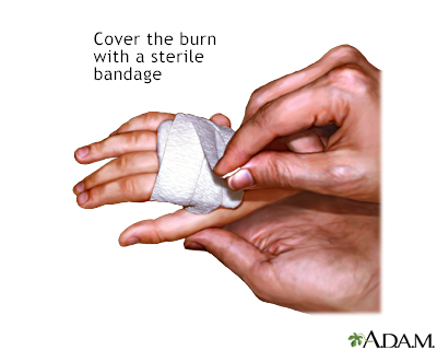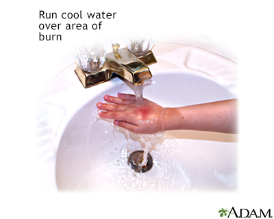 BurnsFirst degree burn; Second degree burn; Third degree burnBurns commonly occur by direct or indirect contact with heat, electric current, radiation, or chemical agents. Burns can lead to cell death, which can require hospitalization and can be fatal. Considerations There are three levels of burns:First-degree burns affect only the outer layer of the skin. They cause pain, redness, and swelling. Second-degree burns affect both the outer and underlying layer of skin. They cause pain, redness, swelling, and blistering. They are also called partial thickness burns. Third-degree burns affect the deep layers of skin. They are also called full thickness burns. They cause white or blackened, burned skin. The skin may be numb.Burns fall into two groups.Minor burns are:First degree burns anywhere on the body Second degree burns less than 2 to 3 inches (in) or 5.08 to 7.62 centimeters (cm) wideMajor burns include:Third-degree burns Second-degree burns more than 2 to 3 in (5.08 to 7.62 cm) wide Second-degree burns on the hands, feet, face, groin, buttocks, or over a major jointYou can have more than one type of burn at a time.Major burns need urgent medical care. This can help prevent scarring, disability, and deformity.Burns on the face, hands, feet, and genitals can be particularly serious.Children under age 4 and adults over age 60 have a higher chance of complications and death from severe burns because their skin tends to be thinner than in other age groups. Causes Causes of burns from most to least common are: Fire/flame Scalding from steam or hot liquids Touching hot objects Electrical burns Chemical burnsBurns can be the result of any of the following:House and industrial fires Car accidents Playing with matches Faulty space heaters, furnaces, or industrial equipment Unsafe use of firecrackers and other fireworks Kitchen accidents, such as a child grabbing a hot iron or touching the stove or ovenYou can also burn your airways if you breathe in smoke, steam, superheated air, or chemical fumes in poorly ventilated areas. Symptoms Burn symptoms can include:Blisters that are either intact (unbroken) or have ruptured and are leaking fluid. BlistersA vesicle is a small fluid-filled blister on the skin.ImageRead Article Now Book Mark Article Pain -- How much pain you have is unrelated to the level of burn. The most serious burns can be painless. Peeling skin. Shock -- Watch for pale and clammy skin, weakness, blue lips and fingernails, and a decrease in alertness. ShockShock is a life-threatening condition that occurs when the body is not getting enough blood flow. Lack of blood flow means the cells and organs do n...ImageRead Article Now Book Mark Article Swelling. Red, white, or charred skin.You may have an airway burn if you have:Burns on the head, face, neck, eyebrows, or nose hairs Burned lips and mouth Coughing Difficulty breathing Difficulty breathingBreathing difficulty may involve:Difficult breathing Uncomfortable breathingFeeling like you are not getting enough airImageRead Article Now Book Mark Article Dark, black-stained mucus Voice changes WheezingWheezingWheezing is a high-pitched whistling sound during breathing. It occurs when air moves through narrowed breathing tubes in the lungs.ImageRead Article Now Book Mark Article First Aid Before giving first aid, it is important to determine what type of burn the person has. If you are not sure, treat it as a major burn. Serious burns need medical care right away. Call 911 or the local emergency number. MINOR BURNSIf the skin is unbroken:Run cool water over the area of the burn or soak it in a cool water bath (not ice water). Keep the area under water for at least 5 to 30 minutes. A clean, cold, wet towel will help reduce pain. Calm and reassure the person. After flushing or soaking the burn, cover it with a dry, sterile bandage or clean dressing. Protect the burn from pressure and friction. Over-the-counter ibuprofen or acetaminophen can help relieve pain and swelling. Do not give aspirin to children under 12. Once the skin has cooled, moisturizing lotion containing aloe and an antibiotic also can help. Minor burns will often heal without further treatment. Make sure the person is up to date on their tetanus immunization.MAJOR BURNSIf someone is on fire, tell the person to stop, drop, and roll. Then, follow these steps: Wrap the person in thick material; such as a wool or cotton coat, rug, or blanket. This helps put out the flames. Pour water on the person. Call 911 or the local emergency number. Make sure that the person is no longer touching any burning or smoking materials. Do not remove burned clothing that is stuck to the skin. Make sure the person is breathing. If necessary, begin rescue breathing and CPR. CPRCPR stands for cardiopulmonary resuscitation. It is an emergency life-saving procedure that is done when someone's breathing or heartbeat has stoppe...Read Article Now Book Mark Article Cover the burned area with a dry sterile bandage (if available) or clean cloth. A sheet will do if the burned area is large. Do not apply any ointments. Avoid breaking burn blisters. If fingers or toes have been burned, separate them with dry, sterile, non-stick bandages. Raise the body part that is burned above the level of the heart. Protect the burn area from pressure and friction. If an electrical injury may have caused the burn, do not touch the victim directly. Use a non-metallic object to separate the person away from exposed wires before starting first aid. You will also need to prevent shock. If the person does not have a head, neck, back, or leg injury, follow these steps: Lay the person flat Raise the feet about 12 in (30 cm) Cover the person with a coat or blanket Continue to monitor the person's pulse, rate of breathing, and blood pressure until medical help arrives.PulseThe pulse is the number of heartbeats per minute.ImageRead Article Now Book Mark Article Do Not Things that should not be done for burns include:Do not apply oil,