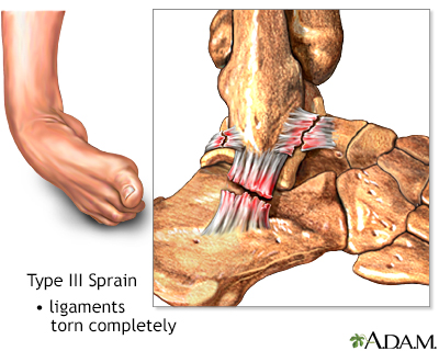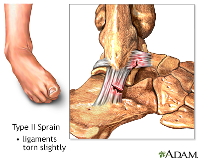 BACK TOTOP Browse A-ZSearchBrowse A-ZABCDEFGHIJKLMNOPQRSTUVWXYZ0-9 E-mail FormEmail ResultsName:Email address:Recipients Name:Recipients address:Message: Print-FriendlyBookmarksbookmarks-menuSprainsJoint sprainA sprain is an injury to the ligaments around a joint. Ligaments are strong, flexible fibers that hold bones together. When a ligament is stretched too far or tears, the area around the joint will become painful and swell. Causes Sprains are caused when a joint is forced to move into an unnatural position. For example, twisting your ankle may cause a sprain to one or more of the ligaments around the ankle. Symptoms Symptoms of a sprain include:Joint pain or muscle pain Joint painJoint pain can affect one or more joints.ImageRead Article Now Book Mark Article Muscle painMuscle aches and pains are common and can involve more than one muscle. Pain due to muscles can also be felt in ligaments, tendons, and fascia. Fas...ImageRead Article Now Book Mark Article Swelling SwellingSwelling is the enlargement of organs, skin, or other body parts. It is caused by a buildup of fluid in the tissues. The extra fluid can lead to a ...ImageRead Article Now Book Mark Article Joint stiffness Discoloration of the skin, especially bruisingBruisingBleeding into the skin can occur from broken blood vessels that form tiny red dots (called petechiae). Blood also can collect under the tissue in la...ImageRead Article Now Book Mark Article First Aid First aid steps include:Apply ice right away to reduce swelling. Wrap the ice in cloth. Do not place ice directly on the skin. Wrap a bandage around the affected area to limit movement. Wrap firmly, but not tightly. Use a splint if needed. SplintA splint is a device used to hold a part of the body stable to decrease pain and prevent further injury.ImageRead Article Now Book Mark Article Keep the swollen joint raised above your heart, even while sleeping. Rest the affected joint for several days. Avoid putting stress on the joint because it can make the injury worse. A sling for the arm, or crutches or a brace for the leg can protect the injury. CrutchesIt is important to start walking as soon as you can after your surgery. But you will need support for walking while your leg heals. Crutches may be...Read Article Now Book Mark Article Aspirin, ibuprofen, or other pain relievers can help. Do not give aspirin to children.Keep pressure off the injured area until the pain goes away. Most of the time, a mild sprain will heal in 7 to 10 days. It may take several weeks for pain and swelling to go away after a bad sprain. Your health care provider may recommend crutches. Physical therapy can help you regain motion and strength of the injured area. When to Contact a Medical Professional Go to the hospital right away or call 911 or the local emergency number if:You think you have a broken bone. Broken boneIf more pressure is put on a bone than it can stand, it will split or break. A break of any size is called a fracture. If the broken bone punctures...ImageRead Article Now Book Mark Article The joint appears out of position. You have a serious injury or severe pain. You hear a popping sound and have immediate problems using the joint. Contact your provider if: Swelling does not start to go away within 2 days. You have symptoms of infection, including red, warm, painful skin or a fever over 100°F (38°C). The pain does not go away after several weeks. Prevention The following steps may lower your risk for a sprain: Wear protective footwear during activities that place stress on your ankle and other joints. Make sure that shoes fit your feet properly. Avoid high-heeled shoes. Always warm-up and stretch before doing exercise and sports. Avoid sports and activities for which you have not trained. Open ReferencesReferencesBiundo JJ, Canoso JJ. Bursitis, tendinopathy, other periarticular disorders, and sports medicine. In: Goldman L, Cooney KA, eds. Goldman Cecil Medicine. 27th ed. Philadelphia, PA: Elsevier; 2024:chap 242.Geiderman JM, Torbati S. General principles of orthopedic injuries. In: Walls RM, ed. Rosen's Emergency Medicine: Concepts and Clinical Practice. 10th ed. Philadelphia, PA: Elsevier; 2023:chap 41.Wang D, Eliasberg CD, Rodeo SA. Physiology and pathophysiology of musculoskeletal tissues. In: Miller MD, Thompson SR. eds. DeLee, Drez, & Miller's Orthopaedic Sports Medicine. 5th ed. Philadelphia, PA: Elsevier; 2020:chap 1.AllVideoImagesTogEarly treatment of injury - illustration Minor injuries like sprains may be treated at home if broken bones are not suspected. The acronym RICE is helpful in remembering how to treat minor injuries R stands for rest, I is for ice, C is for compression, and E is for elevation. Pain and swelling should decrease within 48 hours, and gentle movement may be beneficial, but pressure should not be put on a sprained joint until pain is completely gone (one to several weeks).Early treatment of injuryillustrationAnkle sprain - SeriesPresentation Early treatment of injury - illustration Minor injuries like sprains may be treated at home if broken bones are not suspected. The acronym RICE is helpful in remembering how to treat minor injuries R stands for rest, I is for ice, C is for compression, and E is for elevation. Pain and swelling should decrease within 48 hours, and gentle movement may be beneficial, but pressure should not be put on a sprained joint until pain is completely gone (one to several weeks).Early treatment of injuryillustration Ankle sprain - SeriesPresentation Related Information Review Date: 4/1/2025 Reviewed By: Linda J. Vorvick, MD, Clinical Professor Emeritus, Department of Family Medicine, UW Medicine, School of Medicine, University of Washington, Seattle, WA. Also reviewed by David C. Dugdale, MD, Medical Director, Brenda Conaway, Editorial Director, and the A.D.A.M. Editorial team. The information provided herein should not be used during any medical emergency or for the diagnosis or treatment of any medical condi