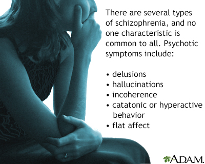Schizophrenia - InDepth Psychosis - schizophrenia - InDepth; Psychotic disorders - schizophrenia - InDepthAn in-depth report on the causes, diagnosis, and treatment of schizophreniaHighlightsWhat is Schizophrenia?Schizophrenia is a long-term (chronic) psychiatric disorder that severely affects a person's thinking, mood, and behavior. It is a leading cause of disability and a major risk factor for alcohol and substance abuse as well as suicide. Causes of SchizophreniaThe causes of schizophrenia are not known. Multiple factors such as genetics and brain chemistry may play a role. Complications of SchizophreniaSchizophrenia can have a devastating impact on people and their families. People with schizophrenia have increased risk for self-destructive behaviors and suicide. The antipsychotic drugs used to treat schizophrenia can have severe side effects, including increased risk of obesity and diabetes. MedicationsSchizophrenia is a chronic condition, which is usually treated with antipsychotic medication. There are two main classes of these drugs: Typical antipsychotics ("first-generation" antipsychotics) include haloperidol (Haldol), chlorpromazine (Thorazine), perphenazine (Trilafon), thioridazine (Mellaril), trifluoperazine (Stelazine), and fluphenazine (Prolixin). All of these drugs are available as generics. Atypical antipsychotics ("second-generation" antipsychotics) include clozapine (Clozaril, generic), risperidone (Risperdal, generic), olanzapine (Zyprexa, generic), quetiapine (Seroquel, generic), ziprasidone (Geodon, generic), aripiprazole (Abilify), paliperidone (Invega), iloperidone (Fanapt), asenapine (Saphris), lurasidone (Latuda), and cariprazine (Vraylar), and lumateperone (Caplyta).IntroductionSchizophrenia is a long-term (chronic) severe brain disorder that interferes with thinking and mental or emotional responsiveness. The term schizophrenia, which means "split mind," was first used in 1911 by Swiss psychiatrist Eugen Bleuler to categorize people whose thought processes and emotional responses seemed disconnected. Despite its name, the condition does not cause a split personality. Schizophrenia affects people's ability to: Tell the difference between what is real and not real Think clearly Have normal emotional responses Act normally in social situations Schizophrenia is a lifelong condition that poses significant challenges to both people and their families. The severity and prognosis of the disease vary from person to person. With medication, therapy, and support services, many people are able to control their symptoms, prevent relapses, and cope well with their condition. Previous imagePlay SlideshowStop SlideshowNext image / Schizophrenia is one condition in a group of psychotic disorders characterized by disturbances in perception, behavior, and communication. SymptomsSchizophrenia is part of a spectrum of psychotic disorders. Psychosis is the medical term for a loss of contact with reality. The American Psychiatric Association assigns the following 5 features to psychotic disorders: Delusions. A delusion is a fixed, false belief. It can be bizarre (such as invisible aliens have entered the room through an electrical socket) or non-bizarre (such as unwarranted jealousy or the paranoid belief in being persecuted or watched). Hallucinations. A hallucination is the experience of seeing, hearing, tasting, smelling, or feeling something that does not really exist. Auditory hallucinations are false senses of sound such as hearing voices that can't be heard by others. Auditory hallucinations are the most common psychotic symptom experienced by adults with schizophrenia. Visual hallucinations are often a symptom of childhood schizophrenia. Disorganized Thinking (Speech). Thought disorders are manifestations of disorganized speech and thinking. People with schizophrenia may have incoherent or garbled speech patterns ("word salad") or have difficulty expressing themselves in a logical manner. They may also have "loose associations" where it may be difficult to follow their train of thought. Extremely Disorganized or Abnormal Motor Behavior. Movement disorders can range from agitated or repetitive body movements to complete lack of motion or responsiveness (catatonia). A person may act with impulsive childlike silliness and be unable to perform goal-directed behavior. Movements may be excessive and purposeless. They may also include staring, grimacing, and echoing of speech. Negative Symptoms. Negative symptoms indicate an absence of normal emotional responses and interest in social interactions or typical activities, and an inability to experience pleasure. A prominent negative symptom associated with schizophrenia is emotional flatness ("lack of affect" or "flat affect"), which is often characterized by a lack of facial expression and expressive hand or body language, avoidance of eye contact, and speaking in a monotone. Avolition, another negative symptom found in schizophrenia, is a reduced ability to plan or initiate purposeful activities. Psychiatrists often group the first four of these symptoms as positive symptoms to distinguish them from negative symptoms. Positive symptoms include the psychotic symptoms that are most often associated with schizophrenia.Cognitive symptoms, which are associated with thinking processes, are also associated with schizophrenia. They include:Difficulty focusing or paying attention Difficulty understanding information or following instructions Difficulty prioritizing tasks and making decisions Poor memory and concentration Difficulty understanding other people's intentions Lack of insight of mental illness and schizophrenia symptoms The American Psychiatric Association used to previously categorize subtypes of schizophrenia (such as paranoid and catatonic). The APA has eliminated these subtypes because they had not proven to be helpful or reliable for diagnosis or treatment decisions. The signs and symptoms of schizophrenia can start abruptl