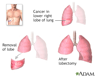 BACK TOTOP Browse A-ZSearchBrowse A-ZABCDEFGHIJKLMNOPQRSTUVWXYZ0-9 Pulmonary lobectomyBack E-mail FormEmail ResultsName:Email address:Recipients Name:Recipients address:Message: Review Date: 12/13/2019 Reviewed By: Todd Gersten, MD, Hematology/Oncology, Florida Cancer Specialists & Research Institute, Wellington, FL. Review provided by VeriMed Healthcare Network. Also reviewed by David Zieve, MD, MHA, Medical Director, Brenda Conaway, Editorial Director, and the A.D.A.M. Editorial team. The information provided herein should not be used during any medical emergency or for the diagnosis or treatment of any medical condition. A licensed medical professional should be consulted for diagnosis and treatment of any and all medical conditions. Links to other sites are provided for information only -- they do not constitute endorsements of those other sites. No warranty of any kind, either expressed or implied, is made as to the accuracy, reliability, timeliness, or correctness of any translations made by a third-party service of the information provided herein into any other language. © 1997- A.D.A.M., a business unit of Ebix, Inc. Any duplication or distribution of the information contained herein is strictly prohibited. © 1997- All rights reserved. A.D.A.M. content is best viewed in IE9 or above, Firefox and Google Chrome browser.Content is best viewed in IE9 or above, Firefox and Google Chrome browser.