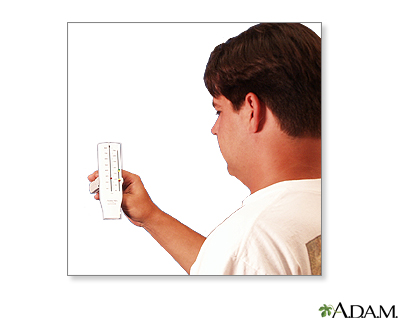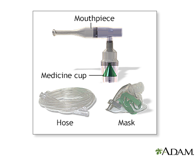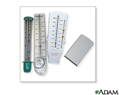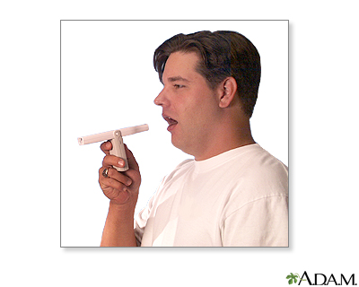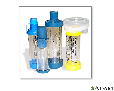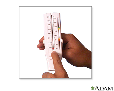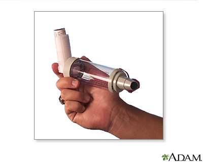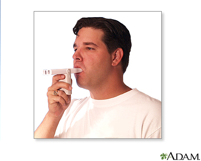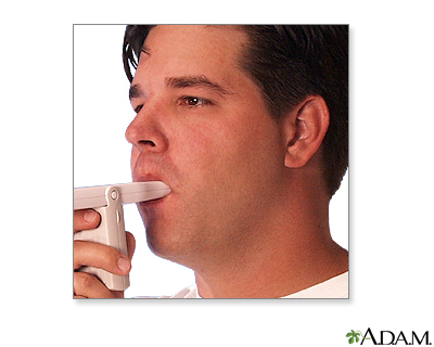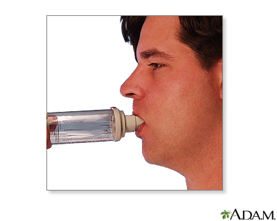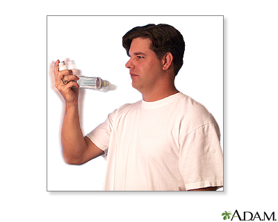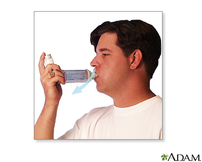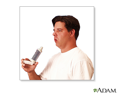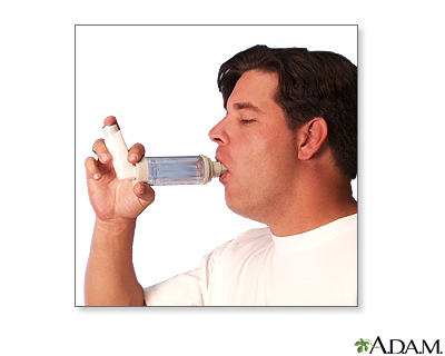 BACK TOTOP Browse A-ZSearchBrowse A-ZABCDEFGHIJKLMNOPQRSTUVWXYZ0-9 E-mail FormEmail ResultsName:Email address:Recipients Name:Recipients address:Message: Print-FriendlyBookmarksbookmarks-menuAsthmaBronchial asthma; Wheezing - asthma - adultsAsthma is a chronic disease that causes the airways of the lungs to swell and become narrow. It leads to breathing difficulty such as wheezing, shortness of breath, chest tightness, and coughing.Related video goes here for no-HTML5 browsers Causes Asthma is caused by swelling (inflammation) in the airways. An asthma attack occurs when the lining of the air passages has become swollen and the muscles surrounding the airways become tight. This narrowing reduces the amount of air that can pass through the airway.Previous imagePlay SlideshowStop SlideshowNext image / Asthma symptoms can be caused by breathing in substances called allergens or triggers, or by other causes.AllergensAn allergen is a substance that can cause an allergic reaction. In some people, the immune system recognizes allergens as foreign or dangerous. As ...ImageRead Article Now Book Mark Article Common asthma triggers include:Animals (pet hair or dander) Dust mites Certain medicines (such as aspirin and other nonsteroidal anti-inflammatory drugs [NSAIDs]) Changes in weather (most often cold weather) Chemicals in the air (pollution) or in food Physical activity Mold Pollen Respiratory infections, such as the common cold and many other viruses Common coldThe common cold most often causes a runny nose, nasal congestion, and sneezing. You may also have a sore throat, cough, headache, or other symptoms....ImageRead Article Now Book Mark Article Strong emotions (stress) Tobacco or other inhalant that is smokedSubstances in some workplaces can also trigger asthma symptoms, leading to occupational asthma. The most common triggers are wood dust, grain dust, animal dander, fungi, or chemicals.Occupational asthmaOccupational asthma is a lung disorder in which substances found in the workplace cause the airways of the lungs to swell and narrow. This leads to ...ImageRead Article Now Book Mark Article Related video goes here for no-HTML5 browsersMany people with asthma have a personal or family history of allergies, such as hay fever (allergic rhinitis) or eczema. Others have no history of allergies.AllergiesAn allergy is an immune response or reaction to substances that are usually not harmful.ImageRead Article Now Book Mark Article Allergic rhinitisAllergic rhinitis is a diagnosis associated with a group of symptoms affecting the nose. These symptoms occur when you breathe in something you are ...ImageRead Article Now Book Mark Article EczemaAtopic dermatitis is a long-term (chronic) skin disorder that involves scaly and itchy rashes. It is a type of eczema. Other forms of dermatitis inc...ImageRead Article Now Book Mark Article Previous imagePlay SlideshowStop SlideshowNext image / Symptoms Asthma symptoms vary from person to person. For example, you may have symptoms all the time or mostly during physical activity. Most people with asthma have attacks separated by symptom-free periods. Some people have long-term shortness of breath with episodes of increased shortness of breath. Wheezing or a cough may be the main symptom.Related video goes here for no-HTML5 browsersAsthma attacks can last for minutes to days. An asthma attack may start suddenly or develop slowly over several hours or days. It may become dangerous if airflow is severely blocked.Symptoms of asthma include:Cough with or without phlegm (sputum) production CoughCoughing is an important way to keep your throat and airways clear. But too much coughing may mean you have a disease or disorder. Some coughs are d...ImageRead Article Now Book Mark Article Pulling in of the skin between the ribs when breathing (intercostal retractions) Intercostal retractionsIntercostal retractions occur when the muscles between the ribs pull inward. The movement is most often a sign that the person has a breathing probl...ImageRead Article Now Book Mark Article Shortness of breath that gets worse with exercise or activity Shortness of breathBreathing difficulty may involve:Difficult breathing Uncomfortable breathingFeeling like you are not getting enough airImageRead Article Now Book Mark Article Whistling sound or wheezing as you breathe Pain or tightness in the chest Pain or tightness in the chestChest pain is discomfort or pain that you feel anywhere along the front of your body between your neck and upper abdomen.ImageRead Article Now Book Mark Article Difficulty sleeping Abnormal breathing pattern (breathing out takes more than twice as long as breathing in)Related video goes here for no-HTML5 browsersEmergency symptoms that need prompt medical help include:Bluish color to the lips and face (cyanosis) Bluish colorA bluish color to the skin or mucous membrane is usually due to a lack of oxygen in the blood. The medical term is cyanosis.ImageRead Article Now Book Mark Article Decreased level of alertness, such as severe drowsiness or confusion, during an asthma attack Extreme difficulty breathing Difficulty breathingBreathing difficulty may involve:Difficult breathing Uncomfortable breathingFeeling like you are not getting enough airImageRead Article Now Book Mark Article Rapid pulse Rapid pulseA bounding pulse is a strong throbbing felt over one of the arteries in the body. It is due to a forceful heartbeat.ImageRead Article Now Book Mark Article Severe anxiety due to shortness of breath AnxietyStress is a feeling of emotional or physical tension. It can come from any event or thought that makes you feel frustrated, angry, or nervous. Stres...ImageRead Article Now Book Mark Article Sweating SweatingSweating is the release of liquid from the body's sweat glands. This liquid contains salt. This process is also called perspiration. Sweating helps...ImageRead Article Now Book Mark Article Difficulty speaking Breathing temporarily stopsRelated video goes 
