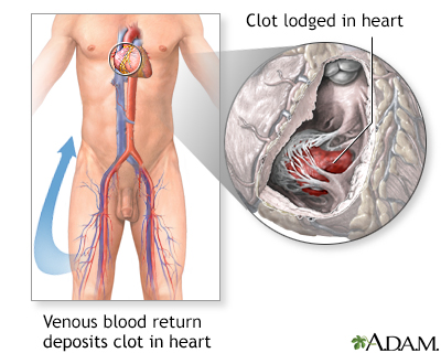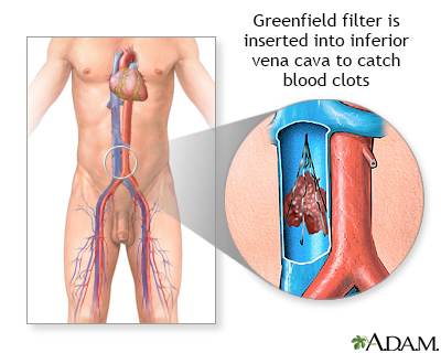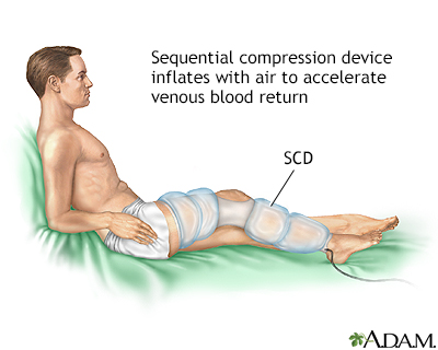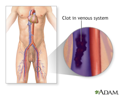 Deep vein thrombosisDVT; Blood clot in the legs; Thromboembolism; Post-phlebitic syndrome; Post-thrombotic syndrome; Venous - DVTDeep vein thrombosis (DVT) is a condition that occurs when a blood clot forms in a vein deep inside a part of the body. DVT mainly affects the large veins in the lower leg and thigh, but can occur in other deep veins, such as in the arms and pelvis. DVT most often affects only one side of the body. Causes DVT is most common in adults over age 60. But it can occur at any age. When a clot breaks off and moves through the bloodstream, it is called an embolism. An embolism can get stuck in the blood vessels in the brain, lungs, heart, or another area, leading to severe damage. Blood clots may form when something slows or changes the flow of blood in the veins. Blood clotsBlood clots are clumps that occur when blood hardens from a liquid to a solid. A blood clot that forms inside one of your veins or arteries is calle...ImageRead Article Now Book Mark Article Risk factors include: A pacemaker catheter that has been passed through a vein in the groin Bed rest or sitting in one position for too long, such as plane or car travel Family history of blood clots Fractures in the pelvis or legs Giving birth within the last 6 months Pregnancy Obesity ObesityObesity means weighing more than what is healthy for a given height. Obesity is a serious, chronic disease. It can lead to other health problems, i...ImageRead Article Now Book Mark Article Recent surgery (most commonly hip, knee, or female pelvic surgery) Too many blood cells being made by the bone marrow, causing the blood to be thicker than normal (polycythemia vera) Polycythemia veraPolycythemia vera (PV) is a bone marrow disease that leads to an abnormal increase in the number of blood cells. The red blood cells are the most af...Read Article Now Book Mark Article Having an indwelling (long-term) catheter in a blood vessel Age greater than 60Blood is more likely to clot in someone who has certain problems or disorders, such as:Cancer Certain autoimmune disorders, such as lupus Autoimmune disordersAn autoimmune disorder occurs when the body's immune system attacks and destroys healthy body tissue by mistake. There are more than 80 autoimmune d...ImageRead Article Now Book Mark Article LupusSystemic lupus erythematosus (SLE) is an autoimmune disease. In this disease, the immune system of the body mistakenly attacks healthy tissue. It c...ImageRead Article Now Book Mark Article Cigarette smoking Conditions that make it more likely to develop blood clots Taking estrogens or birth control pills (this risk is even higher with smoking) Sitting for long periods when traveling can increase the risk for DVT. This is most likely when you also have one or more of the risk factors listed above. Symptoms DVT mainly affects the large veins in the lower leg and thigh, most often on one side of the body. The clot can block blood flow and cause:Redness of the skin Skin that feels warm to the touch Swelling (edema) of a leg or arm Pain or tenderness in a leg or arm Exams and Tests Your health care provider will perform a physical exam. The exam may show a red, swollen, or tender leg. Tests that are often done to diagnose a DVT are:D-dimer blood test D-dimer blood testD-dimer tests are used to check for blood clotting problems. Blood clots can cause health problems, such as:Deep vein thrombosis (DVT)Disseminated i...ImageRead Article Now Book Mark Article Doppler ultrasound exam of the area of concern Doppler ultrasound examThis test uses ultrasound to look at the blood flow in the large arteries and veins in the arms or legs.ImageRead Article Now Book Mark Article A pelvic or abdominal MRI or CTPelvicA pelvis MRI (magnetic resonance imaging) scan is an imaging test that uses a machine with powerful magnets and radio waves to create pictures of the...Read Article Now Book Mark Article Abdominal MRIAn abdominal magnetic resonance imaging scan is an imaging test that uses powerful magnets and radio waves. The waves create pictures of the inside ...ImageRead Article Now Book Mark Article CTA computed tomography (CT) scan is an imaging method that uses x-rays to create pictures of cross-sections of the body. Related tests include:Abdomin...ImageRead Article Now Book Mark Article Blood tests may be done to check if you have an increased chance of blood clotting, including:Activated protein C resistance (checks for the Factor V Leiden variant) Genetic testing for other variant genes, such as the prothrombin G20210A variant Antithrombin III levels Antithrombin III levelsAntithrombin III (AT III) is a protein that helps control blood clotting. A blood test can determine the amount of AT III present in your body....Read Article Now Book Mark Article Antiphospholipid antibodies Complete blood count (CBC) Complete blood countA complete blood count (CBC) test measures the following:The number of white blood cells (WBC count)The number of red blood cells (RBC count)The numb...ImageRead Article Now Book Mark Article Lupus anticoagulant Protein C and protein S levels Protein CProtein C is a normal substance in the body that prevents blood clotting. A blood test can be done to see how much of this protein you have in your ...Read Article Now Book Mark Article Protein SProtein S is a normal substance in your body that prevents blood clotting. A blood test can be done to see how much of this protein you have in your...Read Article Now Book Mark Article Treatment Your provider will give you medicine to thin your blood (called an anticoagulant). This will keep more clots from forming or old ones from getting bigger.Heparin is often the first medicine you will receive.If heparin is given through a vein (IV), you must stay in the hospital. However, most people can be treated without staying in the hospital. Low molecular weight heparin can be given by injection under your skin once or twice a day. You may not need to stay in the hospital as long, or at all, 