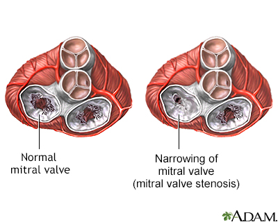 Mitral stenosisMitral valve obstruction; Heart mitral stenosis; Valvular mitral stenosisMitral stenosis is a disorder in which the mitral valve does not fully open. This restricts the flow of blood.Previous imagePlay SlideshowStop SlideshowNext image / Causes Blood that flows between different chambers of your heart must flow through a valve. The valve between the 2 chambers on the left side of your heart is called the mitral valve. It opens up enough so that blood can flow from the upper chamber of your heart (left atrium) to the lower chamber (left ventricle). It then closes, keeping blood from flowing backwards.Mitral stenosis means that the valve cannot open enough. As a result, less blood flows to the body. The upper heart chamber swells as pressure builds up. Blood and fluid may then collect in the lung tissue (pulmonary edema), making it hard to breathe.In adults, mitral stenosis occurs most often in people who have had rheumatic fever. This is a disease that can develop after an illness with strep throat that was not properly treated.The valve problems develop 5 to 10 years or more after having rheumatic fever. Symptoms may not show up for even longer. Rheumatic fever is rare in the United States because strep infections are most often treated. This has made mitral stenosis less common.Rarely, other factors can cause mitral stenosis in adults. These include:Calcium deposits forming around the mitral valve Radiation treatment to the chest Some medicinesChildren may be born with mitral stenosis (congenital) or other birth defects involving the heart that cause mitral stenosis. Often, there are other heart defects present along with the mitral stenosis.Mitral stenosis may run in families. Symptoms Adults may have no symptoms. However, symptoms may appear or get worse with exercise or other activity that raises the heart rate. Symptoms will most often develop between ages 20 and 50.Symptoms may begin with an episode of atrial fibrillation (especially if it causes a fast heart rate). Symptoms may also be triggered by pregnancy or other stress on the body, such as infection in the heart or lungs, or other heart disorders.Symptoms may include:Chest discomfort that increases with activity and extends to the arm, neck, jaw or other areas (this is rare) Cough, possibly with bloody phlegm Difficulty breathing during or after exercise (This is the most common symptom.) Waking up due to breathing problems or when lying in a flat position Fatigue Frequent respiratory infections, such as bronchitis Feeling of pounding heart beat (palpitations) Swelling of feet or anklesIn infants and children, symptoms may be present from birth (congenital). They will almost always develop within the first 2 years of life. Symptoms include:Cough Poor feeding, or sweating when feeding Poor growth Shortness of breath Exams and Tests The health care provider will listen to the heart and lungs with a stethoscope. A murmur, snap, or other abnormal heart sound may be heard. The typical murmur is a rumbling sound that is heard over the heart during the resting phase of the heartbeat. The sound often gets louder just before the heart begins to contract.The exam may also reveal an irregular heartbeat or lung congestion. Blood pressure is most often normal.Narrowing or blockage of the valve or swelling of the upper heart chambers, or their complications, may be seen on:Chest x-ray Echocardiogram EchocardiogramAn echocardiogram is a test that uses sound waves to create pictures of the heart. The picture and information it produces is more detailed than a s...ImageRead Article Now Book Mark Article ECG (electrocardiogram) MRI or CT of the heart Transesophageal echocardiogram (TEE) Treatment Treatment depends on the symptoms and condition of the heart and lungs. People with mild symptoms or none at all may not need treatment. For severe symptoms, you may need to go to the hospital for diagnosis and treatment.Medicines which can be used to treat symptoms of heart failure, high blood pressure and to slow or regulate heart rhythms include:Diuretics (water pills) Nitrates, beta-blockers Calcium channel blockers ACE inhibitors Angiotensin receptor blockers (ARBs) Digoxin Medicines to treat abnormal heart rhythmsAnticoagulants (blood thinners) are used to prevent blood clots from forming and traveling to other parts of the body.Antibiotics may be used in some cases of mitral stenosis. People who have had rheumatic fever may need long-term preventive treatment with an antibiotic such as penicillin.In the past, most people with heart valve problems were given antibiotics before dental work or invasive procedures, such as colonoscopy. The antibiotics were given to prevent an infection of the damaged heart valve. However, antibiotics are now used much less often. Ask your provider whether you need to use antibiotics.Some people may need heart surgery or procedures to treat mitral stenosis. These include:Percutaneous mitral balloon valvotomy (also called valvuloplasty). During this procedure, a tube (catheter) is inserted into a vein, usually in the leg. It is threaded up into the heart. A balloon on the tip of the catheter is inflated, widening the mitral valve and improving blood flow. This procedure may be tried instead of surgery in people with a less damaged mitral valve (especially if the valve does not leak very much). Even when successful, the procedure may need to be repeated months or years later. ValvuloplastyMitral valve surgery is surgery to either repair or replace the mitral valve in your heart. Blood flows from the lungs and enters a pumping chamber o...ImageRead Article Now Book Mark Article Surgery to repair or replace the mitral valve. Replacement valves can be made from different materials. Some may last for decades, and others can wear out and need to be replaced.ReplaceMitral valve surgery is used to repair or replace the mitral valve in your heart. Blood flows between the different chambers in the heart through 