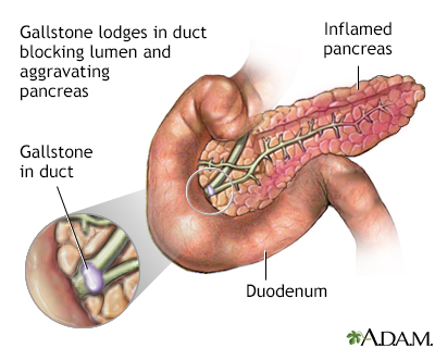 BACK TOTOP Browse A-ZSearchBrowse A-ZABCDEFGHIJKLMNOPQRSTUVWXYZ0-9 E-mail FormEmail ResultsName:Email address:Recipients Name:Recipients address:Message: Print-FriendlyBookmarksbookmarks-menuPancreatitis - dischargeChronic pancreatitis - discharge; Pancreatitis - chronic - discharge; Pancreatic insufficiency - discharge; Acute pancreatitis - dischargeYou were in the hospital because you have pancreatitis. This is a swelling (inflammation) of the pancreas. This article tells you what you need to know to take care of yourself after you go home from the hospital.PancreatitisAcute pancreatitis is sudden swelling and inflammation of the pancreas.ImageRead Article Now Book Mark Article When You're in the HospitalDuring your stay in the hospital, you may have had blood tests and imaging exams, such as a CT scan or ultrasound. You may have been given medicines to help your pain or to fight and prevent infections. You may have been given fluids through an intravenous (IV) tube in your vein and nutrition through a feeding tube or IV. You may have had a tube inserted through your nose that helped remove the contents of your stomach.If your pancreatitis was caused by gallstones or a blocked bile or pancreatic duct, you may have had surgery. Your health care provider may also have drained a cyst (collection of fluid) in your pancreas.You may have had a feeding tube to feed your intestine in the hospital which is helpful during most bouts of pancreatitis.Self-careAfter an episode of pain from pancreatitis, you should start off with drinking only clear liquids, such as soup broth or gelatin. You will need to follow this diet until your symptoms get better. Slowly add other foods back to your diet when you are better.Talk with your provider about:Eating a healthy diet that is low in fat, with no more than 30 grams of fat per day Eating foods that are high in protein and carbohydrates, but low in fat. Eat smaller meals, and eat more often. Your provider will help make sure you are getting enough calories to not lose weight. Quitting smoking or using other tobacco products, if you use them. Losing weight, if you are overweight. Always talk to your provider before taking any medicines or herbs.Do not drink any alcohol.If your body can no longer absorb fats that you eat, your provider may ask you to take a medicine called pancreatic enzymes. These will help your body better absorb fats in your food.You will need to take this medicine with every meal and snack. Your provider will tell you how much to take. When you take these enzymes, you may also need to take another medicine to decrease the acid in your stomach. If your pancreas has a lot of damage, you may also develop diabetes. You will be checked for this problem.Managing Your PainAvoiding alcohol, tobacco, and foods that make your symptoms worse is the first step to controlling pain.Use acetaminophen (Tylenol) or nonsteroidal anti-inflammatory drugs, such as ibuprofen (Advil, Motrin), at first to try and control your pain.You will get a prescription for pain medicines. Get it filled when you go home so you have it available. If the pain is getting worse, take your pain medicine to help before the pain becomes very bad.When to Call the DoctorContact your provider if you have:Very bad pain that is not relieved by over-the-counter drugs Problems eating, drinking, or taking your drugs because of nausea or vomiting Problems breathing or a very fast heartbeat Pain with fever, chills, frequent vomiting, or with feeling faint, weak, or tired Weight loss or problems digesting your food Yellow color to your skin and the whites of your eyes (jaundice) Open ReferencesReferencesForsmark CE. Pancreatitis. In: Goldman L, Cooney KA, eds. Goldman-Cecil Medicine. 27th ed. Philadelphia, PA: Elsevier; 2024:chap 130.Tenner S, Vege SS, Sheth SG, et al. American College of Gastroenterology guideline: management of acute pancreatitis. Am J Gastroenterol. 2024;119(3):419-437. PMID: 38857482 pubmed.ncbi.nlm.nih.gov/38857482/.Van Buren G, Fisher WE. Acute and chronic pancreatitis. In: Kellerman RD, Rakel DP, Heidelbaugh JJ, Lee EM, eds. Conn's Current Therapy 2024. Philadelphia, PA: Elsevier; 2024:175-182.Vege SS. Acute pancreatitis. In: Feldman M, Friedman LS, Brandt LJ, eds. Sleisenger and Fordtran's Gastrointestinal and Liver Disease. 11th ed. Philadelphia, PA: Elsevier; 2021:chap 58.AllVideoImagesTogPancreatitis - seriesPresentation Pancreatitis - seriesPresentation Related Information Chronic pancreatitis(Condition)Acute pancreatitis(Condition)Alcohol use disorder(Condition)Bland diet(Self-Care)Gallstones - discharge(Discharge)Clear liquid diet(Self-Care)Full liquid diet(Self-Care)Enteral nutrition - child - managing problems(Self-Care)Gastrostomy feeding tube - bolus(Self-Care)Jejunostomy feeding tube (Self-Care) Review Date: 10/30/2024 Reviewed By: Jenifer K. Lehrer, MD, Gastroenterologist, Philadelphia, PA. Review provided by VeriMed Healthcare Network. Also reviewed by David C. Dugdale, MD, Medical Director, Brenda Conaway, Editorial Director, and the A.D.A.M. Editorial team. The information provided herein should not be used during any medical emergency or for the diagnosis or treatment of any medical condition. A licensed medical professional should be consulted for diagnosis and treatment of any and all medical conditions. Links to other sites are provided for information only -- they do not constitute endorsements of those other sites. No warranty of any kind, either expressed or implied, is made as to the accuracy, reliability, timeliness, or correctness of any translations made by a third-party service of the information provided herein into any other language. © 1997- A.D.A.M., a business unit of Ebix, Inc. Any duplication or distribution of the information contained herein is strictly prohibited. © 1997- All rights reserved. A.D.A.M. content is best viewed in IE9 or above, Firefox and Google Chrome browser.Content is best viewed in IE9 or above, Firefox and Go