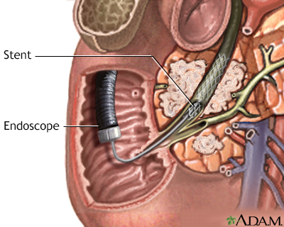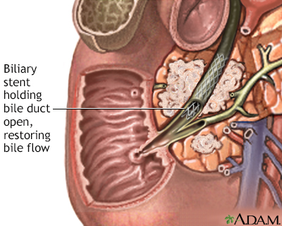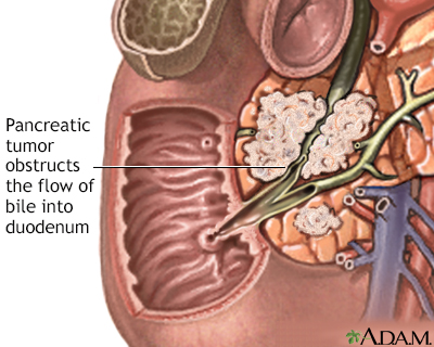 Pancreatic cancerPancreatic cancer; Cancer - pancreasPancreatic cancer is cancer that starts in the pancreas. Causes The pancreas is a large organ behind the stomach. It makes and releases enzymes into the intestines that help the body digest and absorb food, especially fats. The pancreas also makes and releases insulin and glucagon. These are hormones that help the body control blood sugar levels.There are different types of pancreatic cancers. The type depends on the cell in which the cancer develops. Examples include:Adenocarcinoma, the most common type of pancreatic cancer Other more rare types include glucagonoma, insulinoma, islet cell tumor, VIPomaGlucagonomaGlucagonoma is a very rare tumor of islet cells of the pancreas, which leads to an excess of the hormone glucagon in the blood.ImageRead Article Now Book Mark Article InsulinomaAn insulinoma is a tumor in the pancreas that produces too much insulin.ImageRead Article Now Book Mark Article Islet cell tumorPancreatic neuroendocrine tumors (NET) are rare tumors of the pancreas that start from a type of cell called the islet cell.ImageRead Article Now Book Mark Article VIPomaVIPoma is a very rare cancer that usually grows from cells in the pancreas called islet cells.ImageRead Article Now Book Mark Article The exact cause of pancreatic cancer is unknown. It is more common in people who:Are obese Have a diet high in fat and low in fruits and vegetables Have diabetes Have long-term exposure to certain chemicals Have long-term inflammation of the pancreas (chronic pancreatitis) Chronic pancreatitisPancreatitis is swelling of the pancreas. Chronic pancreatitis is present when this problem does not heal or recurs and does not improve, gets worse...ImageRead Article Now Book Mark Article SmokeThe risk for pancreatic cancer increases with age. Family history of the disease also slightly increases the chance of developing this cancer. Symptoms A tumor (cancer) in the pancreas may grow without any symptoms at first. This means the cancer is often advanced when it is first found.Symptoms of pancreatic cancer include:Diarrhea Dark urine and clay-colored stools Fatigue and weakness FatigueFatigue is a feeling of weariness, tiredness, or lack of energy.ImageRead Article Now Book Mark Article Sudden increase in blood sugar level (diabetes) Jaundice (a yellow color in the skin, mucous membranes, or white part of the eyes) and itching of the skin JaundiceJaundice is a yellow color of the skin, mucus membranes, or eyes. The yellow coloring comes from bilirubin, a byproduct of old red blood cells. Jau...ImageRead Article Now Book Mark Article Loss of appetite and weight loss Nausea and vomiting Pain or discomfort in the upper part of the belly or abdomen Exams and Tests Your health care provider will perform a physical exam and ask about your symptoms.Blood tests that may be ordered include:Complete blood count (CBC) CBCA complete blood count (CBC) test measures the following:The number of white blood cells (WBC count)The number of red blood cells (RBC count)The numb...ImageRead Article Now Book Mark Article Liver function tests Liver function testsLiver function tests are common tests that are used to see how well the liver is working. Tests include:AlbuminAlpha-1 antitrypsinAlkaline phosphata...ImageRead Article Now Book Mark Article Serum bilirubinSerum bilirubinThe bilirubin blood test measures the level of bilirubin in the blood. Bilirubin is a yellowish pigment found in bile, a fluid made by the liver. Bi...ImageRead Article Now Book Mark Article Imaging tests that may be ordered include:CT scan of the abdomen CT scan of the abdomenAn abdominal CT scan is an imaging test that uses x-rays to create cross-sectional pictures of the belly area. CT stands for computed tomography....ImageRead Article Now Book Mark Article Endoscopic retrograde cholangiopancreatography (ERCP) ERCPERCP is short for endoscopic retrograde cholangiopancreatography. It is a procedure that looks at the bile and pancreatic ducts. It is done through...ImageRead Article Now Book Mark Article Endoscopic ultrasound Endoscopic ultrasoundEndoscopic ultrasound is a type of imaging test. It is used to see organs in and near the digestive tract.ImageRead Article Now Book Mark Article MRI of the abdomenMRI of the abdomenAn abdominal magnetic resonance imaging scan is an imaging test that uses powerful magnets and radio waves. The waves create pictures of the inside ...ImageRead Article Now Book Mark Article Diagnosis of pancreatic cancer (and what type) is made by a pancreatic biopsy.Pancreatic biopsyA biliary tract biopsy is the removal of small amounts of cells and fluids from the duodenum, bile ducts, pancreas, or pancreatic duct. The sample i...ImageRead Article Now Book Mark Article If tests confirm you have pancreatic cancer, more tests will be done to see how far the cancer has spread within and outside the pancreas. This is called staging. Staging helps guide treatment and gives you an idea of what to expect. Treatment Treatment for adenocarcinoma depends on the stage of the tumor.Surgery may be done if the tumor has not spread or has spread very little. Along with surgery, chemotherapy or radiation therapy or both may be used before or after surgery. A small number of people can be cured with this treatment approach.SurgeryPancreatic surgery is done to treat cancer and other diseases of the pancreas.Read Article Now Book Mark Article ChemotherapyThe term chemotherapy is used to describe cancer-killing drugs. Chemotherapy may be used to:Cure the cancerShrink the cancerPrevent the cancer from ...ImageRead Article Now Book Mark Article Radiation therapyRadiation therapy uses high-powered radiation (such as x-rays or gamma rays), particles, or radioactive seeds to kill cancer cells.ImageRead Article Now Book Mark Article When the tumor has not spread out of the pancreas but cannot be surgically removed, chemotherapy and radiation therapy together may be recommended.When the tumo