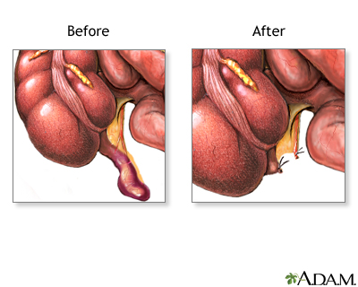 BACK TOTOP Browse A-ZSearchBrowse A-ZABCDEFGHIJKLMNOPQRSTUVWXYZ0-9 E-mail FormEmail ResultsName:Email address:Recipients Name:Recipients address:Message: Print-FriendlyBookmarksbookmarks-menuAppendicitisAppendicitis is a condition in which your appendix gets inflamed. The appendix is a small pouch attached to the end of the large intestine.Related video goes here for no-HTML5 browsers Causes Appendicitis is a very common reason for emergency surgery. The problem most often occurs when the appendix becomes blocked by feces, a foreign object, a tumor or a parasite in rare cases.TumorA tumor is an abnormal growth of body tissue. Tumors can be cancerous (malignant) or noncancerous (benign).Read Article Now Book Mark Article Previous imagePlay SlideshowStop SlideshowNext image / Symptoms The symptoms of appendicitis can vary. It can be hard to detect appendicitis in young children, older people, and women of childbearing age.The first symptom is often pain around the belly button or mid upper abdomen. Pain may be minor at first, but becomes more sharp and severe. You may also have a loss of appetite, nausea, vomiting, and a low-grade fever.The pain tends to move into the right lower part of your belly. The pain tends to focus at a spot directly above the appendix called McBurney point. This most often occurs 12 to 24 hours after the illness starts.McBurney pointAbdominal point tenderness is the localized pain you feel when pressure is placed over a certain part of the belly area (abdomen).ImageRead Article Now Book Mark Article Your pain may be worse when you walk, cough, or make sudden movements. Later symptoms may include:Chills and shaking Diarrhea Fever Hard stools Nausea and vomiting Exams and Tests Your health care provider may suspect appendicitis based on the symptoms you describe. Your provider will do a physical exam. If you have appendicitis, your pain will increase when your lower right belly area is pressed. If your appendix has ruptured, touching the belly area may cause a lot of pain and lead you to tighten your muscles. A rectal exam may find tenderness on the right side of your rectum.A blood test will often show a high white blood cell count. Imaging tests that may help diagnose appendicitis include:CT scan of the abdomen CT scan of the abdomenAn abdominal CT scan is an imaging test that uses x-rays to create cross-sectional pictures of the belly area. CT stands for computed tomography....ImageRead Article Now Book Mark Article Ultrasound of the abdomenUltrasound of the abdomenAbdominal ultrasound is a type of imaging test. It is used to look at organs in the abdomen, including the liver, gallbladder, pancreas, and kidneys...ImageRead Article Now Book Mark Article Treatment Most of the time, a surgeon will remove your appendix as soon as you are diagnosed.Remove your appendixAn appendectomy is surgery to remove the appendix.ImageRead Article Now Book Mark Article Related video goes here for no-HTML5 browsersIf a CT scan shows that you have an abscess, you may be treated with antibiotics first. You will have your appendix removed after the infection and swelling have gone away.AbscessAn abscess is a collection of pus in any part of the body. In most cases, the area around an abscess is swollen and inflamed.ImageRead Article Now Book Mark Article The tests used to diagnose appendicitis are not perfect. As a result, the operation may show that your appendix is normal. In that case, the surgeon will remove your appendix and explore the rest of your abdomen to check for other causes of your pain. Outlook (Prognosis) Most people recover quickly after surgery if the appendix is removed before it ruptures.If your appendix ruptures before surgery, recovery may take longer. You are also more likely to develop problems, such as:An abscess Blockage of the intestine Infection inside the abdomen (peritonitis) Infection of the wound after surgery When to Contact a Medical Professional Contact your provider if you have pain in the lower-right portion of your belly, or other symptoms of appendicitis. PainAbdominal pain is pain that you feel anywhere between your chest and groin. This is often referred to as the stomach region or belly.ImageRead Article Now Book Mark Article Open ReferencesReferencesCarlberg DJ, Himelfarb NT. Acute appendicitis. In: Walls RM, ed. Rosen's Emergency Medicine: Concepts and Clinical Practice. 10th ed. Philadelphia, PA: Elsevier; 2023:chap 79.Expert Panel on Gastrointestinal Imaging:, Garcia EM, Camacho MA, et al. ACR appropriateness criteria right lower quadrant pain-suspected appendicitis. J Am Coll Radiol. 2018;15(11S):S373-S387. PMID: 30392606 pubmed.ncbi.nlm.nih.gov/30392606/.Richmond B. The appendix. In: Townsend CM Jr, Beauchamp RD, Evers BM, Mattox KL, eds. Sabiston Textbook of Surgery. 21st ed. St Louis, MO: Elsevier; 2022:chap 51.Rosenthal MD, Sarosi GS. Appendicitis. In: Feldman M, Friedman LS, Brandt LJ, eds. Sleisenger and Fordtran's Gastrointestinal and Liver Disease. 11th ed. Philadelphia, PA: Elsevier; 2021:chap 120.Sifri CD, Madoff LC. Appendicitis. In: Bennett JE, Dolin R, Blaser MJ, eds. Mandell, Douglas, and Bennett's Principles and Practice of Infectious Diseases. 9th ed. Philadelphia, PA: Elsevier; 2020:chap 78.AllVideoImagesTogAnatomical landmarks adult - front - illustration There are three body views (front, back, and side) that can help you to identify a specific body area. The labels show areas of the body which are identified either by anatomical or by common names. For example, the back of the knee is called the “popliteal fossa,” while the “flank” is an area on the side of the body.Anatomical landmarks adult - frontillustrationDigestive system - illustration The esophagus, stomach, large and small intestine, aided by the liver, gallbladder and pancreas convert the nutritive components of food into energy and break down the non-nutritive components into waste to be excreted.Digestive systemillustrationAppendectomy - seriesPrese
