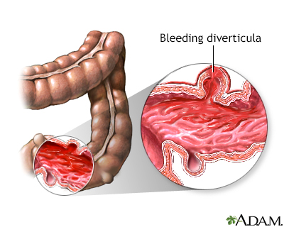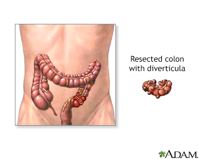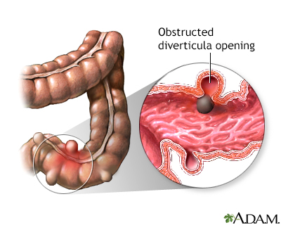 BACK TOTOP Browse A-ZSearchBrowse A-ZABCDEFGHIJKLMNOPQRSTUVWXYZ0-9 E-mail FormEmail ResultsName:Email address:Recipients Name:Recipients address:Message: Print-FriendlyBookmarksbookmarks-menuDiverticulitisDiverticula are small, bulging sacs or pouches that form on the inner wall of the intestine. Diverticulitis occurs when these pouches become inflamed or infected. Most often, these pouches are in the lower part of the large intestine (colon). Causes The formation of pouches or sacs on the intestinal lining is called diverticulosis. It is found in more than half of Americans over age 60. However, no one knows exactly what causes the pouches to form.Eating a low-fiber diet mostly made up of processed foods may be a cause. Constipation and hard stools are more likely when you do not eat enough fiber. Straining to pass stools increases the pressure in the colon or intestines, which may lead to the formation of these pouches.In some cases, one of the pouches can become inflamed and a small tear develops in the lining of the intestine. This can lead to an infection at the site. When this occurs, the condition is called diverticulitis. The cause of diverticulitis is not known. Symptoms People with diverticulosis often have no symptoms, but they may have bloating and cramping in the lower part of the belly. Rarely, they may notice blood in their stool or on toilet paper.DiverticulosisDiverticulosis occurs when small, bulging sacs or pouches form on the inner wall of the intestine. These sacs are called diverticula. Most often, t...ImageRead Article Now Book Mark Article Symptoms of diverticulitis are more severe and often start suddenly, but they may become worse over a few days. They include:Pain or discomfort, usually in the left lower part of the abdomen Bloating or gas Fever and chills Nausea and vomiting Not feeling hungry and not eating Exams and Tests Your health care provider will examine you. This may show tenderness in the abdomen, especially in its left lower part. You may need blood tests to see if you have an infection.Other tests that help diagnose diverticulitis may include:CT scan CT scanAn abdominal CT scan is an imaging test that uses x-rays to create cross-sectional pictures of the belly area. CT stands for computed tomography....ImageRead Article Now Book Mark Article Ultrasound of the abdomen Ultrasound of the abdomenAbdominal ultrasound is a type of imaging test. It is used to look at organs in the abdomen, including the liver, gallbladder, pancreas, and kidneys...ImageRead Article Now Book Mark Article X-rays of the abdomen Treatment The treatment of diverticulitis depends on how serious the symptoms are. Some people may need to be in the hospital, but often, the problem can be treated at home.To help with the pain, your provider may suggest that you:Rest in bed and use a heating pad on your belly. Take pain medicines (ask your provider which ones you should use). Drink only fluids for a day or two, and then slowly begin drinking thicker liquids and then eating foods. The provider may treat you with antibiotics.After you are better, your provider may suggest that you add more fiber to your diet. Eating more fiber can help prevent future attacks. If you have bloating or gas, reduce the amount of fiber you eat for a few days.Once these pouches have formed, you will have them for life. Diverticulitis can return, but some providers think a high-fiber diet may lessen your chances of a recurrence.High-fiber dietFiber is a substance found in plants. Dietary fiber, the kind you eat, is found in fruits, vegetables, and grains. Your body cannot digest fiber, s...ImageRead Article Now Book Mark Article Outlook (Prognosis) Most often, this is a mild condition that responds well to treatment. Some people will have more than one attack of diverticulitis. Surgery may be needed in some cases. Many times, providers will recommend that you have a colonoscopy after diverticulitis has healed. This can help to rule out other conditions that could mimic diverticulitis symptoms.ColonoscopyA colonoscopy is an exam that views the inside of the colon (large intestine) and rectum, using a tool called a colonoscope. The colonoscope has a sm...ImageRead Article Now Book Mark Article Possible Complications More serious problems that may develop are:Abnormal connections that form between parts of the colon or between the colon and another part of the body (fistula) Hole or tear in the colon (perforation) Narrowed area in the colon (stricture) Pocket filled with pus or infection (abscess) Bleeding from the diverticula When to Contact a Medical Professional Contact your provider if symptoms of diverticulitis occur.Also call if you have diverticulitis and you have:Blood in your stools Fever above 100.4°F (38°C) that does not go away Nausea, vomiting, or chills Sudden belly or back pain that gets worse or is very severe Open ReferencesReferencesBhuket TP, Stollman NH. Diverticular disease of the colon. In: Feldman M, Friedman LS, Brandt LJ, eds. Sleisenger and Fordtran's Gastrointestinal and Liver Disease. 11th ed. Philadelphia, PA: Elsevier; 2021:chap 121.Kuemmerle JF. Inflammatory and anatomic diseases of the intestine, peritoneum, mesentery, and omentum. In: Goldman L, Cooney KA, eds. Goldman-Cecil Medicine. 27th ed. Philadelphia, PA: Elsevier; 2024:chap 128.AllVideoImagesTogDiverticulitis - illustration In most patients with diverticulosis, the diverticula do not cause any problems or symptoms. In some cases, a small, hard piece of stool is trapped in the opening of the diverticula, which then become inflamed. When this occurs, the condition is called diverticulitis. A small tear may develop in the lining of the intestine inside the diverticula, which can lead to an infection at the site and sometimes death of the segment of colon containing the diverticula.DiverticulitisillustrationDiverticula - illustration Diverticulosis occurs when small bulging sacs or pouches, called diverticula, form on the in