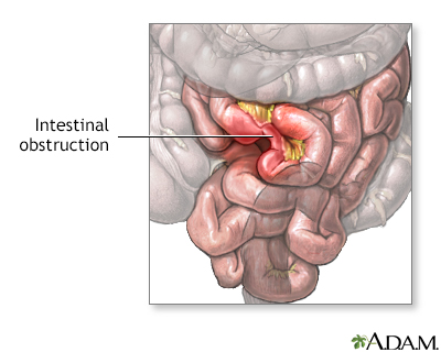 Intestinal obstruction and IleusParalytic ileus; Intestinal volvulus; Bowel obstruction; Ileus; Pseudo-obstruction - intestinal; Colonic ileus; Small bowel obstruction Intestinal obstruction is a partial or complete blockage of the bowel. The contents of the intestine cannot pass through it. Causes Obstruction of the bowel may be due to: A mechanical cause, which means something is partially of fully blocking the bowel Ileus, a condition in which the bowel does not work correctly, but there is no structural problem causing the obstructionParalytic ileus, also called pseudo-obstruction, is one of the major causes of intestinal obstruction in infants and children. Causes of paralytic ileus may include:Bacteria or viruses that cause intestinal infections (gastroenteritis) GastroenteritisBacterial gastroenteritis occurs when there is a bacterial infection of your stomach or intestines.ImageRead Article Now Book Mark Article Chemical, electrolyte, or mineral imbalances (such as decreased blood potassium level) Abdominal surgery Decreased blood supply to the intestines Decreased blood supply to the intestineMesenteric artery ischemia occurs when there is a narrowing or blockage of one or more of the three major arteries that supply the small and large in...ImageRead Article Now Book Mark Article Infections inside the abdomen, such as appendicitis Kidney or lung disease Use of certain medicines, especially narcotics Mechanical causes of intestinal obstruction may include:Adhesions or scar tissue that form after surgery AdhesionsAdhesions are bands of scar-like tissue that form between two surfaces inside the body and cause them to stick together.ImageRead Article Now Book Mark Article Foreign bodies (objects that are swallowed and block the intestines) Gallstones (rare) GallstonesGallstones are hard deposits that form inside the gallbladder. These may be as small as a grain of sand or as large as a golf ball.ImageRead Article Now Book Mark Article Hernias HerniasA hernia is a sac formed by the lining of the abdominal cavity (peritoneum). The sac comes through a hole or weak area in the strong layer of the be...ImageRead Article Now Book Mark Article Impacted stool Impacted stoolA fecal impaction is a large lump of dry, hard stool that stays stuck in the rectum. It is most often seen in people who are constipated for a long ...ImageRead Article Now Book Mark Article Intussusception (telescoping of one segment of bowel into another) IntussusceptionIntussusception is the sliding of one part of the intestine into another. This article focuses on intussusception in children.ImageRead Article Now Book Mark Article Tumors blocking the intestines TumorsA tumor is an abnormal growth of body tissue. Tumors can be cancerous (malignant) or noncancerous (benign).Read Article Now Book Mark Article Volvulus (twisted intestine) Inflammatory diseases such as Crohn disease Symptoms Symptoms may include:Abdominal swelling (distention) Abdominal fullness, gas Abdominal fullness, gasGas is air in the intestine that is passed through the rectum. Air that moves from the digestive tract through the mouth is called belching. Gas is ...ImageRead Article Now Book Mark Article Abdominal pain and cramping Abdominal painAbdominal pain is pain that you feel anywhere between your chest and groin. This is often referred to as the stomach region or belly.ImageRead Article Now Book Mark Article Breath odor Breath odorBreath odor is the scent of the air you breathe out of your mouth. Unpleasant breath odor is commonly called bad breath.ImageRead Article Now Book Mark Article Constipation ConstipationConstipation in infants and children means they have hard stools or have problems passing stools. A child may have pain while passing stools or may ...ImageRead Article Now Book Mark Article Diarrhea DiarrheaDiarrhea is when you pass loose or watery stool.ImageRead Article Now Book Mark Article Inability to pass gas Nausea and vomitingVomitingNausea is feeling an urge to vomit. It is often called "being sick to your stomach. "Vomiting or throwing-up forces the contents of the stomach up t...ImageRead Article Now Book Mark Article Exams and Tests During a physical exam, the health care provider may find bloating, tenderness, or hernias in the abdomen. HerniasA hernia is a sac formed by the lining of the abdominal cavity (peritoneum). The sac comes through a hole or weak area in the strong layer of the be...ImageRead Article Now Book Mark Article Tests that show obstruction include:Abdominal CT scan CT scanA computed tomography (CT) scan is an imaging method that uses x-rays to create pictures of cross-sections of the body. Related tests include:Abdomin...ImageRead Article Now Book Mark Article Abdominal x-ray Barium enema Barium enemaA barium enema is a special x-ray of the large intestine, which includes the colon and rectum.ImageRead Article Now Book Mark Article Upper GI and small bowel seriesUpper GI and small bowel seriesAn upper GI and small bowel series is a set of x-rays taken to examine the esophagus, stomach, and small intestine. Barium enema is a different test ...ImageRead Article Now Book Mark Article Treatment Treatment involves placing a tube through the nose into the stomach or intestine. This is to help relieve abdominal swelling (distention) and vomiting. Volvulus of the large bowel may be treated by passing a tube into the rectum.Surgery may be needed to relieve the obstruction if the tube does not relieve the symptoms. It may also be needed if there are signs of tissue death. If a tumor is causing a mechanical obstruction, surgery may be needed. Obstruction from inflammation such as Crohn disease may be treated with surgery, a procedure to dilate the narrow area, or medicine if inflammation is causing a blockage. Outlook (Prognosis) The outcome depends on the cause of the blockage. Most of the time, the cause is successfully treated. Possible Complications Complications may include or may lead to:Electrolyte (blood 