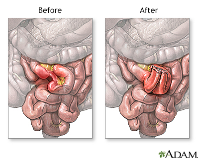 BACK TOTOP Browse A-ZSearchBrowse A-ZABCDEFGHIJKLMNOPQRSTUVWXYZ0-9 E-mail FormEmail ResultsName:Email address:Recipients Name:Recipients address:Message: Print-FriendlyBookmarksbookmarks-menuIntestinal obstruction and IleusParalytic ileus; Intestinal volvulus; Bowel obstruction; Ileus; Pseudo-obstruction - intestinal; Colonic ileus; Small bowel obstruction Intestinal obstruction is a partial or complete blockage of the bowel. The contents of the intestine cannot pass through it. Causes Obstruction of the bowel may be due to: A mechanical cause, which means something is partially of fully blocking the bowel Ileus, a condition in which the bowel does not work correctly, but there is no structural problem causing the obstructionParalytic ileus, also called pseudo-obstruction, is one of the major causes of intestinal obstruction in infants and children. Causes of paralytic ileus may include:Bacteria or viruses that cause intestinal infections (gastroenteritis) GastroenteritisBacterial gastroenteritis occurs when there is a bacterial infection of your stomach or intestines.ImageRead Article Now Book Mark Article Chemical, electrolyte, or mineral imbalances (such as decreased blood potassium level) Abdominal surgery Decreased blood supply to the intestines Decreased blood supply to the intestineMesenteric artery ischemia occurs when there is a narrowing or blockage of one or more of the three major arteries that supply the small and large in...ImageRead Article Now Book Mark Article Infections inside the abdomen, such as appendicitis Kidney or lung disease Use of certain medicines, especially narcotics Mechanical causes of intestinal obstruction may include:Adhesions or scar tissue that form after surgery AdhesionsAdhesions are bands of scar-like tissue that form between two surfaces inside the body and cause them to stick together.ImageRead Article Now Book Mark Article Foreign bodies (objects that are swallowed and block the intestines) Gallstones (rare) GallstonesGallstones are hard deposits that form inside the gallbladder. These may be as small as a grain of sand or as large as a golf ball.ImageRead Article Now Book Mark Article Hernias HerniasA hernia is a sac formed by the lining of the abdominal cavity (peritoneum). The sac comes through a hole or weak area in the strong layer of the be...ImageRead Article Now Book Mark Article Impacted stool Impacted stoolA fecal impaction is a large lump of dry, hard stool that stays stuck in the rectum. It is most often seen in people who are constipated for a long ...ImageRead Article Now Book Mark Article Intussusception (telescoping of one segment of bowel into another) IntussusceptionIntussusception is the sliding of one part of the intestine into another. This article focuses on intussusception in children.ImageRead Article Now Book Mark Article Tumors blocking the intestines TumorsA tumor is an abnormal growth of body tissue. Tumors can be cancerous (malignant) or noncancerous (benign).Read Article Now Book Mark Article Volvulus (twisted intestine) Inflammatory diseases such as Crohn disease Symptoms Symptoms may include:Abdominal swelling (distention) Abdominal fullness, gas Abdominal fullness, gasGas is air in the intestine that is passed through the rectum. Air that moves from the digestive tract through the mouth is called belching. Gas is ...ImageRead Article Now Book Mark Article Abdominal pain and cramping Abdominal painAbdominal pain is pain that you feel anywhere between your chest and groin. This is often referred to as the stomach region or belly.ImageRead Article Now Book Mark Article Breath odor Breath odorBreath odor is the scent of the air you breathe out of your mouth. Unpleasant breath odor is commonly called bad breath.ImageRead Article Now Book Mark Article Constipation ConstipationConstipation in infants and children means they have hard stools or have problems passing stools. A child may have pain while passing stools or may ...ImageRead Article Now Book Mark Article Diarrhea DiarrheaDiarrhea is when you pass loose or watery stool.ImageRead Article Now Book Mark Article Inability to pass gas Nausea and vomitingVomitingNausea is feeling an urge to vomit. It is often called "being sick to your stomach. "Vomiting or throwing-up forces the contents of the stomach up t...ImageRead Article Now Book Mark Article Exams and Tests During a physical exam, the health care provider may find bloating, tenderness, or hernias in the abdomen. HerniasA hernia is a sac formed by the lining of the abdominal cavity (peritoneum). The sac comes through a hole or weak area in the strong layer of the be...ImageRead Article Now Book Mark Article Tests that show obstruction include:Abdominal CT scan CT scanA computed tomography (CT) scan is an imaging method that uses x-rays to create pictures of cross-sections of the body. Related tests include:Abdomin...ImageRead Article Now Book Mark Article Abdominal x-ray Barium enema Barium enemaA barium enema is a special x-ray of the large intestine, which includes the colon and rectum.ImageRead Article Now Book Mark Article Upper GI and small bowel seriesUpper GI and small bowel seriesAn upper GI and small bowel series is a set of x-rays taken to examine the esophagus, stomach, and small intestine. Barium enema is a different test ...ImageRead Article Now Book Mark Article Treatment Treatment involves placing a tube through the nose into the stomach or intestine. This is to help relieve abdominal swelling (distention) and vomiting. Volvulus of the large bowel may be treated by passing a tube into the rectum.Surgery may be needed to relieve the obstruction if the tube does not relieve the symptoms. It may also be needed if there are signs of tissue death. If a tumor is causing a mechanical obstruction, surgery may be needed. Obstruction from inflammation such as Crohn disease may be treated with surgery, a procedure to dilate the narrow area, or medicine if inflammation is causing a blockage. Outlook (Progno
