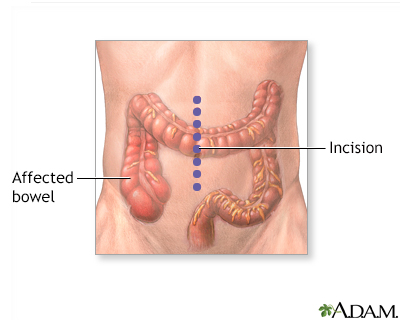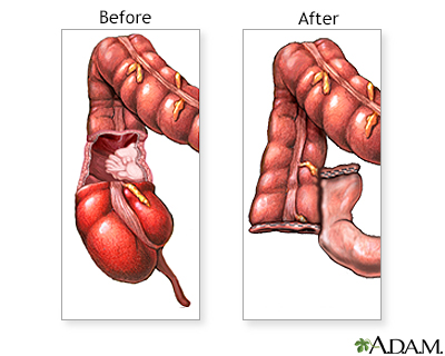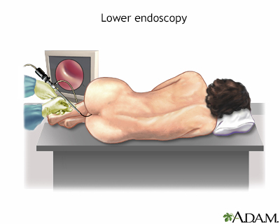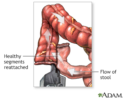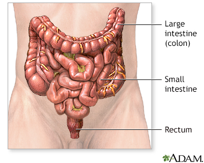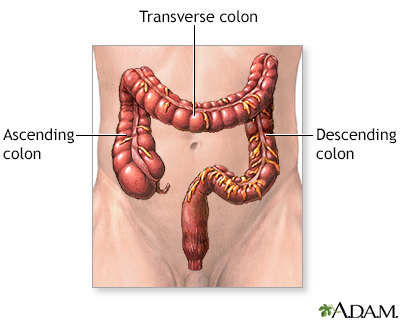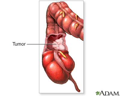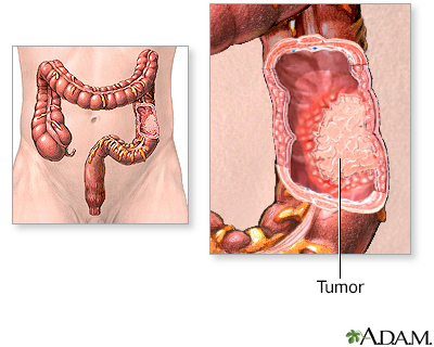 Colorectal cancerColorectal cancer; Cancer - colon; Rectal cancer; Cancer - rectum; Adenocarcinoma - colon; Colon - adenocarcinoma; Colon carcinoma; Colon cancerColorectal cancer is cancer that starts in the large intestine (colon) or the rectum (end of the colon). It is also sometimes simply called colon cancer.In the United States, colorectal cancer is one of the leading causes of deaths due to cancer. Early diagnosis can often lead to a complete cure.Related video goes here for no-HTML5 browsers Causes Nearly all colorectal cancers begin as noncancerous (benign) lumps (polyps) in the lining of the colon and rectum. These can slowly develop into cancer. Noncancerous (benign) lumps (polyps)A colorectal polyp is a growth on the lining of the colon or rectum.ImageRead Article Now Book Mark Article You have a higher risk for colorectal cancer if you:Are age 45 or older Drink alcohol Smoke tobacco Are overweight or have obesity ObesityObesity means weighing more than what is healthy for a given height. Obesity is a serious, chronic disease. It can lead to other health problems, i...ImageRead Article Now Book Mark Article Are African American or of eastern European descent Eat a lot of red or processed meats Eat a low-fiber and high-fat diet Low-fiber and high-fat dietDiet can have an impact on your risk of developing many types of cancer. You can reduce your overall risk by following a healthy diet that includes ...ImageRead Article Now Book Mark Article Have a diet low in fruits and vegetables Have colorectal polyps Have inflammatory bowel disease (Crohn disease or ulcerative colitis) Crohn diseaseCrohn disease is a disease where parts of the digestive tract become inflamed. It most often involves the lower end of the small intestine and the be...ImageRead Article Now Book Mark Article Ulcerative colitisUlcerative colitis is a condition in which the lining of the large intestine (colon) and rectum become inflamed. It is a form of inflammatory bowel ...ImageRead Article Now Book Mark Article Have a family history of colorectal cancerSome inherited diseases also increase the risk of developing colorectal cancer. One of the most common is called Lynch syndrome. Symptoms Many cases of colon cancer have no symptoms. If there are symptoms, the following may indicate colon cancer:Abdominal pain and tenderness in the lower abdomen Abdominal pain and tendernessAbdominal pain is pain that you feel anywhere between your chest and groin. This is often referred to as the stomach region or belly.ImageRead Article Now Book Mark Article Blood in the stool Blood in the stoolBlack or tarry stools with a foul smell are a sign of a problem in the upper digestive tract. It most often indicates that there is bleeding in the ...ImageRead Article Now Book Mark Article Diarrhea, constipation, or other change in bowel habits DiarrheaDiarrhea is when you pass loose or watery stool.ImageRead Article Now Book Mark Article Narrow stools Weight loss with no known reason Weight lossUnexplained weight loss is a decrease in body weight, when you did not try to lose the weight on your own. Many people gain and lose weight. Uninten...Read Article Now Book Mark Article Exams and Tests Through screening tests, colon cancer can be detected before symptoms develop. This is when the cancer is most curable. Abnormal stool screening tests should be followed up with a colonoscopy, which can see the entire colon.Screening tests, colon cancerColon cancer screening can detect polyps and early cancers in the large intestine. This type of screening can find problems that can be treated befo...ImageRead Article Now Book Mark Article Related video goes here for no-HTML5 browsersYour health care provider will perform a physical exam and press on your belly area. The physical exam rarely shows any problems, although your provider may feel a lump (mass) in the abdomen. A rectal exam may reveal a mass in people with rectal cancer, but not colon cancer.Previous imagePlay SlideshowStop SlideshowNext image / Blood tests may be done for those diagnosed with colorectal cancer, including:Complete blood count (CBC) to check for anemia Complete blood countA complete blood count (CBC) test measures the following:The number of white blood cells (WBC count)The number of red blood cells (RBC count)The numb...ImageRead Article Now Book Mark Article Liver function testsLiver function testsLiver function tests are common tests that are used to see how well the liver is working. Tests include:AlbuminAlpha-1 antitrypsinAlkaline phosphata...ImageRead Article Now Book Mark Article If you are diagnosed with colorectal cancer, more tests will be done to see if the cancer has spread. This is called staging. CT or MRI scans of the abdomen, pelvic area, or chest may be used to stage the cancer. Sometimes, PET scans are also used.StagingCancer staging is a way to describe how much cancer is in your body and where it is located. Staging helps determine where the original tumor is, ho...Read Article Now Book Mark Article CTA computed tomography (CT) scan is an imaging method that uses x-rays to create pictures of cross-sections of the body. Related tests include:Abdomin...ImageRead Article Now Book Mark Article MRIA magnetic resonance imaging (MRI) scan is an imaging test that uses powerful magnets and radio waves to create pictures of the body. It does not us...ImageRead Article Now Book Mark Article PETA positron emission tomography (PET) scan is a type of imaging test. It uses a radioactive substance called a tracer to look for disease in the body...Read Article Now Book Mark Article Stages of colorectal cancer are:Stage 0: Cancer is only on the innermost layer of the lining of the intestine Stage I: Cancer is in the inner layers of the colon Stage II: Cancer has spread through the muscle wall of the colon Stage III: Cancer has spread to the lymph nodes near the colon Stage IV: Cancer spread to other organs, such as the liver or lungsBlood tests to detect tumor marke