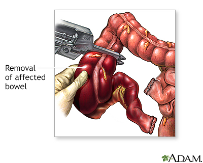 BACK TOTOP Browse A-ZSearchBrowse A-ZABCDEFGHIJKLMNOPQRSTUVWXYZ0-9 E-mail FormEmail ResultsName:Email address:Recipients Name:Recipients address:Message: Print-FriendlyBookmarksbookmarks-menuColorectal cancerColorectal cancer; Cancer - colon; Rectal cancer; Cancer - rectum; Adenocarcinoma - colon; Colon - adenocarcinoma; Colon carcinoma; Colon cancerColorectal cancer is cancer that starts in the large intestine (colon) or the rectum (end of the colon). It is also sometimes simply called colon cancer.In the United States, colorectal cancer is one of the leading causes of deaths due to cancer. Early diagnosis can often lead to a complete cure.Related video goes here for no-HTML5 browsers Causes Nearly all colorectal cancers begin as noncancerous (benign) lumps (polyps) in the lining of the colon and rectum. These can slowly develop into cancer. Noncancerous (benign) lumps (polyps)A colorectal polyp is a growth on the lining of the colon or rectum.ImageRead Article Now Book Mark Article You have a higher risk for colorectal cancer if you:Are age 45 or older Drink alcohol Smoke tobacco Are overweight or have obesity ObesityObesity means weighing more than what is healthy for a given height. Obesity is a serious, chronic disease. It can lead to other health problems, i...ImageRead Article Now Book Mark Article Are African American or of eastern European descent Eat a lot of red or processed meats Eat a low-fiber and high-fat diet Low-fiber and high-fat dietDiet can have an impact on your risk of developing many types of cancer. You can reduce your overall risk by following a healthy diet that includes ...ImageRead Article Now Book Mark Article Have a diet low in fruits and vegetables Have colorectal polyps Have inflammatory bowel disease (Crohn disease or ulcerative colitis) Crohn diseaseCrohn disease is a disease where parts of the digestive tract become inflamed. It most often involves the lower end of the small intestine and the be...ImageRead Article Now Book Mark Article Ulcerative colitisUlcerative colitis is a condition in which the lining of the large intestine (colon) and rectum become inflamed. It is a form of inflammatory bowel ...ImageRead Article Now Book Mark Article Have a family history of colorectal cancerSome inherited diseases also increase the risk of developing colorectal cancer. One of the most common is called Lynch syndrome. Symptoms Many cases of colon cancer have no symptoms. If there are symptoms, the following may indicate colon cancer:Abdominal pain and tenderness in the lower abdomen Abdominal pain and tendernessAbdominal pain is pain that you feel anywhere between your chest and groin. This is often referred to as the stomach region or belly.ImageRead Article Now Book Mark Article Blood in the stool Blood in the stoolBlack or tarry stools with a foul smell are a sign of a problem in the upper digestive tract. It most often indicates that there is bleeding in the ...ImageRead Article Now Book Mark Article Diarrhea, constipation, or other change in bowel habits DiarrheaDiarrhea is when you pass loose or watery stool.ImageRead Article Now Book Mark Article Narrow stools Weight loss with no known reason Weight lossUnexplained weight loss is a decrease in body weight, when you did not try to lose the weight on your own. Many people gain and lose weight. Uninten...Read Article Now Book Mark Article Exams and Tests Through screening tests, colon cancer can be detected before symptoms develop. This is when the cancer is most curable. Abnormal stool screening tests should be followed up with a colonoscopy, which can see the entire colon.Screening tests, colon cancerColon cancer screening can detect polyps and early cancers in the large intestine. This type of screening can find problems that can be treated befo...ImageRead Article Now Book Mark Article Related video goes here for no-HTML5 browsersYour health care provider will perform a physical exam and press on your belly area. The physical exam rarely shows any problems, although your provider may feel a lump (mass) in the abdomen. A rectal exam may reveal a mass in people with rectal cancer, but not colon cancer.Previous imagePlay SlideshowStop SlideshowNext image / Blood tests may be done for those diagnosed with colorectal cancer, including:Complete blood count (CBC) to check for anemia Complete blood countA complete blood count (CBC) test measures the following:The number of white blood cells (WBC count)The number of red blood cells (RBC count)The numb...ImageRead Article Now Book Mark Article Liver function testsLiver function testsLiver function tests are common tests that are used to see how well the liver is working. Tests include:AlbuminAlpha-1 antitrypsinAlkaline phosphata...ImageRead Article Now Book Mark Article If you are diagnosed with colorectal cancer, more tests will be done to see if the cancer has spread. This is called staging. CT or MRI scans of the abdomen, pelvic area, or chest may be used to stage the cancer. Sometimes, PET scans are also used.StagingCancer staging is a way to describe how much cancer is in your body and where it is located. Staging helps determine where the original tumor is, ho...Read Article Now Book Mark Article CTA computed tomography (CT) scan is an imaging method that uses x-rays to create pictures of cross-sections of the body. Related tests include:Abdomin...ImageRead Article Now Book Mark Article MRIA magnetic resonance imaging (MRI) scan is an imaging test that uses powerful magnets and radio waves to create pictures of the body. It does not us...ImageRead Article Now Book Mark Article PETA positron emission tomography (PET) scan is a type of imaging test. It uses a radioactive substance called a tracer to look for disease in the body...Read Article Now Book Mark Article Stages of colorectal cancer are:Stage 0: Cancer is only on the innermost layer of the lining of the intestine Stage I: Cancer is in the inner layers of the colon Stage II: Cancer has spread through t