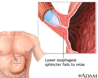 AchalasiaEsophageal achalasia; Swallowing problems for liquids and solids; Cardiospasm - lower esophageal sphincter spasmThe tube that carries food from the mouth to the stomach is the esophagus or food pipe. Achalasia makes it harder for the esophagus to move food into the stomach. Causes There is a muscular ring at the point where the esophagus and stomach meet. It is called the lower esophageal sphincter (LES). Normally, this muscle relaxes when you swallow to allow food to pass into the stomach. In people with achalasia, it does not relax as it should. In addition, the normal muscle activity of the esophagus (peristalsis) is reduced or absent.This problem is caused by damage to the nerves of the esophagus.Other problems can cause similar symptoms, such as cancer of the esophagus or upper stomach, and a parasite infection that causes Chagas disease, which is more common in Mexico and Central and South America.Chagas diseaseChagas disease is an illness caused by tiny parasites and spread by insects. The disease is common in South and Central America.ImageRead Article Now Book Mark Article Achalasia is rare. It may occur at any age, but is most common in people ages 25 to 60. In some people, the problem may be inherited. Symptoms Symptoms include:Backflow (regurgitation) of food Chest pain, which may increase after eating, or may be felt as pain in the back, neck, and arms Chest painChest pain is discomfort or pain that you feel anywhere along the front of your body between your neck and upper abdomen.ImageRead Article Now Book Mark Article Cough Difficulty swallowing liquids and solids Heartburn HeartburnHeartburn is a painful burning feeling just below or behind the breastbone. Most of the time, it comes from the esophagus. The pain often rises in ...ImageRead Article Now Book Mark Article Unintentional weight loss Exams and Tests Physical exam may show signs of anemia or malnutrition.AnemiaAnemia is a condition in which the body does not have enough healthy red blood cells. Red blood cells provide oxygen to body tissues. Different type...ImageRead Article Now Book Mark Article MalnutritionMalnutrition is the condition that occurs when your body does not get enough nutrients.ImageRead Article Now Book Mark Article Tests include:Esophageal manometry, a test to measure if your esophagus is working properly. Esophageal manometryEsophageal manometry is a test to measure how well the esophagus is working.ImageRead Article Now Book Mark Article Functional luminal imaging probe (FLIP). Creates a high resolution 3D image of your esophagus and its movements. EGD or upper endoscopy, a test to examine the lining of the stomach and esophagus. It uses a flexible tube and camera. EGDEsophagogastroduodenoscopy (EGD) is a test to examine the lining of the esophagus, stomach, and first part of the small intestine (the duodenum)....ImageRead Article Now Book Mark Article Upper GI x-ray.Upper GI x-rayAn upper GI and small bowel series is a set of x-rays taken to examine the esophagus, stomach, and small intestine. Barium enema is a different test ...ImageRead Article Now Book Mark Article Treatment The goal of treatment is to reduce the pressure at the sphincter muscle and allow food and liquids to pass easily into the stomach. Therapy may involve:Injection with botulinum toxin (Botox) -- This may help relax the sphincter muscles. However, the benefit wears off within a few weeks or months. Medicines, such as long-acting nitrates or calcium channel blockers -- These medicines can be used to relax the lower esophagus sphincter. But there is rarely a long-term solution with medicines to treat achalasia. Surgery (called a myotomy) -- In this procedure, the lower sphincter muscle is cut. This procedure is usually performed using a laparoscope. It can now sometimes be performed during EGD instead of traditional surgery. Widening (dilation) of the esophagus -- This is done during EGD by stretching the LES with a balloon dilator.Your health care provider can help you decide which treatment is best for you. Outlook (Prognosis) The outcomes of surgery and non-surgical treatments are similar. However, depending on the type of achalasia you have, your provider may recommend a particular procedure. More than one treatment is sometimes necessary. Possible Complications Complications may include:Backflow (regurgitation) of acid or food from the stomach into the esophagus (reflux) Breathing food contents into the lungs (aspiration), which can cause pneumonia Tearing (perforation) of the esophagus When to Contact a Medical Professional Contact your provider if:You have trouble swallowing or painful swallowing Your symptoms continue, even with treatment for achalasia Prevention Many of the causes of achalasia cannot be prevented. However, treatment may help to prevent complications.Open ReferencesReferencesBok-yan So J. The management of achalasia and other motility disorders of the oesophagus. In: Lamb PJ, ed. Oesophagogastric Surgery: A Companion to Specialist Surgical Practice. 7th ed. Philadelphia, PA: Elsevier; 2024:chap 14.Falk GW, Katzka DA. Diseases of the esophagus. In: Goldman L, Cooney KA, eds. Goldman-Cecil Medicine. 27th ed. Philadelphia, PA: Elsevier; 2024:chap 124.Pandolfino JE, Kahrilas PJ. Esophageal neuromuscular function and motility disorders. In: Feldman M, Friedman LS, Brandt LJ, eds. Sleisenger and Fordtran's Gastrointestinal and Liver Disease. 11th ed. Philadelphia, PA: Elsevier; 2021:chap 44.