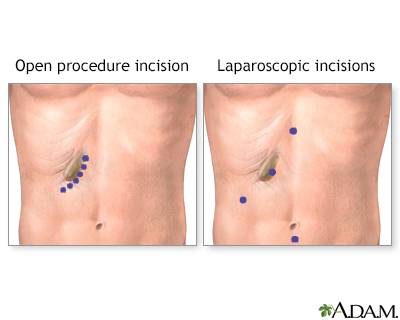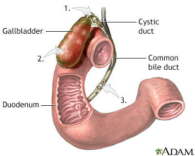 GallstonesCholelithiasis; Gallbladder attack; Biliary colic; Gallstone attack; Biliary calculus: gallstones chenodeoxycholic acids (CDCA); Ursodeoxycholic acid (UDCA, ursodiol); Endoscopic retrograde cholangiopancreatography (ERCP) - gallstonesGallstones are hard deposits that form inside the gallbladder. These may be as small as a grain of sand or as large as a golf ball.Related video goes here for no-HTML5 browsers Causes The cause of gallstones varies. There are two main types of gallstones:Stones made of cholesterol -- This is the most common type. Cholesterol gallstones are not related to the cholesterol level in the blood. In most cases, they are not visible on CT scans but are visible on a sonogram (ultrasound) of the abdomen. Stones made of bilirubin -- These are called pigment stones. They occur when there is too much bilirubin in the bile, often due to too many red blood cells being destroyed.Previous imagePlay SlideshowStop SlideshowNext image / Gallstones are more common in:Female sex Native Americans and people of Hispanic descent People over age 40 People who are overweight People with a family history of gallstonesThe following factors also make you more likely to develop gallstones:Biliary tract infections (pigmented stones) Bone marrow or solid organ transplant Bone marrowA bone marrow transplant is a procedure to replace damaged or diseased bone marrow with healthy bone marrow stem cells. Bone marrow is the soft, fatt...ImageRead Article Now Book Mark Article Diabetes DiabetesDiabetes is a long-term (chronic) disease in which the body cannot regulate the amount of sugar in the blood.ImageRead Article Now Book Mark Article Failure of the gallbladder to empty bile properly (this is more likely to happen during pregnancy) Liver cirrhosis (pigmented stones) Liver cirrhosisCirrhosis is scarring of the liver and poor liver function. It is the last stage of chronic liver disease.ImageRead Article Now Book Mark Article Medical conditions that cause too many red blood cells to be destroyed Red blood cells to be destroyedAnemia is a condition in which the body does not have enough healthy red blood cells. Red blood cells provide oxygen to body tissues. Normally, red ...ImageRead Article Now Book Mark Article Rapid weight loss from eating a very low-calorie diet, or after weight loss surgery Receiving nutrition through a vein for a long period of time (intravenous feedings) Taking birth control pills Symptoms Many people with gallstones do not have any symptoms. These are often found during a routine x-ray, abdominal surgery, or other medical procedure.However, if a large stone blocks a tube or duct that drains the gallbladder, you may have a cramping pain in the middle to right upper abdomen. This is called biliary colic. The pain goes away if the stone passes into the first part of the small intestine.Stone blocks a tubeCholedocholithiasis means there is at least one gallstone in the common bile duct. The stone may be made up of bile pigments or calcium and choleste...ImageRead Article Now Book Mark Article Symptoms that may occur include:Pain in the right upper or middle upper abdomen for at least 30 minutes. The pain may be constant or cramping. It can feel sharp or dull. Fever. Yellowing of skin and whites of the eyes (jaundice).Other symptoms may include:Clay-colored stools Nausea and vomiting Related video goes here for no-HTML5 browsers Exams and Tests Tests used to detect gallstones or gallbladder inflammation include:Ultrasound, abdomen Ultrasound, abdomenAbdominal ultrasound is a type of imaging test. It is used to look at organs in the abdomen, including the liver, gallbladder, pancreas, and kidneys...ImageRead Article Now Book Mark Article CT scan, abdomen CT scan, abdomenAn abdominal CT scan is an imaging test that uses x-rays to create cross-sectional pictures of the belly area. CT stands for computed tomography....ImageRead Article Now Book Mark Article Endoscopic retrograde cholangiopancreatography (ERCP) Gallbladder radionuclide scan Gallbladder radionuclide scanGallbladder radionuclide scan is a test that uses radioactive material to check gallbladder function. It is also used to look for bile duct blockage...ImageRead Article Now Book Mark Article Endoscopic ultrasound Endoscopic ultrasoundEndoscopic ultrasound is a type of imaging test. It is used to see organs in and near the digestive tract.ImageRead Article Now Book Mark Article Magnetic resonance cholangiopancreatography (MRCP) Percutaneous transhepatic cholangiogram (PTCA) Percutaneous transhepatic cholangiogramA percutaneous transhepatic cholangiogram (PTC) is an x-ray of the bile ducts. These are the tubes that carry bile from the liver to the gallbladder...ImageRead Article Now Book Mark Article Your health care provider may order the following blood tests:Bilirubin BilirubinThe bilirubin blood test measures the level of bilirubin in the blood. Bilirubin is a yellowish pigment found in bile, a fluid made by the liver. Bi...ImageRead Article Now Book Mark Article Liver function tests Liver function testsLiver function tests are common tests that are used to see how well the liver is working. Tests include:AlbuminAlpha-1 antitrypsinAlkaline phosphata...ImageRead Article Now Book Mark Article Complete blood count Complete blood countA complete blood count (CBC) test measures the following:The number of white blood cells (WBC count)The number of red blood cells (RBC count)The numb...ImageRead Article Now Book Mark Article Pancreatic enzyme (amylase or lipase)AmylaseAmylase is an enzyme that helps digest carbohydrates. It is made primarily in the pancreas and the glands that make saliva, and can be found at low ...ImageRead Article Now Book Mark Article LipaseLipase is a protein (enzyme) released by the pancreas into the small intestine. It helps the body absorb fat. This test is used to measure the amou...ImageRead Article Now Book Mark Article Treatment SURGERYMost of the time, surgery is not needed unles