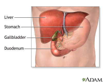 BACK TOTOP Browse A-ZSearchBrowse A-ZABCDEFGHIJKLMNOPQRSTUVWXYZ0-9 E-mail FormEmail ResultsName:Email address:Recipients Name:Recipients address:Message: Print-FriendlyBookmarksbookmarks-menuGallstonesCholelithiasis; Gallbladder attack; Biliary colic; Gallstone attack; Biliary calculus: gallstones chenodeoxycholic acids (CDCA); Ursodeoxycholic acid (UDCA, ursodiol); Endoscopic retrograde cholangiopancreatography (ERCP) - gallstonesGallstones are hard deposits that form inside the gallbladder. These may be as small as a grain of sand or as large as a golf ball.Related video goes here for no-HTML5 browsers Causes The cause of gallstones varies. There are two main types of gallstones:Stones made of cholesterol -- This is the most common type. Cholesterol gallstones are not related to the cholesterol level in the blood. In most cases, they are not visible on CT scans but are visible on a sonogram (ultrasound) of the abdomen. Stones made of bilirubin -- These are called pigment stones. They occur when there is too much bilirubin in the bile, often due to too many red blood cells being destroyed.Previous imagePlay SlideshowStop SlideshowNext image / Gallstones are more common in:Female sex Native Americans and people of Hispanic descent People over age 40 People who are overweight People with a family history of gallstonesThe following factors also make you more likely to develop gallstones:Biliary tract infections (pigmented stones) Bone marrow or solid organ transplant Bone marrowA bone marrow transplant is a procedure to replace damaged or diseased bone marrow with healthy bone marrow stem cells. Bone marrow is the soft, fatt...ImageRead Article Now Book Mark Article Diabetes DiabetesDiabetes is a long-term (chronic) disease in which the body cannot regulate the amount of sugar in the blood.ImageRead Article Now Book Mark Article Failure of the gallbladder to empty bile properly (this is more likely to happen during pregnancy) Liver cirrhosis (pigmented stones) Liver cirrhosisCirrhosis is scarring of the liver and poor liver function. It is the last stage of chronic liver disease.ImageRead Article Now Book Mark Article Medical conditions that cause too many red blood cells to be destroyed Red blood cells to be destroyedAnemia is a condition in which the body does not have enough healthy red blood cells. Red blood cells provide oxygen to body tissues. Normally, red ...ImageRead Article Now Book Mark Article Rapid weight loss from eating a very low-calorie diet, or after weight loss surgery Receiving nutrition through a vein for a long period of time (intravenous feedings) Taking birth control pills Symptoms Many people with gallstones do not have any symptoms. These are often found during a routine x-ray, abdominal surgery, or other medical procedure.However, if a large stone blocks a tube or duct that drains the gallbladder, you may have a cramping pain in the middle to right upper abdomen. This is called biliary colic. The pain goes away if the stone passes into the first part of the small intestine.Stone blocks a tubeCholedocholithiasis means there is at least one gallstone in the common bile duct. The stone may be made up of bile pigments or calcium and choleste...ImageRead Article Now Book Mark Article Symptoms that may occur include:Pain in the right upper or middle upper abdomen for at least 30 minutes. The pain may be constant or cramping. It can feel sharp or dull. Fever. Yellowing of skin and whites of the eyes (jaundice).Other symptoms may include:Clay-colored stools Nausea and vomiting Related video goes here for no-HTML5 browsers Exams and Tests Tests used to detect gallstones or gallbladder inflammation include:Ultrasound, abdomen Ultrasound, abdomenAbdominal ultrasound is a type of imaging test. It is used to look at organs in the abdomen, including the liver, gallbladder, pancreas, and kidneys...ImageRead Article Now Book Mark Article CT scan, abdomen CT scan, abdomenAn abdominal CT scan is an imaging test that uses x-rays to create cross-sectional pictures of the belly area. CT stands for computed tomography....ImageRead Article Now Book Mark Article Endoscopic retrograde cholangiopancreatography (ERCP) Gallbladder radionuclide scan Gallbladder radionuclide scanGallbladder radionuclide scan is a test that uses radioactive material to check gallbladder function. It is also used to look for bile duct blockage...ImageRead Article Now Book Mark Article Endoscopic ultrasound Endoscopic ultrasoundEndoscopic ultrasound is a type of imaging test. It is used to see organs in and near the digestive tract.ImageRead Article Now Book Mark Article Magnetic resonance cholangiopancreatography (MRCP) Percutaneous transhepatic cholangiogram (PTCA) Percutaneous transhepatic cholangiogramA percutaneous transhepatic cholangiogram (PTC) is an x-ray of the bile ducts. These are the tubes that carry bile from the liver to the gallbladder...ImageRead Article Now Book Mark Article Your health care provider may order the following blood tests:Bilirubin BilirubinThe bilirubin blood test measures the level of bilirubin in the blood. Bilirubin is a yellowish pigment found in bile, a fluid made by the liver. Bi...ImageRead Article Now Book Mark Article Liver function tests Liver function testsLiver function tests are common tests that are used to see how well the liver is working. Tests include:AlbuminAlpha-1 antitrypsinAlkaline phosphata...ImageRead Article Now Book Mark Article Complete blood count Complete blood countA complete blood count (CBC) test measures the following:The number of white blood cells (WBC count)The number of red blood cells (RBC count)The numb...ImageRead Article Now Book Mark Article Pancreatic enzyme (amylase or lipase)AmylaseAmylase is an enzyme that helps digest carbohydrates. It is made primarily in the pancreas and the glands that make saliva, and can be found at low ...ImageRead Article Now Book Mark Article LipaseLipase is a protein (enzyme) released by the pancreas into th
