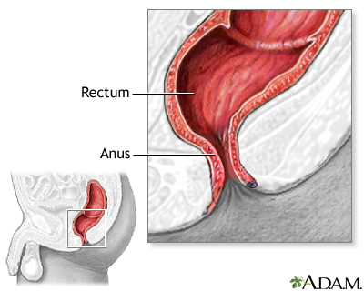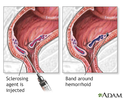 BACK TOTOP Browse A-ZSearchBrowse A-ZABCDEFGHIJKLMNOPQRSTUVWXYZ0-9 E-mail FormEmail ResultsName:Email address:Recipients Name:Recipients address:Message: Print-FriendlyBookmarksbookmarks-menuHemorrhoidsRectal lump; Piles; Lump in the rectum; Rectal bleeding - hemorrhoids; Blood in the stool - hemorrhoidsHemorrhoids are swollen veins in the anus or lower part of the rectum. Causes Hemorrhoids are very common. They result from increased pressure on the anus. This can occur during pregnancy or childbirth, and due to constipation. The pressure causes the normal anal veins and tissue to swell. This tissue can bleed, often during bowel movements.Hemorrhoids may be caused by:Straining during bowel movements Constipation Sitting for long periods of time, especially on the toilet Certain diseases, such as cirrhosisCirrhosisCirrhosis is scarring of the liver and poor liver function. It is the last stage of chronic liver disease.ImageRead Article Now Book Mark Article Hemorrhoids may be inside or outside the body.Internal hemorrhoids occur just inside the anus, at the beginning of the rectum. When they are large, they may fall outside (prolapse). The most common problem with internal hemorrhoids is bleeding during bowel movements. External hemorrhoids occur outside the anus. They can result in difficulty cleaning the area after a bowel movement. If a blood clot forms in an external hemorrhoid, it can be very painful (thrombosed external hemorrhoid). Symptoms Hemorrhoids are most often not painful, but if a blood clot forms, they can be very painful.Common symptoms include:Painless bright red blood from the rectum Anal itching Anal ache or pain, especially while sitting Pain during bowel movements One or more hard or tender lumps near the anus Exams and Tests Most of the time, a health care provider can diagnose hemorrhoids by simply looking at the rectal area. External hemorrhoids can often be detected this way.Tests that may help diagnose the problem include:Rectal exam Sigmoidoscopy SigmoidoscopySigmoidoscopy using a flexible scope is a procedure used to see inside the sigmoid colon and rectum. The sigmoid colon is the area of the large inte...ImageRead Article Now Book Mark Article AnoscopyAnoscopyAnoscopy is a method to look at the: AnusAnal canalLower rectumImageRead Article Now Book Mark Article Treatment Treatments for hemorrhoids include:Over-the-counter corticosteroid (for example, hydrocortisone) creams to help reduce pain and swelling Hemorrhoid creams with lidocaine or other anesthetic to help reduce pain Stool softeners to help reduce straining and constipationThings you can do to reduce itching include:Apply witch hazel to the area with a cotton swab. Wear cotton underwear. Avoid toilet tissue with perfumes or colors. Use baby wipes instead. Try not to scratch the area. Sitz baths can help you to feel better. Sit in warm water for 10 to 15 minutes.If your hemorrhoids do not get better with home treatments, you may need some type of office treatment to shrink the hemorrhoids.If office treatment is not enough, some type of surgery may be necessary, such as removal of the hemorrhoids (hemorrhoidectomy). These procedures are generally used for people with severe bleeding or prolapse who have not responded to other therapy.HemorrhoidectomyHemorrhoids are swollen veins around the anus. They may be inside the anus (internal hemorrhoids) or outside the anus (external hemorrhoids). Often ...ImageRead Article Now Book Mark Article Possible Complications The blood in the hemorrhoid may form clots. This can cause tissue around it to die. Surgery is sometimes needed to remove hemorrhoids with clots.ClotsBlood clots are clumps that occur when blood hardens from a liquid to a solid. A blood clot that forms inside one of your veins or arteries is calle...ImageRead Article Now Book Mark Article Rarely, severe bleeding may also occur. Iron deficiency anemia can result from long-term blood loss.Iron deficiency anemiaAnemia is a condition in which the body does not have enough healthy red blood cells. Red blood cells provide oxygen to body tissues. There are man...ImageRead Article Now Book Mark Article When to Contact a Medical Professional Contact your provider if:Hemorrhoid symptoms do not improve with home treatment. You have rectal bleeding. Your provider may want to check for other, more serious causes of the bleeding.Get medical help right away if:You lose a lot of blood You are bleeding and feel dizzy, lightheaded, or faint Prevention Constipation, straining during bowel movements, and sitting on the toilet too long raise your risk for hemorrhoids. To prevent constipation and hemorrhoids, you should:Drink plenty of fluids. Eat a high-fiber diet of fruits, vegetables, and whole grains. Consider using fiber supplements. Use stool softeners to prevent straining.Open ReferencesReferencesBass LM, Wershil BK. Anatomy, histology, embryology, and developmental anomalies of the small and large intestine. In: Feldman M, Friedman LS, Brandt LJ, eds. Sleisenger and Fordtran's Gastrointestinal and Liver Disease: Pathophysiology/Diagnosis/Management. 11th ed. Philadelphia, PA: Elsevier; 2021:chap 98.Cameron J. Anorectal. In: Cameron J, ed. Current Surgical Therapy. 14th ed. Philadelphia, PA: Elsevier; 2023:chap 5.Zainea GG, Pfenninger JL. Office treatment of hemorrhoids. In: Fowler GC, ed. Pfenninger and Fowler's Procedures for Primary Care. 4th ed. Philadelphia, PA: Elsevier; 2020:chap 87.AllVideoImagesTogHemorrhoids - illustration The most common causes of hemorrhoids are straining at bowel movements, prolonged sitting and pregnancy. Internal hemorrhoids occur above the anal sphincter, and external hemorrhoids occur below, outside the anal canal.HemorrhoidsillustrationHemorrhoid surgery - seriesPresentation Hemorrhoids - illustration The most common causes of hemorrhoids are straining at bowel movements, prolonged sitting and pregnancy. Internal hemorrhoids occur above the anal sphincter, and external hemorr