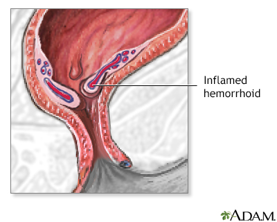 HemorrhoidsRectal lump; Piles; Lump in the rectum; Rectal bleeding - hemorrhoids; Blood in the stool - hemorrhoidsHemorrhoids are swollen veins in the anus or lower part of the rectum. Causes Hemorrhoids are very common. They result from increased pressure on the anus. This can occur during pregnancy or childbirth, and due to constipation. The pressure causes the normal anal veins and tissue to swell. This tissue can bleed, often during bowel movements.Hemorrhoids may be caused by:Straining during bowel movements Constipation Sitting for long periods of time, especially on the toilet Certain diseases, such as cirrhosisCirrhosisCirrhosis is scarring of the liver and poor liver function. It is the last stage of chronic liver disease.ImageRead Article Now Book Mark Article Hemorrhoids may be inside or outside the body.Internal hemorrhoids occur just inside the anus, at the beginning of the rectum. When they are large, they may fall outside (prolapse). The most common problem with internal hemorrhoids is bleeding during bowel movements. External hemorrhoids occur outside the anus. They can result in difficulty cleaning the area after a bowel movement. If a blood clot forms in an external hemorrhoid, it can be very painful (thrombosed external hemorrhoid). Symptoms Hemorrhoids are most often not painful, but if a blood clot forms, they can be very painful.Common symptoms include:Painless bright red blood from the rectum Anal itching Anal ache or pain, especially while sitting Pain during bowel movements One or more hard or tender lumps near the anus Exams and Tests Most of the time, a health care provider can diagnose hemorrhoids by simply looking at the rectal area. External hemorrhoids can often be detected this way.Tests that may help diagnose the problem include:Rectal exam Sigmoidoscopy SigmoidoscopySigmoidoscopy using a flexible scope is a procedure used to see inside the sigmoid colon and rectum. The sigmoid colon is the area of the large inte...ImageRead Article Now Book Mark Article AnoscopyAnoscopyAnoscopy is a method to look at the: AnusAnal canalLower rectumImageRead Article Now Book Mark Article Treatment Treatments for hemorrhoids include:Over-the-counter corticosteroid (for example, hydrocortisone) creams to help reduce pain and swelling Hemorrhoid creams with lidocaine or other anesthetic to help reduce pain Stool softeners to help reduce straining and constipationThings you can do to reduce itching include:Apply witch hazel to the area with a cotton swab. Wear cotton underwear. Avoid toilet tissue with perfumes or colors. Use baby wipes instead. Try not to scratch the area. Sitz baths can help you to feel better. Sit in warm water for 10 to 15 minutes.If your hemorrhoids do not get better with home treatments, you may need some type of office treatment to shrink the hemorrhoids.If office treatment is not enough, some type of surgery may be necessary, such as removal of the hemorrhoids (hemorrhoidectomy). These procedures are generally used for people with severe bleeding or prolapse who have not responded to other therapy.HemorrhoidectomyHemorrhoids are swollen veins around the anus. They may be inside the anus (internal hemorrhoids) or outside the anus (external hemorrhoids). Often ...ImageRead Article Now Book Mark Article Possible Complications The blood in the hemorrhoid may form clots. This can cause tissue around it to die. Surgery is sometimes needed to remove hemorrhoids with clots.ClotsBlood clots are clumps that occur when blood hardens from a liquid to a solid. A blood clot that forms inside one of your veins or arteries is calle...ImageRead Article Now Book Mark Article Rarely, severe bleeding may also occur. Iron deficiency anemia can result from long-term blood loss.Iron deficiency anemiaAnemia is a condition in which the body does not have enough healthy red blood cells. Red blood cells provide oxygen to body tissues. There are man...ImageRead Article Now Book Mark Article When to Contact a Medical Professional Contact your provider if:Hemorrhoid symptoms do not improve with home treatment. You have rectal bleeding. Your provider may want to check for other, more serious causes of the bleeding.Get medical help right away if:You lose a lot of blood You are bleeding and feel dizzy, lightheaded, or faint Prevention Constipation, straining during bowel movements, and sitting on the toilet too long raise your risk for hemorrhoids. To prevent constipation and hemorrhoids, you should:Drink plenty of fluids. Eat a high-fiber diet of fruits, vegetables, and whole grains. Consider using fiber supplements. Use stool softeners to prevent straining.Open ReferencesReferencesBass LM, Wershil BK. Anatomy, histology, embryology, and developmental anomalies of the small and large intestine. In: Feldman M, Friedman LS, Brandt LJ, eds. Sleisenger and Fordtran's Gastrointestinal and Liver Disease: Pathophysiology/Diagnosis/Management. 11th ed. Philadelphia, PA: Elsevier; 2021:chap 98.Cameron J. Anorectal. In: Cameron J, ed. Current Surgical Therapy. 14th ed. Philadelphia, PA: Elsevier; 2023:chap 5.Zainea GG, Pfenninger JL. Office treatment of hemorrhoids. In: Fowler GC, ed. Pfenninger and Fowler's Procedures for Primary Care. 4th ed. Philadelphia, PA: Elsevier; 2020:chap 87.