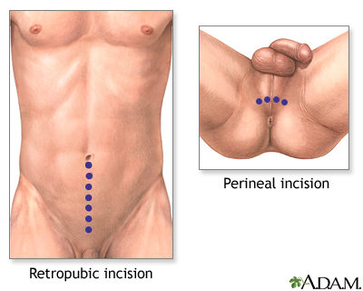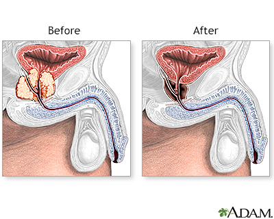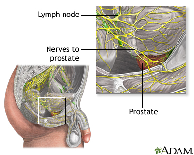 Prostate cancerCancer - prostate; Biopsy - prostate; Prostate biopsy; Gleason scoreProstate cancer is cancer that starts in the prostate gland. The prostate is a small, walnut-shaped structure that makes up part of a man's reproductive system. It wraps around the urethra, the tube that carries urine out of the body.Related video goes here for no-HTML5 browsers Causes Prostate cancer is the most common cause of death from cancer in men over age 75. Prostate cancer is rarely found in men younger than 40.People who are at high risk include:African American men, who are also more likely to develop this cancer at every age Men age 60 years and above Men who have a father or brother with prostate cancer Other people at risk include:Men who have been exposed to Agent Orange Men who eat a diet high in fat, especially animal fat Obese menProstate cancer is less common in people who do not eat meat (vegetarians).A common problem in almost all men as they grow older is an enlarged prostate that affects their urinary function. This is called benign prostatic hyperplasia, or BPH. It does not raise your risk for prostate cancer. But, it can increase your prostate-specific antigen (PSA) blood test result.Enlarged prostateThe prostate is a gland that produces some of the fluid that carries sperm during ejaculation. The prostate gland surrounds the urethra, the tube th...ImageRead Article Now Book Mark Article Prostate-specific antigenProstate-specific antigen (PSA) is a protein produced by prostate cells. The PSA test is done to help screen for and monitor prostate cancer in men....ImageRead Article Now Book Mark Article Related video goes here for no-HTML5 browsersProstate Cancer Myths & Facts QuizAn enlarged prostate probably means you have prostate cancer. A. Myth B. Fact Correct Answer The correct answer is myth. The prostate is a small, walnut-sized gland found next to a man's bladder. It becomes enlarged in almost all men as they age. This is called benign prostatic hyperplasia, or BPH. It does not raise the risk of prostate cancer.Which may be a sign of prostate cancer? A. Straining to urinate B. Slow urinary stream C. Blood in the urine or semen D. Dribbling or leakage of urine E. All of the above Correct Answer The correct answer is all of the above, although these symptoms can also be caused by other prostate problems. Check with your doctor if you notice any changes or difficulties when you urinate. Many prostate cancers are diagnosed before any symptoms are present.A high PSA (prostate specific antigen) level is a sure sign of prostate cancer. A. Myth B. Fact Correct Answer The correct answer is myth. The PSA blood test can help detect prostate cancer, but it's not foolproof. Prostate infections or an enlarged prostate can also cause a rise in PSA. Not all experts agree about the value of using PSA test to screen for prostate cancer. Talk with your doctor about whether you should have a PSA test.Which can raise your prostate cancer risk? A. Heavy alcohol use B. Diet high in animal fats C. Family history of prostate cancer D. African-American heritage E. All of the above Correct Answer The correct answer is all of the above. Let your doctor know if you have any of these risk factors. Men with a family history of prostate cancer (especially a brother or father) and African-American men should consider yearly screenings starting around age 40 to 45.Men younger than 40 rarely develop prostate cancer. A. Myth B. Fact Correct Answer The correct answer is fact. Most prostate cancer occurs in men who are older than 60. It's the most common cause of death from cancer in men over age 75. Starting at age 55 (or earlier if you are at higher risk), talk with your doctor about the risks and benefits of prostate cancer screening.A biopsy is the only way tell if you have prostate cancer. A. Myth B. Fact Correct Answer The correct answer is fact. During a biopsy, your doctor will remove some tissue from the prostate to test for cancer. Your doctor may recommend a biopsy if you have a high PSA level, or if a rectal exam shows a large prostate or a hard, uneven surface.When prostate cancer is found early, treatment may involve: A. Surgery to remove the prostate B. Radiation therapy C. Brachytherapy (radioactive seeds) D. Any of the above Correct Answer The correct answer is any of the above. If the cancer has not spread beyond the prostate, treatment options include surgery, radiation therapy, or both. Brachytherapy involves placing tiny radioactive seeds inside the prostate. It's often used to treat small, slow-growing cancer.Prostate cancer thrives on testosterone. A. Myth B. Fact Correct Answer The correct answer is fact. Most prostate tumors need testosterone to grow. In men whose cancer has spread beyond the prostate, hormone therapy may help reduce testosterone levels. This can relieve symptoms and keep the cancer from spreading, but it's not a cure.Prostate cancer should always be treated, no matter your age. A. Myth B. Fact Correct Answer The correct answer is myth. If you are older and have a slow-growing cancer, your doctor may recommend simply monitoring the cancer with PSA tests or biopsies.Prostate cancer treatments may cause impotence. A. Myth B. Fact Correct Answer The correct answer is fact. Possible problems after surgery or radiation therapy include problems controlling urine or bowel movements and erection problems. Medicines used to treat prostate cancer may also cause erection problems.Prostate cancer can never be cured. A. Myth B. Fact Correct Answer The correct answer is myth. Many patients can be cured if their prostate cancer is found before it has spread beyond the prostate gland. Some patients whose cancer has not spread very much outside the prostate gland can also be cured. Even when prostate cancer cannot be cured, many man can live years with the cancer present. Symptoms With early prostate cancer, there are often no symptoms.The PSA blood test may be done to screen men for prost