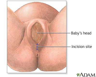 EpisiotomyLabor - episiotomy; Vaginal delivery - episiotomyAn episiotomy is a minor surgery that widens the opening of the vagina during childbirth. It is a cut to the perineum -- the skin and muscles between the vaginal opening and anus.What are the Risks?There are some risks to having an episiotomy. Because of the risks, episiotomies are not as common as they used to be. The risks include: The cut may tear and become larger during the delivery. The tear may reach into the muscle around the rectum, or even into the rectum itself. There may be more blood loss. The cut and the stitches may get infected. Sex may be painful for the first few months after birth. Sometimes, an episiotomy can be helpful even with the risks. Will I Need an Episiotomy?Many women get through childbirth without tearing the tissue around the vagina on their own, and without needing an episiotomy. In fact, recent studies show that not having an episiotomy is best for most women in labor.Episiotomies don't heal better than tears. They often take longer to heal since the cut is often deeper than a natural tear. In both cases, the cut or tear must be stitched and properly cared for after childbirth. At times, an episiotomy may be needed to ensure the best outcome for you and your baby such as when:Labor is stressful for the baby and the pushing phase needs to be shortened to decrease problems for the baby. The baby's head or shoulders are too big for the mother's vaginal opening. The baby is in a breech position (feet or buttocks coming first) and there is a problem during delivery. Breech positionDelivery presentation describes the way the baby is positioned to come down the birth canal for delivery. Your baby must pass through your pelvic bon...ImageRead Article Now Book Mark Article Instruments (forceps or vacuum extractor) are needed to help get the baby out. You are pushing as the baby's head is close to coming out, and a tear forms toward the urethral area.What Happens if I Need an Episiotomy?Just before your baby is born and as the head is about to crown, your doctor or midwife will give you a shot to numb the area (if you have not already had an epidural).Next, a small incision (cut) is made. There are 2 types of cuts: median and mediolateral.A median incision is the most common type. It is a straight cut in the middle of the area between the vagina and anus (perineum). The mediolateral incision is made at an angle. It is less likely to tear through to the anus, but it takes longer to heal than the median cut.Your doctor or midwife will then deliver the baby through the enlarged opening.Next, your doctor or midwife will deliver the placenta (afterbirth). Then the cut will be stitched closed.How can I Avoid an Episiotomy?You can do things to strengthen your body for labor that may lower your chances of needing an episiotomy.Practice Kegel exercises. Kegel exercisesKegel exercises can help make the pelvic floor muscles under the uterus, bladder, and bowel (large intestine) stronger. They can help both men and w...Read Article Now Book Mark Article Perform perineal massage during the 4 to 6 weeks before birth. Practice the techniques you learned in childbirth class to control your breathing and your urge to push. Keep in mind, even if you do these things, you may still need an episiotomy. Your doctor or midwife will decide if you should have one based on what happens during your labor.Open ReferencesReferencesBaggish MS. Episiotomy. In: Baggish MS, Karram MM, eds. Atlas of Pelvic Anatomy and Gynecologic Surgery. 5th ed. Philadelphia, PA: Elsevier; 2021:chap 78.Kilpatrick SJ, Garrison E, Fairbrother E. Normal labor and delivery. In: Landon MB, Galan HL, Jauniaux ERM, et al, eds. Gabbe's Obstetrics: Normal and Problem Pregnancies. 8th ed. Philadelphia, PA: Elsevier; 2021:chap 11.