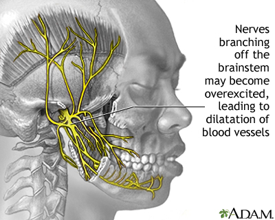 MigraineHeadache - migraine; Vascular headache - migraineA migraine is a type of headache. It may occur with symptoms such as nausea, vomiting, or sensitivity to light and sound. In most people, a throbbing pain is felt only on one side of the head.Related video goes here for no-HTML5 browsers Causes A migraine headache is caused by abnormal brain activity. This activity can be triggered by many things. But the exact chain of events remains unclear. Most medical experts believe the attack begins in the brain and involves nerve pathways and chemicals. The changes affect blood flow in the brain and surrounding tissues.Previous imagePlay SlideshowStop SlideshowNext image / Migraine headaches tend to first appear between the ages of 10 and 45. Sometimes, they begin earlier or later. Migraines may run in families. Migraines occur more often in women than men. Some women, but not all, have fewer migraines when they are pregnant.Migraine attacks may be triggered by any of the following:Caffeine withdrawal Changes in hormone levels during a woman's menstrual cycle or with the use of birth control pills Changes in sleep patterns, such as not getting enough sleep Drinking alcohol Exercise or other physical stress Loud noises or bright lights Missed meals Odors or perfumes Smoking or exposure to smoke Stress and anxiety Migraines can also be triggered by certain foods. The most common are:Chocolate Dairy foods, especially certain cheeses Foods with monosodium glutamate (MSG) Foods with tyramine, which includes red wine, aged cheese, smoked fish, chicken livers, figs, and certain beans Fruits (avocado, banana, citrus fruit) Meats containing nitrates (bacon, hot dogs, salami, cured meats) Onions Peanuts and other nuts and seeds Processed, fermented, pickled, or marinated foods True migraine headaches are not a result of a brain tumor or other serious medical problem. Only your health care provider can determine if your symptoms are due to a migraine disorder or other condition. Symptoms There are two main types of migraines:Migraine with aura (classic migraine) Migraine without aura (common migraine) An aura is a group of nervous system (neurologic) symptoms. These symptoms are considered a warning sign that a migraine is coming. Most often, the vision is affected and can include any or all of the following:Temporary blind spots or colored spots Blurred vision Eye pain Seeing stars, zigzag lines, or flashing lights Tunnel vision (only able to see objects close to the center of the field of view) Other nervous system symptoms include yawning, difficulty concentrating, nausea, trouble finding the right words, dizziness, weakness, numbness, and tingling. Some of these symptoms are much less common with migraine headaches. If you have any of these symptoms, your provider will likely order tests to find the cause.An aura often occurs 10 to 15 minutes before the headache, but can occur just a few minutes to 24 hours before. A headache does not always follow an aura.Previous imagePlay SlideshowStop SlideshowNext image / The headaches usually:Start as a dull ache and get worse within minutes to hours Are throbbing, pounding, or pulsating Are worse on one side of the head with pain behind the eye or in the back of the head and neck Last 4 to 72 hours Other symptoms that may occur with the headache include:Chills Increased urination Fatigue Loss of appetite Nausea and vomiting Sensitivity to light or sound Sweating Symptoms may linger, even after the migraine goes away. This is called a migraine hangover. Symptoms can include:Feeling mentally dull, like your thinking is not clear or sharp Needing more sleep Neck pain Exams and Tests Your provider can diagnose migraine headache by asking about your symptoms and family history of migraines. A complete physical and neurological exam will be done to determine if your headaches are due to muscle tension, sinus problems, or a different brain disorder.There is no specific test to prove that your headache is actually a migraine. In most cases, no special tests are needed. Your provider may order a brain CT or MRI scan if you have certain neurologic symptoms with your migraine, including weakness, memory problems, or loss of alertness, especially, if you have never had one before.Brain CTA head computed tomography (CT) scan uses many x-rays to create pictures of the head, including the skull, brain, eye sockets, and sinuses.ImageRead Article Now Book Mark Article MRIA head MRI (magnetic resonance imaging) is an imaging test that uses powerful magnets and radio waves to create pictures of the brain and surrounding...ImageRead Article Now Book Mark Article An electroencephalogram (EEG) may be needed to check for seizures. A lumbar puncture (spinal tap) might be done.ElectroencephalogramAn electroencephalogram (EEG) is a test to measure the electrical activity of the brain.ImageRead Article Now Book Mark Article Lumbar punctureCerebrospinal fluid (CSF) collection is a test to look at the fluid that surrounds the brain and spinal cord. CSF acts as a cushion, protecting the b...ImageRead Article Now Book Mark Article Treatment There is no specific cure for migraine headaches. The goal is to treat your migraine symptoms right away and to prevent symptoms by avoiding or changing your triggers.A key step is learning how to manage your migraines at home. A headache diary can help you identify your headache triggers. Then you and your provider can plan how to avoid these triggers.Manage your migraines at homeA migraine is a common type of headache. It may occur with symptoms such as nausea, vomiting, or sensitivity to light. Most people feel a throbbing...ImageRead Article Now Book Mark Article Lifestyle changes include:Healthier sleep habits, such as getting enough sleep and going to bed at the same time each night Healthier eating habits, including not skipping meals and avoiding your food triggers Managing stress Losing weight, if you're overweight If you have frequent migrai