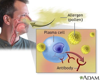 BACK TOTOP Browse A-ZSearchBrowse A-ZABCDEFGHIJKLMNOPQRSTUVWXYZ0-9 E-mail FormEmail ResultsName:Email address:Recipients Name:Recipients address:Message: Print-FriendlyBookmarksbookmarks-menuAllergic rhinitisHay fever; Nasal allergies; Seasonal allergy; Seasonal allergic rhinitis; Allergies - allergic rhinitis; Allergy - allergic rhinitisAllergic rhinitis is a diagnosis associated with a group of symptoms affecting the nose. These symptoms occur when you breathe in something you are allergic to, such as dust, animal dander, or pollen. Symptoms can also occur when you eat a food that you are allergic to.This article focuses on allergic rhinitis due to plant pollens. This type of allergic rhinitis is commonly called hay fever or seasonal allergy.Related video goes here for no-HTML5 browsers Causes An allergen is something that triggers an allergy. When a person with allergic rhinitis breathes in an allergen such as pollen, mold, animal dander, or dust, the body releases chemicals that cause allergy symptoms.AllergenAn allergen is a substance that can cause an allergic reaction. In some people, the immune system recognizes allergens as foreign or dangerous. As ...ImageRead Article Now Book Mark Article Previous imagePlay SlideshowStop SlideshowNext image / Hay fever involves an allergic reaction to pollen.Allergic reactionAllergic reactions are sensitivities to substances called allergens that come into contact with the skin, nose, eyes, respiratory tract, and gastroin...ImageRead Article Now Book Mark Article Plants that cause hay fever are trees, grasses, and ragweed. Their pollen is carried by the wind. Flower pollen is carried by insects and does not cause hay fever. Types of plants that cause hay fever vary from person to person and from area to area.The amount of pollen in the air can affect whether hay fever symptoms develop or not. Hot, dry, windy days are more likely to have a lot of pollen in the air. On cool, damp, rainy days, most pollen is washed to the ground. Hay fever and allergies often run in families. If both of your parents have hay fever or other allergies, you are likely to have hay fever and allergies, too. The chance is higher if your mother has allergies. Symptoms Symptoms that occur shortly after you come into contact with the substance you are allergic to may include:Itchy nose, mouth, eyes, throat, skin, or any area Problems with smell Problems with smellImpaired smell is the partial or total loss or abnormal perception of the sense of smell.Read Article Now Book Mark Article Runny nose Sneezing Watery eyes Symptoms that may develop later include:Stuffy nose (nasal congestion) Coughing CoughingCoughing is an important way to keep your throat and airways clear. But too much coughing may mean you have a disease or disorder. Some coughs are d...ImageRead Article Now Book Mark Article Clogged ears and decreased sense of smell Sore throat Sore throatPharyngitis, or sore throat, is discomfort, pain, or scratchiness in the throat. It often makes it painful to swallow.ImageRead Article Now Book Mark Article Dark circles under the eyes Puffiness under the eyes Fatigue and irritability FatigueFatigue is a feeling of weariness, tiredness, or lack of energy.ImageRead Article Now Book Mark Article HeadacheHeadacheA headache is pain or discomfort in the head, scalp, or neck. Serious causes of headaches are rare. Most people with headaches can feel much better...ImageRead Article Now Book Mark Article Previous imagePlay SlideshowStop SlideshowNext image / Exams and Tests The health care provider will perform a physical exam and ask about your symptoms. You will be asked whether your symptoms vary by time of day or season, and exposure to pets or other allergens.Allergy testing may reveal the pollen or other substances that trigger your symptoms. Skin testing is the most common method of allergy testing.Skin testingAllergy skin tests are used to find out which substances cause a person to have an allergic reaction. These substances are called allergens....ImageRead Article Now Book Mark Article If your provider determines you cannot have skin testing, special blood tests may help with the diagnosis. These tests, known as IgE RAST tests, can measure the levels of allergy-related substances.A blood test, called the eosinophil count, may also help diagnose allergies.EosinophilAn absolute eosinophil count is a blood test that measures the number of one type of white blood cells called eosinophils. Eosinophils become active...ImageRead Article Now Book Mark Article Treatment LIFESTYLE AND AVOIDING ALLERGENSThe best treatment is to avoid the pollens that cause your symptoms. It may be impossible to avoid all pollen. But you can often take steps to reduce your exposure.Take steps to reduce your exposureAllergic rhinitis is a group of symptoms that affect your nose. They occur when you breathe in something you are allergic to, such as dust mites, an...ImageRead Article Now Book Mark Article You may be prescribed medicine to treat allergic rhinitis. The medicine your provider prescribes depends on your symptoms and how severe they are. Your age and whether you have other medical conditions, such as asthma, will also be considered.For mild allergic rhinitis, a nasal wash can help remove mucus from the nose. You can buy a saline solution at a drug store or make one at home using 1 cup (240 milliliters) of distilled or boiled then cooled water, half a teaspoon (3 grams) of salt, and pinch of baking soda.Related video goes here for no-HTML5 browsersTreatments for allergic rhinitis include:ANTIHISTAMINESMedicines called antihistamines work well for treating allergy symptoms. They may be used when symptoms do not happen often or do not last long. Be aware of the following:AntihistaminesAn allergy is an immune response, or reaction, to substances (allergens) that are usually not harmful. In someone with allergies, the immune respons...ImageRead Article Now Book Mark Article Many antihistamines 