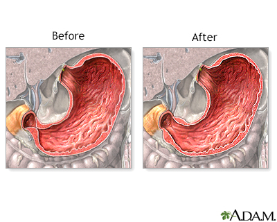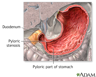 Pyloric stenosis in infantsCongenital hypertrophic pyloric stenosis; Infantile hypertrophic pyloric stenosis; Gastric outlet obstruction; Vomiting - pyloric stenosisPyloric stenosis is a narrowing of the opening from the stomach into the small intestine. This is called the pylorus. This article describes the condition in infants. Causes Normally, food passes easily from the stomach into the first part of the small intestine through a valve called the pylorus. With pyloric stenosis, the muscles of the pylorus are thickened. This prevents the stomach from emptying into the small intestine.The exact cause of the thickening is unknown. Genes may play a role, since children of parents who had pyloric stenosis are more likely to have this condition. Other risk factors include:Certain antibiotics Too much acid in the first part of the small intestine (duodenum) Small intestineThe duodenum is the first part of the small intestine. It is located between the stomach and the middle part of the small intestine, or jejunum. Aft...ImageRead Article Now Book Mark Article Certain diseases a baby is born with, such as diabetesPyloric stenosis occurs most often in infants younger than 6 months. It is more common in boys than in girls. Symptoms Vomiting is the first symptom in most children:Vomiting may occur after every feeding or only after some feedings. Vomiting usually starts around 3 weeks of age, but may start any time between 1 week and 5 months of age. Vomiting is forceful (projectile vomiting). The infant is hungry after vomiting and wants to feed again. Other symptoms appear several weeks after birth and may include:Abdominal pain Burping Constant hunger Dehydration (gets worse as vomiting gets worse) DehydrationDehydration occurs when your body does not have as much water and fluids as it needs. Dehydration can be mild, moderate, or severe, based on how much...ImageRead Article Now Book Mark Article Failure to gain weight or weight loss Wave-like motion of the abdomen shortly after feeding and just before vomiting occurs Exams and Tests The condition is often diagnosed before the baby is 6 months old.A physical exam may reveal: Signs of dehydration, such as dry skin and mouth, less tearing when crying, and dry diapers Swollen belly Olive-shaped mass when feeling the upper belly, which is the abnormal pylorus Ultrasound of the abdomen may be the first imaging test. Other tests may include:Ultrasound of the abdomenAbdominal ultrasound is a type of imaging test. It is used to look at organs in the abdomen, including the liver, gallbladder, pancreas, and kidneys...ImageRead Article Now Book Mark Article Barium x-ray -- reveals a swollen stomach and narrowed pylorus Barium x-rayAn upper GI and small bowel series is a set of x-rays taken to examine the esophagus, stomach, and small intestine. Barium enema is a different test ...ImageRead Article Now Book Mark Article Blood tests -- often reveal an electrolyte imbalance ElectrolyteElectrolytes are minerals in your blood and other body fluids that carry an electric charge. Electrolytes affect how your body functions in many ways...Read Article Now Book Mark Article Treatment Treatment for pyloric stenosis involves surgery to widen the pylorus. The surgery is called pyloromyotomy.In infants who cannot have surgery, tube feeding or medicine to relax the pylorus is tried. Outlook (Prognosis) Surgery usually relieves all symptoms. As soon as several hours after surgery, the infant can start small, frequent feedings. Possible Complications If pyloric stenosis isn't treated, a baby won't get enough nutrition and fluid. The child can become underweight and dehydrated. When to Contact a Medical Professional Contact your health care provider if your baby has symptoms of this condition. Open ReferencesReferencesKliegman RM, St. Geme JW, Blum NJ, Shah SS, Tasker RC, Wilson KM. Pyloric stenosis and other congenital anomalies of the stomach. In: Kliegman RM, St. Geme JW, Blum NJ, Shah SS, Tasker RC, Wilson KM, eds. Nelson Textbook of Pediatrics. 21st ed. Philadelphia, PA: Elsevier; 2020:chap 355.Seifarth FG, Soldes OS. Congenital anomalies and surgical disorders of the stomach. In: Wyllie R, Hyams JS, Kay M, eds. Pediatric Gastrointestinal and Liver Disease. 6th ed. Philadelphia, PA: Elsevier; 2021:chap 25.