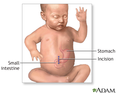 BACK TOTOP Browse A-ZSearchBrowse A-ZABCDEFGHIJKLMNOPQRSTUVWXYZ0-9 E-mail FormEmail ResultsName:Email address:Recipients Name:Recipients address:Message: Print-FriendlyBookmarksbookmarks-menuPyloric stenosis in infantsCongenital hypertrophic pyloric stenosis; Infantile hypertrophic pyloric stenosis; Gastric outlet obstruction; Vomiting - pyloric stenosisPyloric stenosis is a narrowing of the opening from the stomach into the small intestine. This is called the pylorus. This article describes the condition in infants. Causes Normally, food passes easily from the stomach into the first part of the small intestine through a valve called the pylorus. With pyloric stenosis, the muscles of the pylorus are thickened. This prevents the stomach from emptying into the small intestine.The exact cause of the thickening is unknown. Genes may play a role, since children of parents who had pyloric stenosis are more likely to have this condition. Other risk factors include:Certain antibiotics Too much acid in the first part of the small intestine (duodenum) Small intestineThe duodenum is the first part of the small intestine. It is located between the stomach and the middle part of the small intestine, or jejunum. Aft...ImageRead Article Now Book Mark Article Certain diseases a baby is born with, such as diabetesPyloric stenosis occurs most often in infants younger than 6 months. It is more common in boys than in girls. Symptoms Vomiting is the first symptom in most children:Vomiting may occur after every feeding or only after some feedings. Vomiting usually starts around 3 weeks of age, but may start any time between 1 week and 5 months of age. Vomiting is forceful (projectile vomiting). The infant is hungry after vomiting and wants to feed again. Other symptoms appear several weeks after birth and may include:Abdominal pain Burping Constant hunger Dehydration (gets worse as vomiting gets worse) DehydrationDehydration occurs when your body does not have as much water and fluids as it needs. Dehydration can be mild, moderate, or severe, based on how much...ImageRead Article Now Book Mark Article Failure to gain weight or weight loss Wave-like motion of the abdomen shortly after feeding and just before vomiting occurs Exams and Tests The condition is often diagnosed before the baby is 6 months old.A physical exam may reveal: Signs of dehydration, such as dry skin and mouth, less tearing when crying, and dry diapers Swollen belly Olive-shaped mass when feeling the upper belly, which is the abnormal pylorus Ultrasound of the abdomen may be the first imaging test. Other tests may include:Ultrasound of the abdomenAbdominal ultrasound is a type of imaging test. It is used to look at organs in the abdomen, including the liver, gallbladder, pancreas, and kidneys...ImageRead Article Now Book Mark Article Barium x-ray -- reveals a swollen stomach and narrowed pylorus Barium x-rayAn upper GI and small bowel series is a set of x-rays taken to examine the esophagus, stomach, and small intestine. Barium enema is a different test ...ImageRead Article Now Book Mark Article Blood tests -- often reveal an electrolyte imbalance ElectrolyteElectrolytes are minerals in your blood and other body fluids that carry an electric charge. Electrolytes affect how your body functions in many ways...Read Article Now Book Mark Article Treatment Treatment for pyloric stenosis involves surgery to widen the pylorus. The surgery is called pyloromyotomy.In infants who cannot have surgery, tube feeding or medicine to relax the pylorus is tried. Outlook (Prognosis) Surgery usually relieves all symptoms. As soon as several hours after surgery, the infant can start small, frequent feedings. Possible Complications If pyloric stenosis isn't treated, a baby won't get enough nutrition and fluid. The child can become underweight and dehydrated. When to Contact a Medical Professional Contact your health care provider if your baby has symptoms of this condition. Open ReferencesReferencesKliegman RM, St. Geme JW, Blum NJ, Shah SS, Tasker RC, Wilson KM. Pyloric stenosis and other congenital anomalies of the stomach. In: Kliegman RM, St. Geme JW, Blum NJ, Shah SS, Tasker RC, Wilson KM, eds. Nelson Textbook of Pediatrics. 21st ed. Philadelphia, PA: Elsevier; 2020:chap 355.Seifarth FG, Soldes OS. Congenital anomalies and surgical disorders of the stomach. In: Wyllie R, Hyams JS, Kay M, eds. Pediatric Gastrointestinal and Liver Disease. 6th ed. Philadelphia, PA: Elsevier; 2021:chap 25.AllVideoImagesTogDigestive system - illustration The esophagus, stomach, large and small intestine, aided by the liver, gallbladder and pancreas convert the nutritive components of food into energy and break down the non-nutritive components into waste to be excreted.Digestive systemillustrationPyloric stenosis - illustration A narrowing of the outlet from the stomach to the small intestine (called the pylorus) that occurs in infants.Pyloric stenosisillustrationInfantile pyloric stenosis - seriesPresentation Digestive system - illustration The esophagus, stomach, large and small intestine, aided by the liver, gallbladder and pancreas convert the nutritive components of food into energy and break down the non-nutritive components into waste to be excreted.Digestive systemillustrationPyloric stenosis - illustration A narrowing of the outlet from the stomach to the small intestine (called the pylorus) that occurs in infants.Pyloric stenosisillustration Infantile pyloric stenosis - seriesPresentation Related Information Review Date: 8/5/2023 Reviewed By: Neil K. Kaneshiro, MD, MHA, Clinical Professor of Pediatrics, University of Washington School of Medicine, Seattle, WA. Also reviewed by David C. Dugdale, MD, Medical Director, Brenda Conaway, Editorial Director, and the A.D.A.M. Editorial team. Editorial update 09/03/2025. The information provided herein should not be used during any medical emergency or for the diagnosis or treatment of any medical condition. A licensed medical