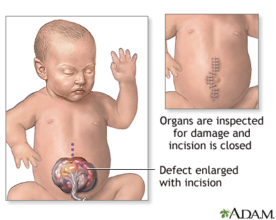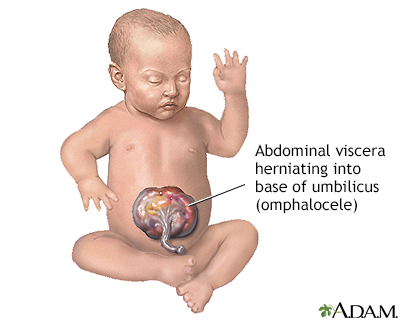 OmphaloceleBirth defect - omphalocele; Abdominal wall defect - infant; Abdominal wall defect - neonate; Abdominal wall defect - newbornAn omphalocele is a birth defect in which an infant's intestine or other abdominal organs are outside of the body because of a hole in the belly button (navel) area. The intestines are covered only by a thin layer of tissue and can be easily seen. Causes An omphalocele is considered an abdominal wall defect (a hole in the abdominal wall). The child's intestines usually stick out (protrude) through the hole.The condition looks similar to gastroschisis. An omphalocele is a birth defect in which the infant's intestine or other abdominal organs protrude through a hole in the belly button area and are covered with a membrane. In gastroschisis, there is no covering membrane.GastroschisisGastroschisis is a birth defect in which an infant's intestines are outside of the body because of a hole in the abdominal wall.ImageRead Article Now Book Mark Article Abdominal wall defects develop as a baby grows inside the mother's womb. During development, the intestines and other organs (liver, bladder, stomach, and ovaries or testes) develop outside the body at first and then usually return inside. In babies with omphalocele, the intestines and other organs remain outside the abdominal wall, with a membrane covering them. The exact cause for abdominal wall defects is not known.Infants with an omphalocele often have other birth defects. Defects include genetic problems (chromosomal abnormalities), congenital diaphragmatic hernia, and heart and kidney defects. These problems also affect the overall outlook (prognosis) for the baby's health and survival.Diaphragmatic herniaA diaphragmatic hernia is a birth defect in which there is an abnormal opening in the diaphragm. The diaphragm is the muscle between the chest and a...ImageRead Article Now Book Mark Article Symptoms An omphalocele can be clearly seen. This is because the abdominal contents stick out through the belly button area.There are different sizes of omphaloceles. In small ones, only the intestines remain outside the body. In larger ones, the liver or other organs may be outside as well. Exams and Tests Prenatal ultrasounds often identify infants with an omphalocele before birth, usually by 20 weeks of pregnancy.Testing is often not necessary to diagnose omphalocele. However, babies with an omphalocele should be tested for other problems that often go with it. This includes ultrasounds of the kidneys and heart, and blood tests for genetic disorders, among other tests. Treatment Omphaloceles are repaired with surgery, although not always immediately. A sac protects the abdominal contents and may allow time for other more serious problems (such as heart defects) to be dealt with first, if necessary.SurgeryOmphalocele repair is a procedure done on an infant to correct a birth defect in the wall of the belly (abdomen) in which all or part of the bowel, p...ImageRead Article Now Book Mark Article Some smaller omphaloceles can be closed immediately by surgery. To close a larger omphalocele, the sac is covered with a sterile mesh material, which is then stitched in place to form what is called a silo. As the baby grows over time, the abdominal contents are pushed into the abdomen by gravity.When the omphalocele can comfortably fit within the abdominal cavity, the silo is removed and the abdomen is closed.Because of the pressure involved in returning the intestines to the abdomen, the baby may need support to breathe with a ventilator. Other treatments for the baby include nutrients by IV and antibiotics to prevent infection. Even after the defect is closed, IV nutrition will continue as milk feedings must be introduced slowly.Sometimes an omphalocele is so large that it cannot be placed back inside the infant's abdomen. The skin around the omphalocele grows and eventually covers the omphalocele. The abdominal muscles and skin can be repaired when the child is older for a better cosmetic outcome. Outlook (Prognosis) Complete recovery is expected after surgery for an omphalocele. However, omphaloceles often occur with other birth defects. How well a child does will depend on which other conditions the child has.If the omphalocele is identified before birth, the mother should be closely monitored to make sure the unborn baby remains healthy.Plans should be made for careful delivery and immediate management of the problem after birth. The baby should be delivered in a medical center that is skilled at repairing abdominal wall defects. Babies are likely to do better if they do not need to be taken to another center for further treatment.Parents should consider testing the baby, and possibly family members, for other genetic problems that are associated with this condition. Possible Complications The increased pressure from the misplaced abdominal contents can decrease blood flow to the intestine and kidneys. It can also make it difficult for the baby's lungs to expand, leading to breathing problems.Another complication is bowel death leading to necrosis of the bowel. This occurs when intestinal tissue dies due to low blood flow or infection. The risk may be reduced in babies who receive maternal milk rather than formula. When to Contact a Medical Professional This condition is apparent at birth and will be detected in the hospital at delivery if it has not already been seen on routine fetal ultrasound exams during pregnancy. If you have given birth at home and your baby appears to have this defect, call 911 or the local emergency number right away.This problem is diagnosed and repaired in the hospital at birth. After returning home, call your health care provider if your baby develops any of these symptoms:Decreased bowel movements Feeding problems Fever Green or yellowish green vomit Swollen belly area Vomiting (different than normal baby spit-up) Worrisome behavioral changesOpen ReferencesReferencesCenters for Disease Control
