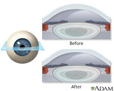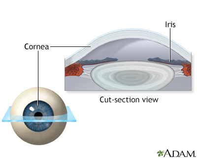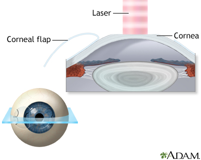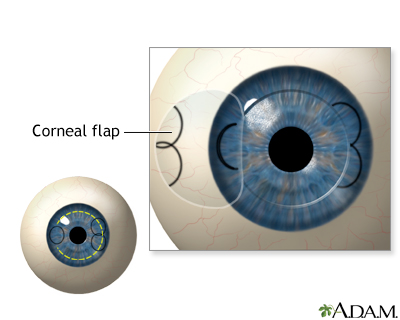NearsightednessMyopia; Shortsightedness; Refractive error - nearsightednessNearsightedness is when light entering the eye is focused incorrectly. This makes distant objects appear blurred. Nearsightedness is a type of refractive error of the eye.If you are nearsighted, you have trouble seeing things that are far away. Causes People are able to see because the front part of the eye bends (refracts) light and focuses it on the retina. This is the inside of the back surface of the eye.Nearsightedness occurs when there is a mismatch between the focusing power of the eye and the length of the eye. Light rays are focused in front of the retina, rather than directly on it. As a result, what you see is blurry. Most of the eye's focusing power comes from the cornea.No audio descriptionWith audio descriptionRelated video goes here for no-HTML5 browsersRelated video goes here for no-HTML5 browsersNearsightedness affects males and females equally. People who have a family history of nearsightedness are more likely to develop it. Most eyes with nearsightedness are healthy. However, a small number of people with severe nearsightedness develop a form of retinal degeneration.The predominant wavelength of light in your environment may affect the development of myopia. Recent research suggests that more time outdoors during childhood may lead to less myopia. Symptoms A nearsighted person sees close-up objects clearly, but objects in the distance are blurred. Squinting will tend to make far away objects seem clearer.Nearsightedness is often first noticed in school-aged children or teenagers. Children often cannot read the blackboard, but they can easily read a book.Nearsightedness gets worse during the growth years. People who are nearsighted may need to change glasses or contact lenses often. Nearsightedness most often stops progressing as a person stops growing in his or her early twenties.Other symptoms may include:Eyestrain Headaches (uncommon) HeadachesA headache is pain or discomfort in the head, scalp, or neck. Serious causes of headaches are rare. Most people with headaches can feel much better...ImageRead Article Now Book Mark Article Exams and Tests A nearsighted person can easily read the Jaeger eye chart (the chart for near reading), but has trouble reading the Snellen eye chart (the chart for distance reading).A general eye exam, or standard ophthalmic exam may include:Standard ophthalmic examA standard eye exam is a series of tests done to check your vision and the health of your eyes. This exam is performed by an ophthalmologist or opto...ImageRead Article Now Book Mark Article Eye pressure measurement (tonometry) TonometryTonometry is a test to measure the pressure inside your eyes. The test is used to screen for glaucoma. It is also used to measure how well glaucoma...ImageRead Article Now Book Mark Article Refraction test, to determine the correct prescription for glasses Refraction testA refraction is an eye exam that measures a person's prescription for eyeglasses or contact lenses.ImageRead Article Now Book Mark Article Retinal examination Slit-lamp exam of the structures at the front of the eyes Slit-lamp examThe slit-lamp examination looks at structures that are at the front of the eye.ImageRead Article Now Book Mark Article Test of color vision, to look for possible color blindness Test of color visionA color vision test checks your ability to distinguish between different colors.ImageRead Article Now Book Mark Article Tests of the muscles that move the eyes Visual acuity, both at a distance (Snellen), and close up (Jaeger) Treatment Wearing eyeglasses or contact lenses can help shift the focus of the light image directly onto the retina. This will produce a clearer image.The most common surgery to correct myopia is LASIK. An excimer laser is used to reshape (flatten) the cornea, shifting the focus. A newer type of laser refractive surgery called SMILE (Small Incision Lenticule Extraction) is also approved for use in the United States.LASIKLASIK is eye surgery that permanently changes the shape of the cornea (the clear covering on the front of the eye). It is done to improve vision and...ImageRead Article Now Book Mark Article Outlook (Prognosis) Early diagnosis of nearsightedness is important. A child can suffer socially and educationally by not being able to see well at a distance. Possible Complications Complications may include:Corneal ulcers and infections may occur in people who use contact lenses. Corneal ulcers and infectionsThe cornea is the clear tissue at the front of the eye. A corneal ulcer is an open sore in the outer layer of the cornea. It is often caused by inf...ImageRead Article Now Book Mark Article Rarely, complications of laser vision correction may occur. These can be serious. People with myopia, in rare cases, develop retinal detachments or retinal degeneration.Retinal detachmentsRetinal detachment is a separation of the light-sensitive membrane (retina) in the back of the eye from its supporting layers.ImageRead Article Now Book Mark Article When to Contact a Medical Professional Contact your health care provider if your child shows these signs, which may indicate a vision problem:Having difficulty reading the blackboard in school or signs on a wall Holding books very close when reading Sitting close to the television Contact your eye doctor if you or your child is nearsighted and experiences signs of a possible retinal tear or detachment, including:Flashing lights Floating spots Sudden loss of any part of the field of vision Prevention It has been generally believed that there is no way to prevent nearsightedness. Reading and watching television do not cause nearsightedness.During the COVID-19 pandemic of 2020, when most school-aged children were learning from home, there was an increase in the development of nearsightedness over what had been seen before. In the past, dilating eye drops were proposed as a treatment to slow the development of nearsightednes