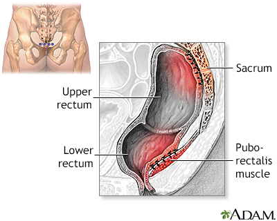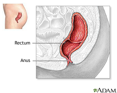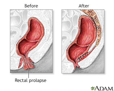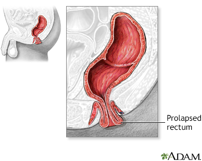Rectal prolapseProcidentia; Rectal intussusceptionRectal prolapse occurs when the rectum sags and comes through the anal opening. Causes The exact cause of rectal prolapse is unclear. Possible causes may include any of the following:An enlarged opening due to relaxed muscles in the pelvic floor, which is formed of muscles around the rectum Loose muscles of the anal sphincter An abnormally long colon Downward movement of the abdominal cavity between the rectum and uterus Prolapse of the small intestine Constipation ConstipationConstipation in infants and children means they have hard stools or have problems passing stools. A child may have pain while passing stools or may ...ImageRead Article Now Book Mark Article Diarrhea DiarrheaDiarrhea is when you pass loose or watery stool.ImageRead Article Now Book Mark Article Chronic coughing and sneezingA prolapse can be partial or complete:With a partial prolapse, the inner lining of the rectum bulges partly from the anus. With a complete prolapse, the entire rectum bulges through the anus.Rectal prolapse occurs most often in children under age 6 years. Health problems that may lead to prolapse include:Cystic fibrosis Cystic fibrosisCystic fibrosis is a disease that causes thick, sticky mucus to build up in the lungs, digestive tract, and other areas of the body. It is one of th...ImageRead Article Now Book Mark Article Intestinal worm infections Long-term diarrhea Other health problems present at birthIn adults, it is usually found with constipation, or with a muscle or nerve problem in the pelvic or genital area. Symptoms The main symptom is a reddish-colored mass that sticks out from the opening of the anus, especially after a bowel movement. This reddish mass is actually the inner lining of the rectum. It may bleed slightly and can be uncomfortable and painful. Exams and Tests Your health care provider will perform a physical exam, which will include a rectal exam. To check for prolapse, the provider may ask the person to bear down while sitting on a toilet.Rectal examA digital rectal exam is an exam of the lower rectum. Your health care provider uses a gloved, lubricated finger to check for any abnormal findings....ImageRead Article Now Book Mark Article Tests that may be done include:Colonoscopy to confirm the diagnosis ColonoscopyA colonoscopy is an exam that views the inside of the colon (large intestine) and rectum, using a tool called a colonoscope. The colonoscope has a sm...ImageRead Article Now Book Mark Article Blood test to check for anemia if there is bleeding from the rectumBlood testHemoglobin is a protein in red blood cells that carries oxygen. The hemoglobin test measures how much hemoglobin is in your blood.ImageRead Article Now Book Mark Article Treatment Contact your provider if a rectal prolapse occurs.In some cases, the prolapse can be treated at home. Follow your provider's instructions on how to do this. The rectum must be pushed back inside manually. A soft, warm, wet cloth is used to apply gentle pressure to the mass to push it back through the anal opening. The person should lie on one side in a knee-chest position before applying pressure. This position allows gravity to help put the rectum back into position.Immediate surgery is rarely needed. In children, treating the cause often solves the problem. For example, if the cause is straining because of dry stools, laxatives may help. If the prolapse continues, surgery may be needed.In adults, the only cure for rectal prolapse is a procedure that repairs the weakened anal sphincter and pelvic muscles.ProcedureRectal prolapse repair is surgery to fix a rectal prolapse. This is a condition in which the last part of the intestine (called the rectum) sticks o...ImageRead Article Now Book Mark Article Outlook (Prognosis) In children, treating the cause cures rectal prolapse. In adults, surgery usually cures the prolapse.When rectal prolapse is not treated, constipation and loss of bowel control may develop. When to Contact a Medical Professional Contact your provider right away if there is a rectal prolapse. Prevention In children, treating the cause usually prevents rectal prolapse from happening again. Open ReferencesReferencesIturrino JC, Lembo AJ. Constipation. In: Feldman M, Friedman LS, Brandt LJ, eds. Sleisenger and Fordtran's Gastrointestinal and Liver Disease: Pathophysiology/Diagnosis/Management. 11th ed. Philadelphia, PA: Elsevier; 2021:chap 19.Kliegman RM, St. Geme JW, Blum NJ, et al. Surgical conditions of the anus and rectum. In: Kliegman RM, St. Geme JW, Blum NJ, et al, eds. Nelson Textbook of Pediatrics. 22nd ed. Philadelphia, PA: Elsevier; 2025:chap 392.Madoff RD, Melton GB. Diseases of the rectum and anus. In: Goldman L, Cooney KA, eds. Goldman-Cecil Medicine. 27th ed. Philadelphia, PA: Elsevier; 2024:chap 131.