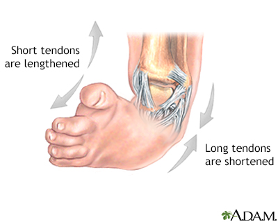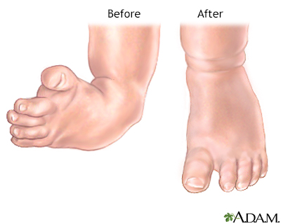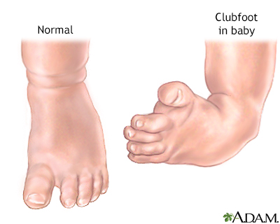 BACK TOTOP Browse A-ZSearchBrowse A-ZABCDEFGHIJKLMNOPQRSTUVWXYZ0-9 E-mail FormEmail ResultsName:Email address:Recipients Name:Recipients address:Message: Print-FriendlyBookmarksbookmarks-menuClubfootTalipes equinovarus; TalipesClubfoot is a condition that involves both the foot and lower leg in which the foot turns inward and downward. It is a congenital condition, which means it is present at birth. Causes Clubfoot is the most common congenital disorder of the legs. It can range from mild and flexible to severe and rigid.The cause is not known. Most often, it occurs by itself. But the condition may be passed down through families in some cases. Risk factors include a family history of the disorder and being male. Clubfoot can also occur as part of an underlying genetic syndrome, such as trisomy 18.Trisomy 18Trisomy 18 is a genetic disorder in which a person has a third copy of material from chromosome 18, instead of the usual 2 copies. Rarely, the extra...Read Article Now Book Mark Article A related problem, called positional clubfoot, is not true clubfoot. It results from a normal foot positioned abnormally while the baby is in the womb. This problem is easily corrected after birth. Symptoms The physical appearance of the foot may vary. One or both feet may be affected.The foot turns inward and downward at birth and is difficult to place in the correct position. The calf muscle and foot may be slightly smaller than normal. Exams and Tests The disorder is identified during a physical examination.A foot x-ray may be done. Ultrasound during the first 6 months of pregnancy can also help to identify the disorder. Treatment Treatment may involve moving the foot into the correct position and using a cast to keep it there. This is often done by an orthopedic specialist. Treatment should be started as early as possible, ideally, shortly after birth, when it is easiest to reshape the foot.Gentle stretching and recasting will be done every week to improve the position of the foot. Generally, 5 to 10 casts are needed. The final cast will stay in place for 3 weeks. After the foot is in the correct position, the child will wear a special brace nearly full time for 3 months. Then, the child will wear the brace at night for 3 to 5 years.Often, the problem is a tightened Achilles tendon, and a simple procedure is needed to release it.Some severe cases of clubfoot will need surgery if other treatments do not work, or if the problem returns. The child should be monitored by your health care provider until the foot is fully grown.SurgeryClubfoot repair is surgery to correct a birth defect of the foot and ankle.ImageRead Article Now Book Mark Article Outlook (Prognosis) The outcome is usually good with treatment. Possible Complications Some defects may not be completely fixed. However, treatment can improve the appearance and function of the foot. Treatment may be less successful if the clubfoot is linked to other birth disorders. When to Contact a Medical Professional If your child is being treated for clubfoot, contact your provider if:The toes swell, bleed, or change color under the cast The cast appears to be causing significant pain The toes disappear into the cast The cast slides off The foot begins to turn in again after treatment Open ReferencesReferencesMartin S. Clubfoot (talipes equinovarus). In: Copel JA, D'Alton ME, Feltovich H, et al. Obstetric Imaging: Fetal Diagnosis and Care. 2nd ed. Philadelphia, PA: Elsevier; 2018:chap 64.Warner WC, Beaty JH. Paralytic disorders. In: Azar FM, Beaty JH, eds. Campbell's Operative Orthopaedics. 14th ed. Philadelphia, PA: Elsevier; 2021:chap 34.Winell JJ, Davidson RS. The foot and toes. In: Kliegman RM, St. Geme JW, Blum NJ, Shah SS, Tasker RC, Wilson KM, eds. Nelson Textbook of Pediatrics. 21st ed. Philadelphia, PA: Elsevier; 2020:chap 694.AllVideoImagesTogClubfoot deformity - illustration Clubfoot is the most common congenital disorder of the lower extremity. One or both feet turn downward and inward. Genetic and environmental factors in the development of the fetus are the apparent causes.Clubfoot deformityillustrationClubfoot repair - seriesPresentation Clubfoot deformity - illustration Clubfoot is the most common congenital disorder of the lower extremity. One or both feet turn downward and inward. Genetic and environmental factors in the development of the fetus are the apparent causes.Clubfoot deformityillustration Clubfoot repair - seriesPresentation Related Information Review Date: 11/6/2023 Reviewed By: Neil K. Kaneshiro, MD, MHA, Clinical Professor of Pediatrics, University of Washington School of Medicine, Seattle, WA. Also reviewed by David C. Dugdale, MD, Medical Director, Brenda Conaway, Editorial Director, and the A.D.A.M. Editorial team. The information provided herein should not be used during any medical emergency or for the diagnosis or treatment of any medical condition. A licensed medical professional should be consulted for diagnosis and treatment of any and all medical conditions. Links to other sites are provided for information only -- they do not constitute endorsements of those other sites. No warranty of any kind, either expressed or implied, is made as to the accuracy, reliability, timeliness, or correctness of any translations made by a third-party service of the information provided herein into any other language. © 1997- A.D.A.M., a business unit of Ebix, Inc. Any duplication or distribution of the information contained herein is strictly prohibited. © 1997- All rights reserved. A.D.A.M. content is best viewed in IE9 or above, Firefox and Google Chrome browser.Content is best viewed in IE9 or above, Firefox and Google Chrome browser.