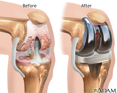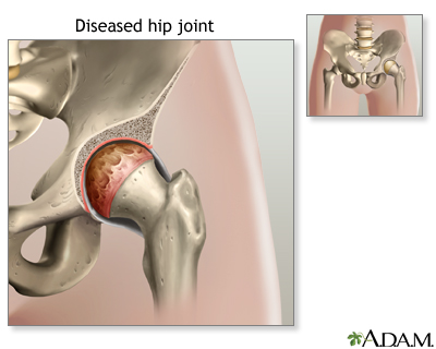 ArthritisJoint inflammation; Joint degenerationArthritis is inflammation or degeneration of one or more joints. A joint is the area where 2 bones meet. There are more than 100 different types of arthritis. Causes Arthritis involves the breakdown of structures of the joint, particularly cartilage. Normal cartilage protects a joint and allows it to move smoothly. Cartilage also absorbs shock when pressure is placed on the joint, such as when you walk. Without the normal amount of cartilage, the bones under the cartilage become damaged and rub together. This causes swelling (inflammation), and stiffness.Previous imagePlay SlideshowStop SlideshowNext image / Other joint structures affected by arthritis include:The synovium The bone next to the joint Ligaments and tendons Sacs that may be fluid-filled next to bone, ligaments and tendons (bursae)Joint inflammation and damage may result from:An autoimmune disease (the body's immune system mistakenly attacks healthy tissue) Broken bone General "wear and tear" on joints Infection, most often by bacteria or viruses Crystals such as uric acid or calcium pyrophosphate dihydrateIn most cases, the joint inflammation goes away after the cause goes away or is treated. Sometimes, it does not. When this happens, you have long-term (chronic) arthritis.Arthritis may occur in people of any age and sex. Osteoarthritis, which is due to non-inflammatory processes and increases with age, is the most common type.OsteoarthritisOsteoarthritis (OA) is the most common joint disorder. It is due to aging and wear and tear on a joint.ImageRead Article Now Book Mark Article Related video goes here for no-HTML5 browsersOther, more common types of inflammatory arthritis include:Ankylosing spondylitis Ankylosing spondylitisAnkylosing spondylitis (AS) is a chronic form of arthritis. It mostly affects the bones and joints at the base of the spine where it connects with t...ImageRead Article Now Book Mark Article Crystal arthritis, gout, calcium pyrophosphate deposition disease Juvenile rheumatoid arthritis (in children) Juvenile rheumatoid arthritisJuvenile idiopathic arthritis (JIA) is a term used to describe a group of disorders in children that includes arthritis. They are long-term (chronic...Read Article Now Book Mark Article Bacterial infections Psoriatic arthritis Psoriatic arthritisPsoriatic arthritis is a joint problem (arthritis) that often occurs with a skin condition called psoriasis.ImageRead Article Now Book Mark Article Reactive arthritis Reactive arthritisReactive arthritis is a type of arthritis that follows an infection. It may also cause inflammation of the eyes, skin and urinary and genital system...ImageRead Article Now Book Mark Article Rheumatoid arthritis (in adults) Rheumatoid arthritisRheumatoid arthritis (RA) is a disease that leads to inflammation of the joints and surrounding tissues. It is a long-term disease. It can also aff...ImageRead Article Now Book Mark Article Scleroderma SclerodermaScleroderma is a disease that involves the buildup of fibrous tissue in the skin and elsewhere in the body. It also damages the cells that line the ...ImageRead Article Now Book Mark Article Systemic lupus erythematosus (SLE) Systemic lupus erythematosusSystemic lupus erythematosus (SLE) is an autoimmune disease. In this disease, the immune system of the body mistakenly attacks healthy tissue. It c...ImageRead Article Now Book Mark Article Previous imagePlay SlideshowStop SlideshowNext image / Symptoms Arthritis causes joint pain, swelling, stiffness, and limited movement. Symptoms can include:Joint pain Joint painJoint pain can affect one or more joints.ImageRead Article Now Book Mark Article Joint swelling Joint swellingJoint swelling is the buildup of fluid in the soft tissue surrounding the joint or the joint itself.ImageRead Article Now Book Mark Article Joint deformity Reduced ability to move the joint Redness and warmth of the skin around a joint Joint stiffness, especially in the morning Exams and Tests The health care provider will perform a physical exam and ask about your medical history.The physical exam may show:Fluid in or around a joint Warm, red, tender joints Difficulty moving a joint (called "limited range of motion") Some types of arthritis may cause joint deformity. This may be a sign of severe, untreated rheumatoid arthritis or of osteoarthritis.Blood tests and joint x-rays are often done to check for infection and other causes of arthritis.Joint x-raysThis test is an x-ray of a knee, shoulder, hip, wrist, ankle, or other joint.ImageRead Article Now Book Mark Article The provider may also remove a sample of joint fluid with a needle and send it to a lab to be checked for inflammation crystals or infection. Treatment The underlying cause often cannot be cured. The goal of treatment is to:Reduce pain and inflammation Improve function Prevent further joint damageLIFESTYLE CHANGESLifestyle changes are the preferred treatment for osteoarthritis and other types of joint swelling. Exercise can help relieve stiffness, reduce pain and fatigue, and improve muscle and bone strength. Your health care team can help you design an exercise program that is best for you.Exercise programWhen you have arthritis, being active is good for your overall health and sense of well-being. Exercise keeps your muscles strong and increases your ...ImageRead Article Now Book Mark Article Exercise programs may include:Low-impact aerobic activity (also called endurance exercise) such as walking Range of motion exercises for flexibility Strength training for muscle toneYour provider may suggest physical therapy. This might include:Heat or ice. Splints or orthotics to support joints and help improve their position. This is often needed for rheumatoid arthritis. Water therapy. Massage.Other things you can do include:Get plenty of sleep. Sleeping 8 to 10 hours a night and taking naps during the day can help you recover from a flare-up more quickly, and may even help prevent fl