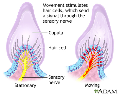 Vertigo-associated disordersPeripheral vertigo; Central vertigo; Dizziness; Benign positional vertigo; Benign paroxysmal positional vertigo Vertigo is a sensation of motion or spinning that is often described as dizziness.DizzinessDizziness is a term that is often used to describe 2 different symptoms: lightheadedness and vertigo. Lightheadedness is a feeling that you might fai...ImageRead Article Now Book Mark Article Vertigo is not the same as being lightheaded. People with vertigo feel as though they are actually spinning or moving, or that the world is spinning around them.Previous imagePlay SlideshowStop SlideshowNext image / Causes There are two types of vertigo, peripheral and central vertigo.Peripheral vertigo is due to a problem in the part of the inner ear that controls balance. These areas are called the vestibular labyrinth, or semicircular canals. The problem may also involve the vestibular nerve. This is the nerve between the inner ear and the brain stem.Peripheral vertigo may be caused by:Benign positional vertigo (benign paroxysmal positional vertigo, also known as BPPV) Benign positional vertigoBenign positional vertigo is the most common type of vertigo. Vertigo is the feeling that you are spinning or that everything is spinning around you...ImageRead Article Now Book Mark Article Certain medicines, such as aminoglycoside antibiotics, cisplatin, diuretics, or salicylates, which are toxic to the inner ear structures Injury (such as head injury) Inflammation of the vestibular nerve (neuronitis) Irritation and swelling of the inner ear (labyrinthitis) LabyrinthitisLabyrinthitis is irritation and swelling of the inner ear. It can cause vertigo and hearing loss.ImageRead Article Now Book Mark Article Meniere disease Meniere diseaseMénière disease is an inner ear disorder that affects balance and hearing.ImageRead Article Now Book Mark Article Pressure on the vestibular nerve, usually from a noncancerous tumor such as a meningioma or schwannomaCentral vertigo is due to a problem in the brain, usually in the brain stem or the back part of the brain (cerebellum).Central vertigo may be caused by:Blood vessel disease Certain drugs, such as anticonvulsants, aspirin, and alcohol Multiple sclerosis Multiple sclerosisMultiple sclerosis (MS) is an autoimmune disease that affects the brain and spinal cord (central nervous system).ImageRead Article Now Book Mark Article Seizures (rarely) SeizuresA seizure is the physical changes in behavior that occurs during an episode of specific types of abnormal electrical activity in the brain. The term ...ImageRead Article Now Book Mark Article Stroke Tumors (cancerous or noncancerous) Vestibular migraine, a type of migraine headacheMigraineA migraine is a type of headache. It may occur with symptoms such as nausea, vomiting, or sensitivity to light and sound. In most people, a throbbi...ImageRead Article Now Book Mark Article Symptoms The main symptom is a sensation that you or the room is moving or spinning. The spinning sensation may cause nausea and vomiting.Depending on the cause, other symptoms can include:Problem focusing the eyes Dizziness Hearing loss in one or both ears Loss of balance (may cause falls) Ringing in the ears Nausea and vomiting, leading to loss of body fluidsIf you have vertigo due to problems in the brain (central vertigo), you may have other symptoms, including:Difficulty swallowing Double vision Eye movement problems Facial paralysis Facial paralysisFacial paralysis means that a person is no longer able to move some or all of the muscles on one or both sides of the face.ImageRead Article Now Book Mark Article Slurred speech Weakness of the limbs Exams and Tests Examination by the health care provider may show:Problems walking due to loss of balance Eye movement problems or involuntary eye movements (nystagmus) NystagmusNystagmus is a term to describe uncontrollable movements of the eyes that may be:Side to side (horizontal nystagmus)Up and down (vertical nystagmus)R...ImageRead Article Now Book Mark Article Hearing loss Lack of coordination and balance Weakness Tests that may be done include:Blood tests Brainstem auditory evoked potential studies Caloric stimulation Caloric stimulationCaloric stimulation is a test that uses differences in temperature to diagnose damage to the acoustic nerve. This is the nerve that is involved in h...ImageRead Article Now Book Mark Article Electroencephalogram (EEG) Electroencephalogram (EEG)An electroencephalogram (EEG) is a test to measure the electrical activity of the brain.ImageRead Article Now Book Mark Article Electronystagmography ElectronystagmographyElectronystagmography is a test that looks at eye movements to see how well nerves in the brain are working. These nerves are:Vestibular nerve (eigh...Read Article Now Book Mark Article Head CT Head CTA head computed tomography (CT) scan uses many x-rays to create pictures of the head, including the skull, brain, eye sockets, and sinuses.ImageRead Article Now Book Mark Article Lumbar puncture Lumbar punctureCerebrospinal fluid (CSF) collection is a test to look at the fluid that surrounds the brain and spinal cord. CSF acts as a cushion, protecting the b...ImageRead Article Now Book Mark Article MRI scan of head and MRA scan of blood vessels of the brain MRIA magnetic resonance imaging (MRI) scan is an imaging test that uses powerful magnets and radio waves to create pictures of the body. It does not us...ImageRead Article Now Book Mark Article MRAMagnetic resonance angiography (MRA) is an MRI exam of the blood vessels. Unlike traditional angiography that involves placing a tube (catheter) int...ImageRead Article Now Book Mark Article Walking (gait) testingThe provider may perform certain head movements on you, such as the head-thrust test. These tests help tell the difference between central and peripheral vertigo. Treatment The cause of any brain disorder causing vertigo should be identified and treated when possible.To help res