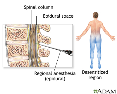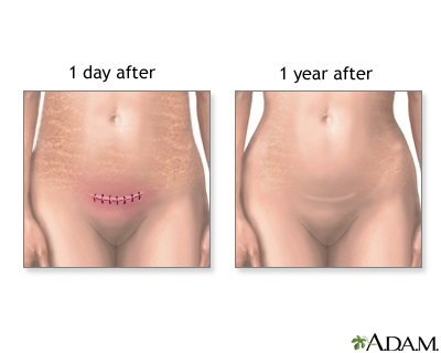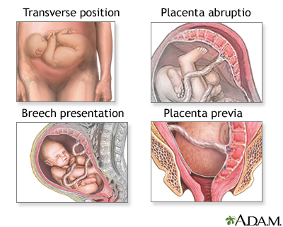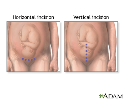 C-sectionAbdominal delivery; Abdominal birth; Cesarean birth; Pregnancy - cesareanA C-section is the delivery of a baby by making an opening in the mother's lower belly area. It is also called a cesarean delivery.Related video goes here for no-HTML5 browsers Description A C-section delivery is done when it is not possible or safe for the mother to deliver the baby through the vagina.The procedure is most often done while the woman is awake. The body is numbed from the chest to the feet using epidural or spinal anesthesia.Previous imagePlay SlideshowStop SlideshowNext image / 1. The surgeon makes a cut across the belly just above the pubic area. 2. The womb (uterus) and amniotic sac are opened.3. The baby is delivered through this opening.The health care team clears fluids from the baby's mouth and nose. The umbilical cord is cut. The health care provider will make sure that the infant's breathing is normal and other vital signs are stable.The mother is awake during the procedure so she will be able to hear and see her baby. In many cases, the woman is able to have a support person with her during the delivery.The surgery takes about 1 hour.No audio descriptionWith audio descriptionRelated video goes here for no-HTML5 browsersRelated video goes here for no-HTML5 browsers Why the Procedure Is Performed There are many reasons why a woman may need to have a C-section instead of a vaginal delivery. The decision will depend on your provider, where you are having the baby, your previous deliveries, and your medical history.Problems with the baby may include:Abnormal heart rate Abnormal position in the womb, such as crosswise (transverse) or feet-first (breech) Abnormal positionDuring labor and delivery, your baby must pass through your pelvic bones to reach the vaginal opening. The goal is to find the easiest way out. Cer...ImageRead Article Now Book Mark Article Developmental problems, such as hydrocephalus or spina bifida Multiple pregnancy (twins, triplets, or more) Health problems in the mother may include:Active genital herpes infection Large uterine fibroids near the cervix HIV infection in the mother Past C-section Past surgery on the uterus Severe illness, such as heart disease, preeclampsia or eclampsiaPreeclampsiaPreeclampsia is high blood pressure and signs of liver or kidney damage that occur in women after the 20th week of pregnancy. While it is rare, pree...ImageRead Article Now Book Mark Article EclampsiaEclampsia is the new onset of seizures or coma in a pregnant woman with preeclampsia. These seizures are not related to an existing brain condition....ImageRead Article Now Book Mark Article Problems at the time of labor or delivery may include:Baby's head is too large to pass through the birth canal Labor that takes too long or stops Very large baby Infection or fever during labor Problems with the placenta or umbilical cord may include:Placenta covers all or part of the opening to the birth canal (placenta previa) Placenta previaPlacenta previa is a problem of pregnancy in which the placenta grows in the lowest part of the womb (uterus) and covers all or part of the opening t...ImageRead Article Now Book Mark Article Placenta separates from the uterine wall (placenta abruptio) Placenta abruptioThe placenta is the organ that supplies nutrients and oxygen to the baby during pregnancy. Placental abruption occurs when the placenta detaches fro...Read Article Now Book Mark Article Umbilical cord comes through the opening of the birth canal before the baby (umbilical cord prolapse) Previous imagePlay SlideshowStop SlideshowNext image / Risks A C-section is a safe procedure. The rate of serious complications is very low. However, certain risks are higher after C-section than after vaginal delivery. These include:Infection of the bladder or uterus Injury to the urinary tract Higher average blood loss Most of the time, a blood transfusion is not needed, but risk of transfusion is higher.A C-section may also cause problems in future pregnancies. This includes a higher risk for:Placenta previa Placenta growing into the muscle of the uterus and has trouble separating after the baby is born (placenta accreta) Uterine rupture These conditions can lead to severe bleeding (hemorrhage), which may require blood transfusions or removal of the uterus (hysterectomy). After the Procedure Most women will remain in the hospital for 2 to 3 days after a C-section. Take advantage of the time to bond with your baby, get some rest, and receive some help with breastfeeding and caring for your baby.Most women will remain in the hospitalMost women will remain in the hospital for 2 to 3 days after a cesarean birth (C-section). Take advantage of the time to bond with your new baby, ge...ImageRead Article Now Book Mark Article Recovery takes longer than it would from a vaginal birth. You should walk around after the C-section to speed recovery. Pain medicines taken by mouth can help ease discomfort.Recovery after a C-section at home is slower than after a vaginal delivery. You may have bleeding from your vagina for up to 6 weeks. You will need to learn to care for your wound.Recovery after a C-section at homeYou are going home after a C-section. You should expect to need help caring for yourself and your newborn. Talk to your partner, parents, in-laws, ...Read Article Now Book Mark Article Outlook (Prognosis) Most mothers and infants do well after a C-section.Women who have a C-section may have a vaginal delivery if another pregnancy occurs, depending on:Vaginal delivery if another pregnancy o...If you had a cesarean birth (C-section) before, it does not mean that you will have to deliver the same way again. Many women can have vaginal deliv...Read Article Now Book Mark Article The type of C-section done Why the C-section was doneVaginal birth after cesarean (VBAC) delivery is very often successful. Not all hospitals or providers offer the option of VBAC. There is a small risk of uterine rupture, which can harm 