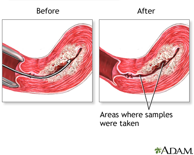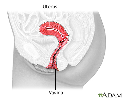 D and CDilation and curettage; Uterus scraping; Vaginal bleeding - dilation; Uterine bleeding - dilation; Menopause - dilationD and C (dilation and curettage) is a procedure to scrape and collect the tissue (endometrium) from inside the uterus.Dilation (D) is a widening of the cervix to allow instruments into the uterus. Curettage (C) is the scraping of tissue from the walls of the uterus. Description D and C, also called uterine scraping, may be performed in the hospital or in a clinic while you are under general or local anesthesia.GeneralGeneral anesthesia is treatment with certain medicines that puts you into a deep sleep-like state so you do not feel pain during surgery. After you ...Read Article Now Book Mark Article The health care provider will insert an instrument called a speculum into the vagina. This holds the vaginal canal open. Numbing medicine may be applied to the opening to the uterus (cervix).CervixThe cervix is the lower end of the womb (uterus). It is at the top of the vagina. It is about 2. 5 to 3. 5 centimeters (1 to 1. 3 inches) long. Th...ImageRead Article Now Book Mark Article The cervical canal is widened, and a curette (a metal loop on the end of a long, thin handle) is passed through the opening into the uterus cavity. The provider gently scrapes the inner layer of tissue, called the endometrium. Alternatively, a suction curette may be used to remove endometrial tissue. The tissue is collected for examination. Why the Procedure Is Performed This procedure may be done to:Diagnose or rule out conditions such as uterine cancer Uterine cancerEndometrial cancer is cancer that starts in the endometrium, the lining of the uterus (womb).ImageRead Article Now Book Mark Article Remove tissue after a miscarriage MiscarriageA miscarriage is the spontaneous loss of a fetus before the 20th week of pregnancy. Pregnancy losses after the 20th week are called stillbirths. Mi...ImageRead Article Now Book Mark Article Treat heavy menstrual bleeding, irregular periods, or bleeding between periods Bleeding between periodsThis article discusses vaginal bleeding that occurs between a woman's monthly menstrual periods. Such bleeding may be called "intermenstrual bleedin...ImageRead Article Now Book Mark Article Perform a therapeutic or elective abortion Your provider may also recommend a D and C if you have:Abnormal bleeding while you are on hormone replacement therapy An embedded intrauterine device (IUD) IUDYour choice of a birth control method depends on a number of factors, including your health, how often you have sexual intercourse, and whether or no...ImageRead Article Now Book Mark Article Bleeding after menopause Endometrial polyps (small lumps of tissue on the endometrium) Thickening of the uterus This list may not include all possible reasons for a D and C. Risks Risks related to D and C include:Puncture of the uterus Scarring of the uterine lining (Asherman syndrome, may lead to infertility later) Asherman syndromeAsherman syndrome is the formation of scar tissue in the uterine cavity. The problem most often develops after uterine surgery.ImageRead Article Now Book Mark Article InfertilityInfertility means you cannot get pregnant (conceive). There are 2 types of infertility:Primary infertility refers to couples who have not become preg...ImageRead Article Now Book Mark Article Tear of the cervixRisks due to anesthesia include:Reactions to medicines Problems breathingProblems breathingBreathing difficulty may involve:Difficult breathing Uncomfortable breathingFeeling like you are not getting enough airImageRead Article Now Book Mark Article Risks of any surgery include:Bleeding Infection After the Procedure The D and C procedure has few risks. It can provide relief from bleeding and can help diagnose cancer and other diseases.You may return to your normal activities as soon as you feel better, possibly even the same day. You may have vaginal bleeding, pelvic cramps, and back pain for a few days after the procedure. You can usually manage pain well with medicines. Avoid using tampons and having sexual intercourse for 1 to 2 weeks after the procedure.Open ReferencesReferencesBulun SE. Physiology and pathology of the female reproductive axis. In: Melmed S, Auchus RJ, Goldfine AB, Koenig RJ, Rosen CJ, eds. Williams Textbook of Endocrinology. 14th ed. Philadelphia, PA: Elsevier; 2020:chap 17.Ryntz T, Lobo RA. Abnormal uterine bleeding: etiology and management of acute and chronic excessive bleeding. In: Gershenson DM, Lentz GM, Valea FA, Lobo RA, eds. Comprehensive Gynecology. 8th ed. Philadelphia, PA: Elsevier; 2022:chap 26.Williams VL, Thomas S. Dilation and curettage. In: Fowler GC, ed. Pfenninger and Fowler's Procedures for Primary Care. 4th ed. Philadelphia, PA: Elsevier; 2020:chap 162.