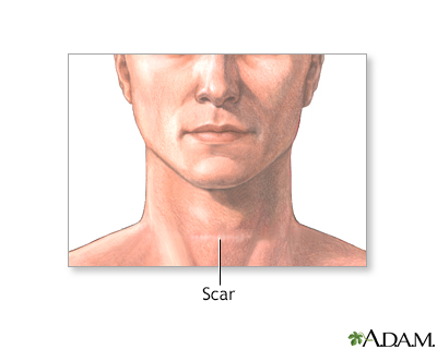 Parathyroid gland removalRemoval of parathyroid gland; Parathyroidectomy; Hyperparathyroidism - parathyroidectomy; PTH - parathyroidectomyParathyroidectomy is surgery to remove the parathyroid glands or parathyroid tumors. The parathyroid glands are right behind your thyroid gland in your neck. These glands help your body regulate the calcium level in your blood. Description You will receive general anesthesia (asleep and pain-free) for this surgery. General anesthesiaGeneral anesthesia is treatment with certain medicines that puts you into a deep sleep-like state so you do not feel pain during surgery. After you ...Read Article Now Book Mark Article Usually the parathyroid glands are removed using a 2 to 4 inch (in) or 5 to 10 centimeters (cm) surgical cut on your neck. During surgery:The cut is usually made in the center of your neck just under your Adam's apple. Your surgeon will look for the four parathyroid glands and remove any that are diseased. You may have a special blood test during surgery that will tell if all the diseased glands were removed. In rare cases, when all four of these glands need to be removed, part of one is transplanted into the forearm. Or, it is transplanted into a muscle in the front of your neck next to the thyroid gland. This helps ensure your body's calcium level stays at a healthy level. The specific type of surgery depends on where the diseased parathyroid glands are. Types of surgery include:Minimally invasive parathyroidectomy. You may receive a shot of a very small amount of radioactive tracer before this surgery. This helps highlight the diseased glands. If you have this shot, your surgeon will use a special probe, like a Geiger counter, to locate the parathyroid gland. Your surgeon will make a small cut (1 to 2 in; or 2.5 to 5 cm) on one side of your neck, and then remove the diseased gland through it. This procedure takes about 1 hour. Video-assisted parathyroidectomy. Your surgeon will make two small cuts in your neck. One is for instruments, and the other is for a scope with a camera. Your surgeon will use the camera to view the area and will remove the diseased glands with the instruments. Endoscopic parathyroidectomy. Your surgeon will make two or three small cuts in the front of your neck and one cut above the top of your collarbone. This reduces visible scarring, pain, and recovery time. This cut is less than 2 in (5 cm) long. The procedure to remove any diseased parathyroid glands is similar to video-assisted parathyroidectomy. Why the Procedure Is Performed Your health care provider may recommend this surgery if one or more of your parathyroid glands is producing too much parathyroid hormone. This condition is called hyperparathyroidism. It is often caused by a small non-cancerous (benign) tumor called an adenoma.HyperparathyroidismHyperparathyroidism is a condition in which 1 or more of the parathyroid glands in your neck produce too much parathyroid hormone (PTH).ImageRead Article Now Book Mark Article Your surgeon will consider many factors when deciding whether to do surgery and what type of surgery would be best for you. Some of these factors are: Your age Calcium levels in your urine and blood Whether you have symptoms Risks Risks of anesthesia and surgery in general are:Reactions to medicines or breathing problems Breathing problemsBreathing difficulty may involve:Difficult breathing Uncomfortable breathingFeeling like you are not getting enough airImageRead Article Now Book Mark Article Bleeding, blood clots, or infection BleedingBleeding is the loss of blood. Bleeding may be:Inside the body (internal)Outside the body (external)Bleeding may occur:Inside the body when blood le...ImageRead Article Now Book Mark Article Blood clotsBlood clots are clumps that occur when blood hardens from a liquid to a solid. A blood clot that forms inside one of your veins or arteries is calle...ImageRead Article Now Book Mark Article Risks of parathyroidectomy are:Injury to the thyroid gland or the need to remove part of the thyroid gland. Hypoparathyroidism (parathyroid glands not producing enough parathyroid hormone). This can lead to low calcium levels that are dangerous to your health. HypoparathyroidismHypoparathyroidism is a disorder in which the parathyroid glands in the neck do not produce enough parathyroid hormone (PTH).ImageRead Article Now Book Mark Article Injury to the nerves going to the muscles that move your vocal cords. You may have a hoarse or weaker voice which could be temporary or permanent. Difficulty breathing. This is not common and usually goes away several weeks or months after surgery. Before the Procedure Parathyroid glands are very small. You may need to have tests that show exactly where your glands are. This will help your surgeon find your parathyroid glands during surgery. Two of the tests you may have are a CT scan and an ultrasound. Sometimes your surgeon will order a nuclear medicine scan, known as a Sestamibi scan prior to your surgery to locate all of the parathyroid glands.CT scanA computed tomography (CT) scan is an imaging method that uses x-rays to create pictures of cross-sections of the body. Related tests include:Abdomin...ImageRead Article Now Book Mark Article UltrasoundUltrasound uses high-frequency sound waves to make images of organs and structures inside the body.ImageRead Article Now Book Mark Article Tell your surgeon or nurse if:You are or could be pregnant You are taking any medicines, including medicines, supplements, or herbs you bought without a prescriptionDuring the week before your surgery:You may be asked to temporarily stop taking medicines that keep your blood from clotting. These medicines are called blood thinners. This includes over-the-counter medicines and supplements such as aspirin, ibuprofen (Advil, Motrin), naproxen (Aleve, Naprosyn), and vitamin E. Many prescription medicines are also blood thinners. Ask your surgeon which medicines you should still take on the day of surgery.