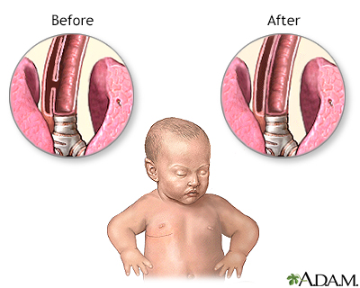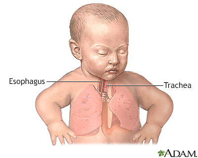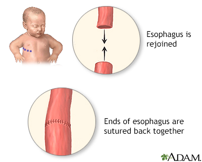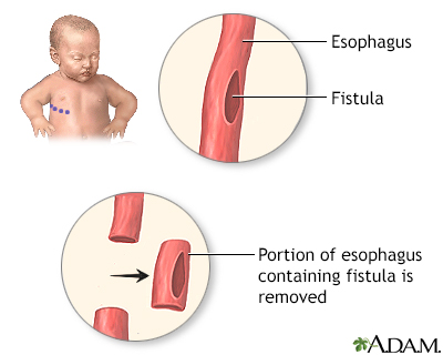 Tracheoesophageal fistula and esophageal atresia repairTEF repair; Esophageal atresia repairTracheoesophageal fistula and esophageal atresia repair is surgery to repair two birth defects in the esophagus and trachea. The defects usually occur together. Description The esophagus is the tube that carries food from the mouth to the stomach. The trachea (windpipe) is the tube that carries air into and out of the lungs.The defects usually occur together. They may occur along with other problems as part of a syndrome (group of problems):Esophageal atresia (EA) occurs when the upper part of the esophagus does not connect with the lower esophagus and stomach. Esophageal atresiaEsophageal atresia is a birth defect in which the esophagus does not develop properly. The esophagus is the tube that normally carries food from the...Read Article Now Book Mark Article Tracheoesophageal fistula (TEF) is an abnormal connection between the upper part of the esophagus and the trachea or windpipe. This surgery is almost always done soon after birth. Both defects can often be repaired at the same time. Briefly, the surgery takes place this way:Medicine (anesthesia) is given so that the baby is in a deep sleep and pain-free during surgery. The surgeon makes a cut on the side of the chest between the ribs. The fistula between the esophagus and windpipe is closed. The upper and lower portions of the esophagus are sewn together if possible. Often the two parts of the esophagus are too far apart to sew together right away. In this case:Only the fistula is repaired during the first surgery. A gastrostomy tube (a tube that goes through the skin into the stomach) may be placed to give your child nutrition. Your child will have another surgery later to repair the esophagus. Sometimes the surgeon will wait 2 to 4 months before doing the surgery. Waiting allows your baby to grow or have other problems treated. If your child's surgery is delayed:A gastrostomy tube (G-tube) will be placed through the abdominal wall into the stomach. Numbing medicines (local anesthesia) will be used so that your baby does not feel pain. Gastrostomy tubeA gastrostomy feeding tube (G-tube) insertion is the placement of a feeding tube through the skin and the stomach wall. It goes directly into the st...ImageRead Article Now Book Mark Article At the same time the tube is placed, the surgeon may lengthen your baby's esophagus with special techniques. This will make the future surgery easier. This process may need to be repeated, sometimes several times, before repair is possible. Why the Procedure Is Performed Tracheoesophageal fistula and esophageal atresia are life-threatening problems. They need to be treated right away. If these problems are not treated:Your child may breathe saliva and fluids from the stomach into the lungs. This is called aspiration. It can cause choking and pneumonia (lung infection). AspirationAspiration means to draw in or out using a sucking motion. It has two meanings:Breathing in a foreign object (for example, sucking food into the air...ImageRead Article Now Book Mark Article Your child cannot swallow and digest at all if the esophagus does not connect to the stomach. Risks Risks of anesthesia and surgery in general include:Reactions to medicines Breathing problems Breathing problemsBreathing difficulty may involve:Difficult breathing Uncomfortable breathingFeeling like you are not getting enough airImageRead Article Now Book Mark Article Bleeding, blood clots, or infection BleedingBleeding is the loss of blood. Bleeding may be:Inside the body (internal)Outside the body (external)Bleeding may occur:Inside the body when blood le...ImageRead Article Now Book Mark Article Risks of this surgery include:Collapsed lung (pneumothorax) PneumothoraxA collapsed lung occurs when air escapes from the lung. The air then can fill the space outside of the lung between the lung and chest wall. This b...ImageRead Article Now Book Mark Article Food leakage from the area that is repaired Low body temperature (hypothermia) HypothermiaHypothermia is dangerously low body temperature, below 95°F (35°C).ImageRead Article Now Book Mark Article Narrowing of the repaired organs Reopening of the fistula Before the Procedure Your baby will be admitted to the neonatal intensive care unit (NICU) as soon as the doctors diagnose either of these problems.Your baby will receive nutrition by vein (intravenous, or IV) and may also be on a breathing machine (ventilator). The care team may use suction to keep fluids from going into the lungs.Some infants who are premature, have a low birth weight, or have other birth defects beside TEF and/or EA may not be able to have surgery until they grow larger or until other problems have been treated or have gone away. After the Procedure After surgery, your child will be cared for in the hospital's NICU. Additional treatments after surgery usually include:Antibiotics as needed, to prevent infection Breathing machine (ventilator) Chest tube (a tube through the skin into the chest wall) to drain air and fluids from the space between the outside of the lung and the inside of the chest cavity Intravenous (IV) fluids, including nutrition IntravenousIntravenous means "within a vein. " Most often it refers to giving medicines or fluids through a needle or tube inserted into a vein. This allows th...Read Article Now Book Mark Article Oxygen Pain medicines as needed If both the TEF and EA are repaired:A tube is placed through the nose into the stomach (nasogastric tube) during the surgery. Feedings are usually started through this tube a few days after surgery. Feedings by mouth are started slowly. Your baby may need feeding therapy. If only the TEF is repaired, a G-tube is used for feedings until the atresia can be repaired. Your baby may also need continuous or frequent suction to clear secretions from the upper esophagus.While your baby is in the hospital, the care team will show you how to use and replace the G-tub