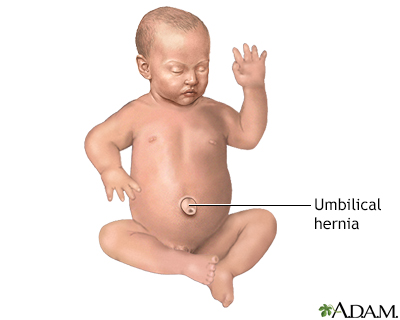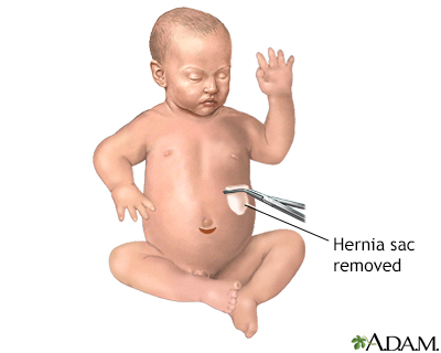 Umbilical hernia repairUmbilical hernia surgery; Umbilical herniorrhaphyUmbilical hernia repair is surgery to repair an umbilical hernia. An umbilical hernia is a sac (pouch) formed from the inner lining of your belly (abdominal cavity) that pushes through a hole in the abdominal wall at the belly button.Umbilical herniaAn umbilical hernia is an outward bulge in the area around the belly button. It occurs when internal organs or the abdominal lining bulges through t...ImageRead Article Now Book Mark Article Description You will probably receive general anesthesia (asleep and pain-free) for this surgery. If your hernia is small, you may receive spinal, epidural block, or local anesthesia and medicine to relax you. If general anesthesia is not used, you will be awake but pain-free.General anesthesiaGeneral anesthesia is treatment with certain medicines that puts you into a deep sleep-like state so you do not feel pain during surgery. After you ...Read Article Now Book Mark Article Spinal, epidural blockSpinal and epidural anesthesia are procedures that deliver medicines that numb parts of your body to block pain. They are given through shots in or ...ImageRead Article Now Book Mark Article Your surgeon will most often make a curved surgical cut following the natural skin lines under your belly button.Your surgeon will find your hernia and separate it from the tissues around it. Then your surgeon will gently push the contents of the hernia (either fat or intestine) back into the abdomen. Strong stitches will be used to repair the hole associated with the umbilical hernia. Your surgeon may also place a piece of mesh over the weak area (usually not in children) to make it stronger and less likely to come back.An umbilical hernia can also be repaired using a laparoscope. This is a thin, lighted tube that lets the surgeon see inside your belly. The scope will be inserted through one of several small cuts. The instruments will be inserted through the other cuts.If your child is having this surgery, your surgeon will discuss the type of anesthesia your child will receive. Your surgeon will also describe how the surgery will be done.Related video goes here for no-HTML5 browsers Why the Procedure Is Performed CHILDRENUmbilical hernias are fairly common in children. A hernia at birth pushes the belly button out. It shows more when a baby cries because the pressure from crying makes the hernia bulge out more.In infants, the problem is not usually treated with surgery. Many times, the umbilical hernia shrinks and closes on its own by the time a child is 3 or 4 years old.Umbilical hernia repair may be needed in children because:The hernia is painful and stuck in the bulging position. The blood supply to the intestine is restricted. The hernia has not closed by age 3 or 4. The hernia is very large or unacceptable to parents because of how it makes their child look. Even in these cases, the surgeon will probably suggest waiting until your child is 3 or 4 to see if the hernia closes on its own since an early umbilical hernia repair is more likely to recur and exposes children to anesthesia earlier in life.Related video goes here for no-HTML5 browsersADULTSUmbilical hernias also occur in adults. They are seen more in overweight people and in women, especially after pregnancy. They tend to get bigger over time.Smaller hernias with no symptoms sometimes can be watched. Surgery may pose greater risks than the hernia.Without surgery, there is a risk that some fat or part of the intestine will get stuck (incarcerated) in the hernia and become impossible to push back in. This is usually painful. If the blood supply to this area is cut off (strangulation), urgent surgery is needed. You may experience nausea or vomiting, and the bulging area may turn blue or a darker color.To avoid this problem, surgeons often recommend repairing umbilical hernias in adults. Surgery is also used for hernias that are getting larger or are painful. Surgery secures the weakened abdominal wall tissue (fascia) and closes any holes.Get medical care right away if you have a painful hernia or a hernia that does not get smaller when you are lying down or that you cannot push back in. Risks The risks of surgery for umbilical hernia are usually very low unless the person also has other serious medical problems.Risks of anesthesia and surgery in general are:Reactions to medicines or breathing problems Breathing problemsBreathing difficulty may involve:Difficult breathing Uncomfortable breathingFeeling like you are not getting enough airImageRead Article Now Book Mark Article Bleeding, blood clots, or infectionBleedingBleeding is the loss of blood. Bleeding may be:Inside the body (internal)Outside the body (external)Bleeding may occur:Inside the body when blood le...ImageRead Article Now Book Mark Article Risks of umbilical hernia surgery include any of the following:Injury to the small or large intestine (rare) Hernia comes back (small risk) Before the Procedure Your surgeon or anesthesia doctor (anesthesiologist) will see you and give you instructions for you or your child.The anesthesiologist will discuss your (or your child's) medical history to determine the right amount and type of anesthesia to use.Tell your surgeon or nurse if:You are or could be pregnant. You are taking any medicines, including medicines, drugs, supplements, or herbs you bought without a prescription.Planning for your surgery:If you have diabetes, heart disease, or other medical conditions, your surgeon may ask you to see the health care provider who treats you for these conditions. If you smoke, it's important to cut back or quit. Smoking can slow healing and increase the risk for blood clots. Ask your provider for help quitting smoking. If needed, prepare your home to make it easier to recover after surgery. Ask your surgeon if you need to arrange to have someone drive you home after your surgery.During the weeks before your surgery:You may be asked to temporarily s