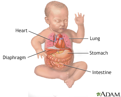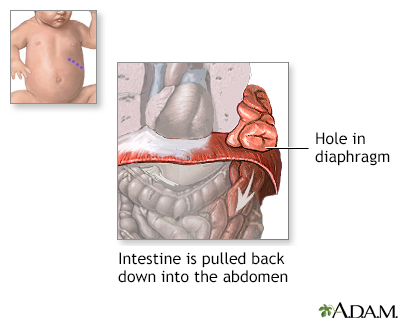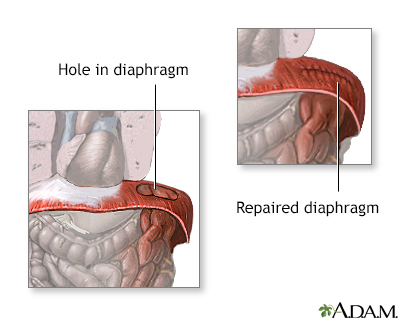 Congenital diaphragmatic hernia repairDiaphragmatic hernia - surgeryCongenital diaphragmatic hernia (CDH) repair is surgery to close an opening or space in a baby's diaphragm. This opening is called a hernia. It is a rare type of birth defect. Congenital means the problem is present at birth.Congenital diaphragmatic herniaA diaphragmatic hernia is a birth defect in which there is an abnormal opening in the diaphragm. The diaphragm is the muscle between the chest and a...ImageRead Article Now Book Mark Article Description Until the surgery is done, and usually for some time afterwards, nearly all infants need a breathing machine to improve their oxygen levels. Many babies with CDH will require extracorporeal membrane oxygenation (ECMO), which uses a pump to circulate blood through an artificial lung and back into the bloodstream of the baby.Extracorporeal membrane oxygenationExtracorporeal membrane oxygenation (ECMO) is a treatment that uses a pump to circulate blood through an artificial lung back into the bloodstream of...ImageRead Article Now Book Mark Article The surgery is done while your child is under general anesthesia (asleep and not able to feel pain). The surgeon usually makes a cut (incision) in the belly under the lower ribs. This allows the organs in the area to be reached. The surgeon gently pulls these organs down into place through the opening in the diaphragm and into the abdominal cavity.General anesthesiaGeneral anesthesia is treatment with certain medicines that puts you into a deep sleep-like state so you do not feel pain during surgery. After you ...Read Article Now Book Mark Article In less severe cases, the surgery can be done using smaller incisions in the chest. A small video camera called a thoracoscope is placed through one of the incisions. This allows the surgeon to view inside the chest. Instruments to repair the hole in the diaphragm are placed through the other incisions.In either type of operation, the surgeon repairs the hole in the diaphragm. If the hole is small, it may be repaired with stitches. Otherwise, an artificial patch is used to cover the hole. Why the Procedure Is Performed The diaphragm is a muscle. It is essential for normal breathing. It separates the chest cavity (where the heart and lungs are) from the belly area.In a child with CDH, the diaphragm muscle is not completely formed and there is an abnormally large opening. The CDH opening allows organs from the belly (stomach, spleen, liver, and intestines) to go up into the chest cavity where the lungs are. This can prevent the lungs from growing and developing normally in the womb. The blood vessels in the lungs can also develop abnormally. This can cause difficulty breathing both before and after the repair surgery. It can result in not enough oxygen getting into the baby's body.Depending on how much space in the chest is taken up by the abdominal organs, and when this happened during development in the womb, there can be varying outcomes.A diaphragmatic hernia can be life threatening and most babies with CDH are very ill. Surgery to repair CDH must be done as early as possible after the baby is born. Even after surgery, some babies' lungs are not able to function on their own because they are so underdeveloped. Risks Risks for this surgery include:Breathing problems, which may be severe Breathing problemsBreathing difficulty may involve:Difficult breathing Uncomfortable breathingFeeling like you are not getting enough airImageRead Article Now Book Mark Article Bleeding BleedingBleeding is the loss of blood. Bleeding may be:Inside the body (internal)Outside the body (external)Bleeding may occur:Inside the body when blood le...ImageRead Article Now Book Mark Article Collapsed lung Collapsed lungA collapsed lung occurs when air escapes from the lung. The air then can fill the space outside of the lung between the lung and chest wall. This b...ImageRead Article Now Book Mark Article Lung problems that do not go away Infection Reactions to medicines Before the Procedure Babies born with CDH usually need a breathing tube following birth and are admitted to a neonatal intensive care unit (NICU). It may be days or weeks before the baby is stable enough for surgery. Because the condition is life threatening and transporting a very ill newborn is risky, babies who are known to have CDH should be delivered in a center with pediatric surgeons and neonatologists.In the NICU, your baby will probably need a breathing machine (mechanical ventilator) before the surgery. This helps the baby breathe. Mechanical ventilatorA mechanical ventilator is a machine that helps with breathing. This article discusses the use of mechanical ventilators in infants.Read Article Now Book Mark Article If your child is very sick, a heart-lung bypass machine (ECMO) may be needed to do the work of the heart and lungs. Before surgery, your baby will have x-rays and regular blood tests to see how well the lungs are working. A light sensor (called a pulse oximeter) is taped to your baby's skin to monitor the oxygen level in the blood. x-raysX-rays are a type of electromagnetic radiation, just like visible light. An x-ray machine sends individual x-ray waves through the body. The images...ImageRead Article Now Book Mark Article Your baby may be given medicines to regulate blood pressure and stay comfortable.Your baby will have tubes placed:From the mouth or nose to the stomach to keep air out of the stomach In an artery to monitor blood pressure In a vein to deliver nutrients and medicines After the Procedure Your baby will be on a breathing machine after the surgery and will stay in the hospital for several weeks. Once taken off the breathing machine, your baby may still need oxygen and medicines for a while.Feedings will start after your baby's bowels start working. Feedings are usually given through a small, soft feeding tube from the mouth or nose into the stomach or small intestine until your baby can take milk by mouth.Ne