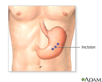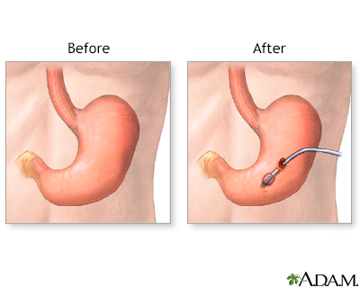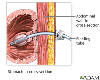 Feeding tube insertion - gastrostomyGastrostomy tube insertion; G-tube insertion; PEG tube insertion; Stomach tube insertion; Percutaneous endoscopic gastrostomy tube insertionA gastrostomy feeding tube (G-tube) insertion is the placement of a feeding tube through the skin and the stomach wall. It goes directly into the stomach. Description Gastrostomy feeding tube insertion is done in part using a procedure called endoscopy. This is a way of looking inside the body using a flexible tube with a small camera on the end of it. The endoscope is inserted through the mouth and down the esophagus, which leads to the stomach.EndoscopyEndoscopy is a way of looking inside the body using a flexible tube that has a small camera and light on the end of it. This instrument is called an...ImageRead Article Now Book Mark Article After the endoscopy tube is inserted into the stomach, the skin over the left side of the belly (abdomen) area is cleaned and numbed. Your surgeon makes a small surgical cut in this area. The G-tube is inserted through this cut into the stomach. The tube is small, flexible, and hollow. Your surgeon uses stitches to close the stomach around the tube. Why the Procedure Is Performed Gastrostomy feeding tubes are put in for different reasons. They may be needed for a short time or permanently. This procedure may be used for:Babies with birth defects of the mouth, esophagus, or stomach (for example, esophageal atresia or tracheal esophageal fistula) Esophageal atresiaEsophageal atresia is a birth defect in which the esophagus does not develop properly. The esophagus is the tube that normally carries food from the...Read Article Now Book Mark Article FistulaA fistula is an abnormal connection between two body parts, such as an organ or blood vessel and another structure. Fistulas are usually the result ...ImageRead Article Now Book Mark Article People who cannot swallow correctly People who cannot take enough food by mouth to stay healthy People who often breathe in food when eating Risks Risks for surgical or endoscopic feeding tube insertion are: Bleeding Infection Before the Procedure You will be given a sedative and a painkiller. In most cases, these medicines are given through a vein (IV line) in your arm. You should feel no pain and not remember the procedure.IVIntravenous means "within a vein. " Most often it refers to giving medicines or fluids through a needle or tube inserted into a vein. This allows th...Read Article Now Book Mark Article A numbing medicine may be sprayed into your mouth to prevent the urge to cough or gag when the endoscope is inserted. A mouth guard will be inserted to protect your teeth and the endoscope.Dentures must be removed. After the Procedure This is most often a simple surgery with a good outlook. Follow any self-care instructions you're given, including:Self-care instructionsA PEG (percutaneous endoscopic gastrostomy) feeding tube insertion is the placement of a feeding tube through the skin and the stomach wall. It goes...ImageRead Article Now Book Mark Article How to care for the skin around the tube Signs and symptoms of infection What to do if the tube is pulled out Signs and symptoms of tube blockage How to empty the stomach through the tube How and what to feed through the tube How to hide the tube under clothing What normal activities can be continued Outlook (Prognosis) The stomach and abdomen will heal in 5 to 7 days. Moderate pain can be treated with medicine. Feedings will start slowly with clear liquids, and increase slowly.Open ReferencesReferencesKessel D, Robertson I. Treating gastrointestinal conditions. In: Kessel D, Robertson I, eds. Interventional Radiology: A Survival Guide. 4th ed. Philadelphia, PA: Elsevier; 2017:chap 42.Murray TE, Lee MJ. Gastrostomy and jejunostomy. In: Mauro MA, Murphy KP, Thomson KR, Venbrux AC, Morgan RA, eds. Image-Guided Interventions. 3rd ed. Philadelphia, PA: Elsevier; 2021:chap 91.Twyman SL, Davis PW. Percutaneous endoscopic gastrostomy placement and replacement. In: Fowler GC, ed. Pfenninger and Fowler's Procedures for Primary Care. 4th ed. Philadelphia, PA: Elsevier; 2020:chap 92.