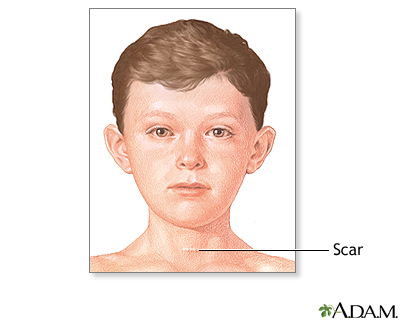 BACK TOTOP Browse A-ZSearchBrowse A-ZABCDEFGHIJKLMNOPQRSTUVWXYZ0-9 E-mail FormEmail ResultsName:Email address:Recipients Name:Recipients address:Message: Print-FriendlyBookmarksbookmarks-menuTracheostomyA tracheostomy is a surgical procedure to create an opening through the neck into the trachea (windpipe). A tube is most often placed through this opening to provide an airway and to remove secretions from the lungs. This tube is called a tracheostomy tube or trach tube. Description General anesthesia is used, unless the situation is critical. If that happens, a numbing medicine is placed into the area to help you feel less pain during the procedure. Other medicines are also given to relax and calm you (if there is time).General anesthesiaGeneral anesthesia is treatment with certain medicines that puts you into a deep sleep-like state so you do not feel pain during surgery. After you ...Read Article Now Book Mark Article The neck is cleaned and draped. Surgical cuts are made to reveal the tough cartilage rings that form the outer wall of the trachea. The surgeon creates an opening into the trachea and inserts a tracheostomy tube. Why the Procedure Is Performed A tracheostomy may be done if you have:A large object blocking the airway An inability to breathe on your own An inherited abnormality of the larynx or trachea Inhaled (breathed in) harmful material such as smoke, steam, or other toxic gases that swell and block the airway Cancer of the neck, which can restrict breathing by pressing on the airway Paralysis of the muscles that cause swallowing ParalysisMuscle function loss is when a muscle does not work or move normally. The medical term for complete loss of muscle function is paralysis.ImageRead Article Now Book Mark Article Severe neck or mouth injuries Surgery around the voice box (larynx) that prevents normal breathing and swallowing Risks The risks for any anesthesia are:Problems breathing Reactions to medicines, including heart attack and stroke, or allergic reaction (rash, swelling, breathing difficulty) Heart attackMost heart attacks are caused by a blood clot that blocks one of the coronary arteries. The coronary arteries bring blood and oxygen to the heart. ...ImageRead Article Now Book Mark Article StrokeA stroke occurs when blood flow to a part of the brain stops. A stroke is sometimes called a "brain attack. " If blood flow is cut off for longer th...ImageRead Article Now Book Mark Article RashRashes involve changes in the color, feeling or texture of your skin.ImageRead Article Now Book Mark Article SwellingSwelling is the enlargement of organs, skin, or other body parts. It is caused by a buildup of fluid in the tissues. The extra fluid can lead to a ...ImageRead Article Now Book Mark Article Breathing difficultyBreathing difficulty may involve:Difficult breathing Uncomfortable breathingFeeling like you are not getting enough airImageRead Article Now Book Mark Article The risks for any surgery are:Bleeding Infection Nerve injury, including paralysis Scarring Other risks include:Abnormal connection between the trachea and major blood vessels Damage to the thyroid gland Erosion of the trachea (rare) ErosionErosion is a breakdown of the outer layers of the skin, usually because of a: CutScrapeInflammationImageRead Article Now Book Mark Article Puncture of the lung and lung collapse Lung collapseA collapsed lung occurs when air escapes from the lung. The air then can fill the space outside of the lung between the lung and chest wall. This b...ImageRead Article Now Book Mark Article Injury to the esophagus Scar tissue in the trachea that causes pain or trouble breathing After the Procedure A person may have a sense of panic and feel unable to breathe and speak when first waking up after the tracheostomy and placement of the tracheostomy tube. This feeling will lessen over time. Medicines may be given to help reduce the person's stress.If the tracheostomy is temporary (for example, if the condition leading to its placement can be improved or cured), the tube will eventually be removed. Healing usually occurs quickly, leaving a small scar. Sometimes, a surgical procedure may be needed to close the site (stoma).Occasionally a stricture, or narrowing of the trachea may develop, which may restrict breathing.If the tracheostomy tube is permanent, the hole remains open. Outlook (Prognosis) Most people need 1 to 3 days to adapt to breathing through a tracheostomy tube. It will take some time to learn how to communicate with others. At first, it may be impossible for the person to talk or make sounds.After training and practice, most people can learn to talk with a tracheostomy tube, many times by using special speaking valves. People or family members learn how to take care of the tracheostomy during the hospital stay. Home-care service may also be available.You should be able to go back to your normal lifestyle. When you are outside, you can wear a loose covering (a scarf or other protection) over the tracheostomy stoma (hole). Use safety precautions when you are exposed to water, aerosols, powder, or food particles.Open ReferencesReferencesCameron J. Chest wall, mediastinum, and trachea. In: Cameron J, ed. Current Surgical Therapy. 14th ed. Philadelphia, PA: Elsevier; 2023:chap 15.Greenwood JC, Winters ME. Tracheostomy care. In: Roberts JR, Custalow CB, Thomsen TW, eds. Roberts and Hedges' Clinical Procedures in Emergency Medicine and Acute Care. 7th ed. Philadelphia, PA: Elsevier; 2019:chap 7.AllVideoImagesTogTracheostomy - seriesPresentation Tracheostomy - seriesPresentation Self Care Tracheostomy careTracheostomy tube - speakingTracheostomy tube - eatingRelated Information Muscle function loss(Symptoms)Decreased alertness(Symptoms) Review Date: 1/1/2025 Reviewed By: Frank D. Brodkey, MD, FCCM, Associate Professor, Section of Pulmonary and Critical Care Medicine, University of Wisconsin School of Medicine and Public Health, Madison, WI. Also reviewed by David C. Dugdale, MD, Me