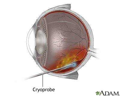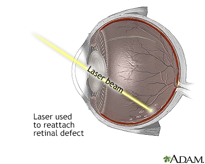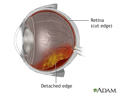 Retinal detachment repairScleral buckling; Vitrectomy; Pneumatic retinopexy; Laser retinopexy; Rhegmatogenous retinal detachment repairRetinal detachment repair is eye surgery to place a retina back into its normal position. The retina is the light-sensitive tissue in the back of the eye. Detachment means that it has pulled away from the layers of tissue around it. RetinaThe retina is the light-sensitive layer of tissue at the back of the eyeball. Images that come through the eye's lens are focused on the retina. Th...ImageRead Article Now Book Mark Article This article describes the repair of rhegmatogenous retinal detachments. These occur due to a hole or tear in the retina. Description Most retinal detachment repair operations are urgent. If holes or tears in the retina are found before the retina detaches, the eye doctor can close the holes using a laser. This procedure is most often done in the eye doctor's office.In any surgery to repair a retinal detachment there are two steps. In one step, a scar around the tear or hole is created usually using a cryoprobe or a laser. The other step is to "push" the separated layers of the retina back together. There are two ways: push them together from the inside using a gas bubble inside the eye (retinopexy) or push them together from the outside using a scleral buckle. The type of detachment (size, location) will determine which step occurs first.If the retina has just started to detach, a procedure called pneumatic retinopexy may be done to repair it.Pneumatic retinopexy (gas bubble placement) is most often an office procedure. The eye doctor injects a bubble of gas into the eye. You are then positioned so the gas bubble floats up against the hole in the retina and pushes it back into place. The doctor will use a laser to permanently seal the hole.Severe detachments need more advanced surgery. The following procedures are done in a hospital or outpatient surgery center:The scleral buckle method indents the wall of the eye inward so that it meets the hole in the retina. Scleral buckling can be done using numbing medicine while you are awake (local anesthesia) or when you are asleep and pain free (general anesthesia). General anesthesiaGeneral anesthesia is treatment with certain medicines that puts you into a deep sleep-like state so you do not feel pain during surgery. After you ...Read Article Now Book Mark Article The vitrectomy procedure uses very small devices inside the eye to release tension on the retina. This allows the retina to move back into its proper position. Most vitrectomies are done with numbing medicine while you are awake.In complex cases, both procedures may be done at the same time. Why the Procedure Is Performed Retinal detachments do not get better without treatment. Repair is needed to prevent permanent vision loss.Vision lossThere are many types of eye problems and vision disturbances, such as: Halos Blurred vision (the loss of sharpness of vision and the inability to see...ImageRead Article Now Book Mark Article Related video goes here for no-HTML5 browsersHow quickly the surgery needs to be done depends on the location and extent of the detachment. If possible, the surgery should be done the same day if the detachment has not affected the central vision area (the macula). This can help prevent further detachment of the retina. It also will increase the chance of preserving good vision.If the macula detaches, it is too late to restore normal vision. Surgery can still be done to prevent total blindness. In these cases, eye doctors can wait a week to 10 days to schedule surgery. Risks Risks for retinal detachment surgery include:Bleeding Detachment that is not completely fixed (may require more surgeries) Increase in eye pressure (elevated intraocular pressure) InfectionGeneral anesthesia may be needed. The risks for any anesthesia are:Reactions to medicines Problems breathingYou may not recover full vision. After the Procedure The chances of successful reattachment of the retina depend on the number of holes, their size, and whether there is scar tissue in the area. In most cases, the procedures do not require an overnight hospital stay. You may need to limit your physical activity for some time.If the retina is repaired using the gas bubble procedure, you need to keep your head face down or turned to one side for several days or weeks. It is important to maintain this position so the gas bubble pushes the retina into place.People with a gas bubble in the eye may not fly or go to high altitudes until the gas bubble dissolves. This most often happens within a few weeks. Outlook (Prognosis) Most of the time, the retina can be reattached with one operation. However, some people will need several surgeries. More than 9 out of 10 detachments can be repaired. Failure to repair the retina always results in loss of vision to some degree.When a detachment occurs, the photoreceptors (rods and cones) start to degenerate. The sooner the detachment is repaired, the sooner the retina will begin to recover. However, once the retina has detached, its rods and cones that detect light (the photoreceptors) may never recover completely.After surgery, the quality of vision depends on where the detachment occurred, and the cause:If the central area of vision (macula) was not involved, vision will usually be very good. If the macula was involved for less than 1 week, vision will usually be improved, but not to 20/20 (normal). If the macula was detached for a long time, some vision will return, but it will be very impaired. Often, it will be less than 20/200, the limit for legal blindness. Open ReferencesReferencesCioffi GA, Liebmann JM. Diseases of the visual system. In: Goldman L, Cooney KA, eds. Goldman-Cecil Medicine. 27th ed. Philadelphia, PA: Elsevier; 2024:chap 391.Guluma K, Lee JE. Ophthalmology. In: Walls RM, ed. Rosen's Emergency Medicine: Concepts and Clinical Practice. 10th ed. Philadelphia, PA: Elsevier; 2023:chap 57.Todorich B