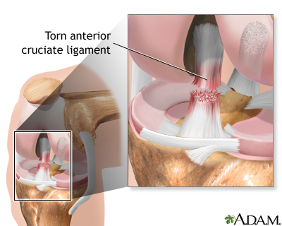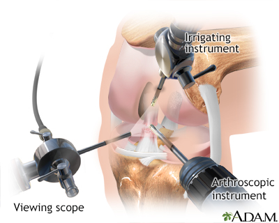 Knee arthroscopyKnee scope - arthroscopic lateral retinacular release; Synovectomy - knee; Patellar (knee) debridement; Meniscus repair; Lateral release; Knee surgery; Meniscus - arthroscopy; Collateral ligament - arthroscopyKnee arthroscopy is surgery that uses a tiny camera to look inside your knee. Small cuts are made to insert the camera and small surgical tools into your knee for the procedure. Description Three different types of pain relief (anesthesia) may be used for knee arthroscopy surgery:Local anesthesia. Your knee may be numbed with pain medicine. You may also be given medicines that relax you. You will stay awake. Spinal anesthesia. This is also called regional anesthesia. The pain medicine is injected into a space in your spine. You will be awake but will not be able to feel anything below your waist. Spinal anesthesiaSpinal and epidural anesthesia are procedures that deliver medicines that numb parts of your body to block pain. They are given through shots in or ...ImageRead Article Now Book Mark Article General anesthesia. You will be asleep and pain-free. General anesthesiaGeneral anesthesia is treatment with certain medicines that puts you into a deep sleep-like state so you do not feel pain during surgery. After you ...Read Article Now Book Mark Article Regional nerve block (femoral or adductor canal block). This is another type of regional anesthesia. The pain medicine is injected around the nerve in your groin or leg. You will be asleep during the operation. This type of anesthesia will block out pain so that you need less general anesthesia.A cuff-like device may be put around your thigh to help control bleeding during the procedure.The surgeon will make 2 or 3 small cuts around your knee. Fluid (saline) will be pumped into your knee to inflate the knee.A narrow tube with a tiny camera on the end will be inserted through one of the cuts. The camera is attached to a video monitor that lets the surgeon see inside the knee. The surgeon may put other small surgery tools inside your knee through the other cuts. The surgeon will then fix or remove the problem in your knee.At the end of your surgery, the saline will be drained from your knee. The surgeon will close your cuts with sutures (stitches) and cover them with a dressing. Many surgeons take pictures of the procedure from the video monitor. You may be able to view these pictures after the operation so that you can see what was done. Why the Procedure Is Performed Arthroscopy may be recommended for these knee problems:Torn meniscus. Meniscus is cartilage that cushions the space between the bones in the knee. Surgery is done to repair or remove it. MeniscusThe meniscus is a c-shaped piece of cartilage in your knee joint. You have two in each knee. Meniscus cartilage is a tough but flexible tissue that ...ImageRead Article Now Book Mark Article Torn or damaged anterior cruciate ligament (ACL) or posterior cruciate ligament (PCL). Anterior cruciateAn anterior cruciate ligament injury is the over-stretching or tearing of the anterior cruciate ligament (ACL) in the knee. A tear may be partial or...ImageRead Article Now Book Mark Article Posterior cruciateA ligament is a band of tissue that connects a bone to another bone. The posterior cruciate ligament (PCL) is located inside your knee joint and con...ImageRead Article Now Book Mark Article Swollen (inflamed) or damaged lining of the joint. This lining is called the synovium. Kneecap (patella) that is out of position (misalignment). Small pieces of broken cartilage in the knee joint. Removal of a Baker cyst. This is a swelling behind the knee that is filled with fluid. Sometimes the problem occurs when there is swelling and pain (inflammation) from other causes, like arthritis. Baker cystBaker cyst is a buildup of joint fluid (synovial fluid) that forms a swelling behind the knee.ImageRead Article Now Book Mark Article Repair or reconstruction of defects in cartilage. Repair or reconstruction of defects in ...Meniscal allograft transplantation is surgery in which a meniscus -- a c-shaped cartilage in the knee -- is placed into your knee. The new meniscus ...Read Article Now Book Mark Article Some fractures of the bones of the knee. Risks The risks of anesthesia and surgery are:Allergic reactions to medicines Breathing problems Breathing problemsBreathing difficulty may involve:Difficult breathing Uncomfortable breathingFeeling like you are not getting enough airImageRead Article Now Book Mark Article Bleeding BleedingBleeding is the loss of blood. Bleeding may be:Inside the body (internal)Outside the body (external)Bleeding may occur:Inside the body when blood le...ImageRead Article Now Book Mark Article InfectionAdditional risks of this surgery include:Bleeding into the knee joint Damage to the cartilage, meniscus, or ligaments in the knee Blood clot in the leg Blood clotBlood clots are clumps that occur when blood hardens from a liquid to a solid. A blood clot that forms inside one of your veins or arteries is calle...ImageRead Article Now Book Mark Article Injury to a blood vessel or nerve Infection in the knee joint Knee stiffness Before the Procedure Always tell your health care provider what medicines you are taking, even drugs, supplements, or herbs you bought without a prescription.During the 2 weeks before your surgery:You may be told to stop taking medicines that make it harder for your blood to clot. These include aspirin, ibuprofen (Advil, Motrin), naproxen (Naprosyn, Aleve), and other blood thinners. Ask which medicines you should still take on the day of your surgery. Tell your provider if you have been drinking a lot of alcohol (more than 1 drink per day for women or 2 drinks per day for men). If you smoke, try to stop. Ask your provider for help. Smoking can slow down wound and bone healing. It also leads to a higher rate of surgical complications. Always let your provider know about any cold, flu, fever, herpes breakout, or other illness you have befor
