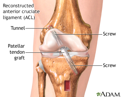 BACK TOTOP Browse A-ZSearchBrowse A-ZABCDEFGHIJKLMNOPQRSTUVWXYZ0-9 E-mail FormEmail ResultsName:Email address:Recipients Name:Recipients address:Message: Print-FriendlyBookmarksbookmarks-menuKnee arthroscopyKnee scope - arthroscopic lateral retinacular release; Synovectomy - knee; Patellar (knee) debridement; Meniscus repair; Lateral release; Knee surgery; Meniscus - arthroscopy; Collateral ligament - arthroscopyKnee arthroscopy is surgery that uses a tiny camera to look inside your knee. Small cuts are made to insert the camera and small surgical tools into your knee for the procedure. Description Three different types of pain relief (anesthesia) may be used for knee arthroscopy surgery:Local anesthesia. Your knee may be numbed with pain medicine. You may also be given medicines that relax you. You will stay awake. Spinal anesthesia. This is also called regional anesthesia. The pain medicine is injected into a space in your spine. You will be awake but will not be able to feel anything below your waist. Spinal anesthesiaSpinal and epidural anesthesia are procedures that deliver medicines that numb parts of your body to block pain. They are given through shots in or ...ImageRead Article Now Book Mark Article General anesthesia. You will be asleep and pain-free. General anesthesiaGeneral anesthesia is treatment with certain medicines that puts you into a deep sleep-like state so you do not feel pain during surgery. After you ...Read Article Now Book Mark Article Regional nerve block (femoral or adductor canal block). This is another type of regional anesthesia. The pain medicine is injected around the nerve in your groin or leg. You will be asleep during the operation. This type of anesthesia will block out pain so that you need less general anesthesia.A cuff-like device may be put around your thigh to help control bleeding during the procedure.The surgeon will make 2 or 3 small cuts around your knee. Fluid (saline) will be pumped into your knee to inflate the knee.A narrow tube with a tiny camera on the end will be inserted through one of the cuts. The camera is attached to a video monitor that lets the surgeon see inside the knee. The surgeon may put other small surgery tools inside your knee through the other cuts. The surgeon will then fix or remove the problem in your knee.At the end of your surgery, the saline will be drained from your knee. The surgeon will close your cuts with sutures (stitches) and cover them with a dressing. Many surgeons take pictures of the procedure from the video monitor. You may be able to view these pictures after the operation so that you can see what was done. Why the Procedure Is Performed Arthroscopy may be recommended for these knee problems:Torn meniscus. Meniscus is cartilage that cushions the space between the bones in the knee. Surgery is done to repair or remove it. MeniscusThe meniscus is a c-shaped piece of cartilage in your knee joint. You have two in each knee. Meniscus cartilage is a tough but flexible tissue that ...ImageRead Article Now Book Mark Article Torn or damaged anterior cruciate ligament (ACL) or posterior cruciate ligament (PCL). Anterior cruciateAn anterior cruciate ligament injury is the over-stretching or tearing of the anterior cruciate ligament (ACL) in the knee. A tear may be partial or...ImageRead Article Now Book Mark Article Posterior cruciateA ligament is a band of tissue that connects a bone to another bone. The posterior cruciate ligament (PCL) is located inside your knee joint and con...ImageRead Article Now Book Mark Article Swollen (inflamed) or damaged lining of the joint. This lining is called the synovium. Kneecap (patella) that is out of position (misalignment). Small pieces of broken cartilage in the knee joint. Removal of a Baker cyst. This is a swelling behind the knee that is filled with fluid. Sometimes the problem occurs when there is swelling and pain (inflammation) from other causes, like arthritis. Baker cystBaker cyst is a buildup of joint fluid (synovial fluid) that forms a swelling behind the knee.ImageRead Article Now Book Mark Article Repair or reconstruction of defects in cartilage. Repair or reconstruction of defects in ...Meniscal allograft transplantation is surgery in which a meniscus -- a c-shaped cartilage in the knee -- is placed into your knee. The new meniscus ...Read Article Now Book Mark Article Some fractures of the bones of the knee. Risks The risks of anesthesia and surgery are:Allergic reactions to medicines Breathing problems Breathing problemsBreathing difficulty may involve:Difficult breathing Uncomfortable breathingFeeling like you are not getting enough airImageRead Article Now Book Mark Article Bleeding BleedingBleeding is the loss of blood. Bleeding may be:Inside the body (internal)Outside the body (external)Bleeding may occur:Inside the body when blood le...ImageRead Article Now Book Mark Article InfectionAdditional risks of this surgery include:Bleeding into the knee joint Damage to the cartilage, meniscus, or ligaments in the knee Blood clot in the leg Blood clotBlood clots are clumps that occur when blood hardens from a liquid to a solid. A blood clot that forms inside one of your veins or arteries is calle...ImageRead Article Now Book Mark Article Injury to a blood vessel or nerve Infection in the knee joint Knee stiffness Before the Procedure Always tell your health care provider what medicines you are taking, even drugs, supplements, or herbs you bought without a prescription.During the 2 weeks before your surgery:You may be told to stop taking medicines that make it harder for your blood to clot. These include aspirin, ibuprofen (Advil, Motrin), naproxen (Naprosyn, Aleve), and other blood thinners. Ask which medicines you should still take on the day of your surgery. Tell your provider if you have been drinking a lot of alcohol (more than 1 drink per day for women or 2 drinks per day for men). If you smoke, try to stop. Ask your provider for help. Smoking can slow do