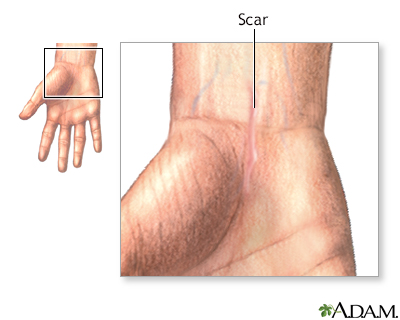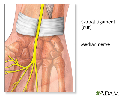 BACK TOTOP Browse A-ZSearchBrowse A-ZABCDEFGHIJKLMNOPQRSTUVWXYZ0-9 E-mail FormEmail ResultsName:Email address:Recipients Name:Recipients address:Message: Print-FriendlyBookmarksbookmarks-menuCarpal tunnel release Median nerve decompression; Carpal tunnel decompression; Surgery - carpal tunnelCarpal tunnel release is surgery to treat carpal tunnel syndrome. Carpal tunnel syndrome is pain and weakness in the hand that is caused by pressure on the median nerve in the wrist.Carpal tunnel syndromeCarpal tunnel syndrome is a condition in which there is excessive pressure on the median nerve at the wrist. This is the nerve that allows feeling a...ImageRead Article Now Book Mark Article Description Related video goes here for no-HTML5 browsersThe median nerve and the tendons that flex (or curl) your fingers go through a passage called the carpal tunnel in your wrist. This tunnel is narrow, so any swelling can pinch the nerve and cause pain. A thick ligament (tissue) just under your skin (the carpal ligament) makes up the top of this tunnel. During the operation, the surgeon cuts through the carpal ligament to make more space for the nerve and tendons.The surgery is done in the following way:First, you receive numbing medicine so that you do not feel pain during surgery. You may be awake but you will also receive medicines to make you relax. A small surgical cut is made in the palm of your hand near your wrist. Next, the ligament that covers the carpal tunnel is cut. This eases the pressure on the median nerve. Sometimes, tissue around the nerve is removed as well. The skin and tissue underneath your skin are closed with sutures (stitches). Sometimes this procedure is done using a tiny camera attached to a monitor. The surgeon inserts the camera into your wrist through a small surgical cut and views the monitor to see inside your wrist. This is called endoscopic surgery. The instrument used is called an endoscope. Why the Procedure Is Performed People with symptoms of carpal tunnel syndrome usually try nonsurgical treatments first. These may include:Anti-inflammatory medicines Therapy to learn exercises and stretches Workplace changes to improve your seating and how you use your computer or other equipment Wrist splints Shots of corticosteroid medicine into the carpal tunnel If none of these treatments help, some surgeons will test the electrical activity of the median nerve with an EMG (electromyogram). If the test shows that there's a significant problem with your median nerve, carpal tunnel release surgery may be recommended.EMGElectromyography (EMG) is a test that checks the health of the muscles and the nerves that control the muscles.ImageRead Article Now Book Mark Article If the muscles in your hand and wrist are getting smaller because the median nerve is being pinched, surgery will usually be done sooner. Risks Risks of this surgery are:Allergic reactions to medicines Bleeding Infection Injury to the median nerve or nerves that branch off of it Weakness and numbness around the hand In rare cases, injury to another nerve or blood vessel (artery or vein) Scar tenderness Worsening pain after the procedure Before the Procedure Before the surgery, you should:Tell your surgeon what medicines you are taking. This includes medicines, supplements, or herbs you bought without a prescription. You may be asked to temporarily stop taking your blood-thinning medicines. These include aspirin, ibuprofen (Advil, Motrin), naproxen (Naprosyn, Aleve), and other medicines. Ask your surgeon which medicines you should still take on the day of your surgery. If you smoke, try to stop. Ask your provider for help. Smoking can slow healing. Let your surgeon know about any cold, flu, fever, herpes breakout, or other illness. If you do get sick, your surgery may need to be postponed. On the day of surgery:Follow instructions about whether you need to stop eating or drinking before surgery. Take any medicines you're asked to take with a small sip of water. Follow instructions on when to arrive at the hospital. Be sure to arrive on time. After the Procedure This surgery is done on an outpatient basis. You will not need to stay in the hospital.After the surgery, your wrist will probably be in a splint or heavy bandage for about a week. Keep this on until your first surgeon visit after surgery, and keep it clean and dry. After the splint or bandage is removed, you will begin motion exercises or a hand therapy program. Outlook (Prognosis) Carpal tunnel release decreases pain, nerve tingling, and numbness, and restores muscle strength. Most people are helped by this surgery.The length of your recovery will depend on how long you had symptoms before surgery and how badly damaged your median nerve is. If you had symptoms for a long time, you may not be completely free of symptoms after you recover.Open ReferencesReferencesAmadio PC. Surgery management of compression neuropathies of the wrist. In: Skirven TM, Osterman AL, Fedorczyk JM, Amadio PC, Feldscher SB, Shin EK, eds. Rehabilitation of the Hand and Upper Extremity. 7th ed. Philadelphia, PA: Elsevier; 2021:chap 52.Patterson JMM, Novak CB, Mackinnon SE. Compression neuropathies. In: Wolfe SW, Pederson WC, Kozin SH, Cohen MS, eds. Green's Operative Hand Surgery. 8th ed. Philadelphia, PA: Elsevier; 2022:chap 28.Weller WJ, Calandruccio JH, Jobe MT. Compressive neuropathies of the hand, forearm, and elbow. In: Azar FM, Beaty JH, eds. Campbell's Operative Orthopaedics. 14th ed. Philadelphia, PA: Elsevier; 2021:chap 77.Zhao M, Burke DT. Median neuropathy (carpal tunnel syndrome). In: Frontera WR, Silver JK, Rizzo TD Jr, eds. Essentials of Physical Medicine and Rehabilitation: Musculoskeletal Disorders, Pain, and Rehabilitation. 4th ed. Philadelphia, PA: Elsevier; 2019:chap 36.AllVideoImagesTogCarpal tunnel syndrome - illustration Carpal tunnel syndrome is becoming more frequently recognized and may be occurring more often. It may result from repetitive motion or the use of devi