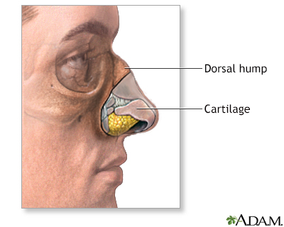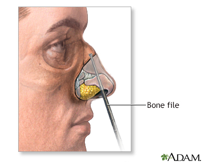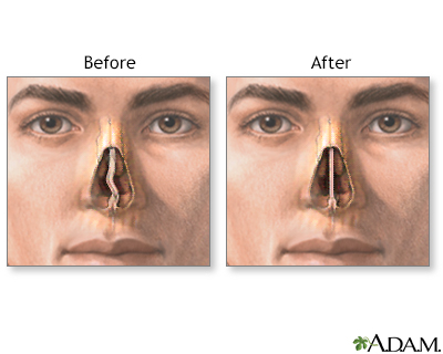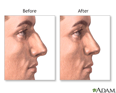 BACK TOTOP Browse A-ZSearchBrowse A-ZABCDEFGHIJKLMNOPQRSTUVWXYZ0-9 E-mail FormEmail ResultsName:Email address:Recipients Name:Recipients address:Message: Print-FriendlyBookmarksbookmarks-menuRhinoplastyCosmetic nose surgery; Nose job - rhinoplastyRhinoplasty is surgery to repair or reshape the nose. Description Rhinoplasty can be performed under local or general anesthesia, depending on the extent of the procedure and the person's preference. It is performed in a surgeon's office, a hospital, or an outpatient surgery center. Complex procedures may require a short hospital stay. The procedure often takes 1 to 3 hours. It may take longer.General anesthesiaGeneral anesthesia is treatment with certain medicines that puts you into a deep sleep-like state so you do not feel pain during surgery. After you ...Read Article Now Book Mark Article With local anesthesia, the nose and the area around it are numbed. You will probably be lightly sedated, but awake during the surgery (relaxed and not feeling pain). General anesthesia allows you to sleep through the operation.The surgery is usually done through a cut (incision) made inside the nostrils. In some cases, the cut is made from outside, around the base of the nose. This type of cut is often used to perform work on the tip of the nose or if you need a revision surgery. If the nose needs to be narrowed, the incision may extend around the nostrils. Small incisions may be made on the inside of the nose to break, and reshape the bone.A splint (metal or plastic) may be placed on the outside of the nose. This helps maintain the new shape of the bone when the surgery is finished. Soft plastic splints or nasal packs also may be placed in the nostrils. This helps keep the dividing cartilage wall between the air passages (septum) stable. Why the Procedure Is Performed Rhinoplasty is one of the most common plastic surgery procedures. It can be used to:Reduce the size of the nose Change the shape of the tip or the nasal bridge Narrow the opening of the nostrils Change the angle between the nose and the upper lip Correct a birth defect or injury Help relieve nasal breathing problems Nose surgery is considered elective when it is done for cosmetic reasons. In these cases, the purpose is to change the shape of the nose to one that the person finds more desirable. Many surgeons prefer to perform cosmetic nose surgery after the nasal bone has finished growing. This is around age 15 to 16 for girls and a bit later for boys. Risks Risks for anesthesia and surgery in general are:Reactions to medicines, problems breathing Bleeding, infection, or bruising Risks for this procedure include:Loss of support of the nose Contour deformities of the nose Worsening of breathing through the nose Need for further surgeryAfter surgery, tiny blood vessels that have burst may appear as tiny red spots on the skin surface. These are usually minor, but are permanent. There are no visible scars if the rhinoplasty is performed from inside the nose. If the procedure narrows flared nostrils, there may be small scars at the base of the nose that are not often visible.In rare cases, a revision procedure is needed to fix a minor deformity. Before the Procedure Your surgeon may give you instructions to follow before your surgery. You may need to:Stop any blood thinning medicines. Your surgeon will give you a list of these medicines. See your regular health care provider to make sure it is safe for you to have surgery. Stop smoking at least 2 to 3 weeks before and after surgery to aid with healing. To aid with healingQuitting smoking and other nicotine products, including e-cigarettes, before surgery can improve your recovery and outcome after surgery. Most people...ImageRead Article Now Book Mark Article Arrange to have someone drive you home after surgery. After the Procedure You will usually go home on the same day as your surgery.Right after surgery, your nose and face will be swollen and painful. Headaches are common.The nasal packing, if present, is usually removed in 3 to 5 days, after which you will feel more comfortable.The splint and cast may be left in place for 1 to 2 weeks. Outlook (Prognosis) Full recovery takes a year, but most swelling will have improved by 2 to 3 months.Healing is a slow and gradual process. The tip of the nose may have some swelling and numbness for several months but will improve with time. You may not be able to see the final results for up to a year and sometimes longer.Open ReferencesReferencesConstantian MB. Closed technique rhinoplasty. In: Rubin JP, Matarasso A, eds. Plastic Surgery, Volume 2: Aesthetic Surgery. 5th ed. Philadelphia, PA: Elsevier; 2024:chap 20.Rohrich RJ, Afrooz PN. Open technique rhinoplasty. In: Rubin JP, Matarasso A, eds. Plastic Surgery, Volume 2: Aesthetic Surgery. 5th ed. Philadelphia, PA: Elsevier; 2024:chap 19.Sclafani AP, Thomas JR, Tardy ME. Rhinoplasty. In: Flint PW, Francis HW, Haughey BH, et al, eds. Cummings Otolaryngology: Head and Neck Surgery. 7th ed. Philadelphia, PA: Elsevier; 2021:chap 31.AllVideoImagesTogSeptoplasty - series - Septal anatomyPresentation Nose surgery - seriesPresentation Septoplasty - series - Septal anatomyPresentation Nose surgery - seriesPresentation Related Information Septoplasty(Surgery)Septoplasty - discharge(Discharge) Review Date: 2/5/2025 Reviewed By: Tang Ho, MD, Associate Professor, Division of Facial Plastic and Reconstructive Surgery, Department of Otolaryngology – Head and Neck Surgery, The University of Texas Medical School at Houston, Houston, TX. Also reviewed by David C. Dugdale, MD, Medical Director, Brenda Conaway, Editorial Director, and the A.D.A.M. Editorial team. The information provided herein should not be used during any medical emergency or for the diagnosis or treatment of any medical condition. A licensed medical professional should be consulted for diagnosis and treatment of any and all medical conditions. Links to other sites are provided for information only -- t