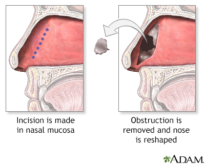 RhinoplastyCosmetic nose surgery; Nose job - rhinoplastyRhinoplasty is surgery to repair or reshape the nose. Description Rhinoplasty can be performed under local or general anesthesia, depending on the extent of the procedure and the person's preference. It is performed in a surgeon's office, a hospital, or an outpatient surgery center. Complex procedures may require a short hospital stay. The procedure often takes 1 to 3 hours. It may take longer.General anesthesiaGeneral anesthesia is treatment with certain medicines that puts you into a deep sleep-like state so you do not feel pain during surgery. After you ...Read Article Now Book Mark Article With local anesthesia, the nose and the area around it are numbed. You will probably be lightly sedated, but awake during the surgery (relaxed and not feeling pain). General anesthesia allows you to sleep through the operation.The surgery is usually done through a cut (incision) made inside the nostrils. In some cases, the cut is made from outside, around the base of the nose. This type of cut is often used to perform work on the tip of the nose or if you need a revision surgery. If the nose needs to be narrowed, the incision may extend around the nostrils. Small incisions may be made on the inside of the nose to break, and reshape the bone.A splint (metal or plastic) may be placed on the outside of the nose. This helps maintain the new shape of the bone when the surgery is finished. Soft plastic splints or nasal packs also may be placed in the nostrils. This helps keep the dividing cartilage wall between the air passages (septum) stable. Why the Procedure Is Performed Rhinoplasty is one of the most common plastic surgery procedures. It can be used to:Reduce the size of the nose Change the shape of the tip or the nasal bridge Narrow the opening of the nostrils Change the angle between the nose and the upper lip Correct a birth defect or injury Help relieve nasal breathing problems Nose surgery is considered elective when it is done for cosmetic reasons. In these cases, the purpose is to change the shape of the nose to one that the person finds more desirable. Many surgeons prefer to perform cosmetic nose surgery after the nasal bone has finished growing. This is around age 15 to 16 for girls and a bit later for boys. Risks Risks for anesthesia and surgery in general are:Reactions to medicines, problems breathing Bleeding, infection, or bruising Risks for this procedure include:Loss of support of the nose Contour deformities of the nose Worsening of breathing through the nose Need for further surgeryAfter surgery, tiny blood vessels that have burst may appear as tiny red spots on the skin surface. These are usually minor, but are permanent. There are no visible scars if the rhinoplasty is performed from inside the nose. If the procedure narrows flared nostrils, there may be small scars at the base of the nose that are not often visible.In rare cases, a revision procedure is needed to fix a minor deformity. Before the Procedure Your surgeon may give you instructions to follow before your surgery. You may need to:Stop any blood thinning medicines. Your surgeon will give you a list of these medicines. See your regular health care provider to make sure it is safe for you to have surgery. Stop smoking at least 2 to 3 weeks before and after surgery to aid with healing. To aid with healingQuitting smoking and other nicotine products, including e-cigarettes, before surgery can improve your recovery and outcome after surgery. Most people...ImageRead Article Now Book Mark Article Arrange to have someone drive you home after surgery. After the Procedure You will usually go home on the same day as your surgery.Right after surgery, your nose and face will be swollen and painful. Headaches are common.The nasal packing, if present, is usually removed in 3 to 5 days, after which you will feel more comfortable.The splint and cast may be left in place for 1 to 2 weeks. Outlook (Prognosis) Full recovery takes a year, but most swelling will have improved by 2 to 3 months.Healing is a slow and gradual process. The tip of the nose may have some swelling and numbness for several months but will improve with time. You may not be able to see the final results for up to a year and sometimes longer.Open ReferencesReferencesConstantian MB. Closed technique rhinoplasty. In: Rubin JP, Matarasso A, eds. Plastic Surgery, Volume 2: Aesthetic Surgery. 5th ed. Philadelphia, PA: Elsevier; 2024:chap 20.Rohrich RJ, Afrooz PN. Open technique rhinoplasty. In: Rubin JP, Matarasso A, eds. Plastic Surgery, Volume 2: Aesthetic Surgery. 5th ed. Philadelphia, PA: Elsevier; 2024:chap 19.Sclafani AP, Thomas JR, Tardy ME. Rhinoplasty. In: Flint PW, Francis HW, Haughey BH, et al, eds. Cummings Otolaryngology: Head and Neck Surgery. 7th ed. Philadelphia, PA: Elsevier; 2021:chap 31.