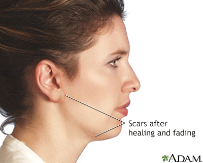 FaceliftRhytidectomy; Facialplasty; Cosmetic surgery of the faceA facelift is a surgical procedure to repair sagging, drooping, and wrinkled skin of the face and neck. Description A facelift can be done alone or with nose reshaping, a forehead lift, or eyelid surgery.Nose reshapingRhinoplasty is surgery to repair or reshape the nose.ImageRead Article Now Book Mark Article Forehead liftA forehead lift is a surgical procedure to correct sagging of the forehead skin, eyebrows, and upper eyelids. It may also improve the look of wrinkl...ImageRead Article Now Book Mark Article Eyelid surgeryEyelid lift surgery is done to repair sagging or drooping upper eyelids (ptosis) and remove excess skin from the eyelids. The surgery can include pt...ImageRead Article Now Book Mark Article While you are sleepy and pain-free (conscious sedation), or deeply asleep and pain-free (general anesthesia), the plastic surgeon will make surgical cuts that begin above the hairline at the temples, extend behind the earlobe, and to the lower scalp. Often, this is one cut. An incision may be made beneath your chin.Conscious sedationConscious sedation uses a combination of medicines to help you relax (a sedative) and to reduce pain (an analgesic) during a medical or dental proced...Read Article Now Book Mark Article Many different techniques exist. The outcomes for each one are similar but how long the improvement lasts may vary.During a facelift, the surgeon may:Remove and lift some of the fat and muscle underneath the skin (called the SMAS layer; this is the main lifting part of the facelift) Remove or move loose skin Tighten muscles Perform liposuction of the neck and jowls LiposuctionLiposuction is the removal of excess body fat by suction using special surgical equipment. A plastic surgeon typically does the surgery.ImageRead Article Now Book Mark Article Use stitches (sutures) to close the cuts Related video goes here for no-HTML5 browsers Why the Procedure Is Performed Sagging or wrinkled skin occurs naturally as you get older. Folds and fat deposits appear around the neck. Deep creases form between the nose and mouth. The jawline grows jowly and slack. Genes, poor diet, smoking, or obesity can make skin problems start sooner or get worse faster.A facelift can help improve some of the visible signs of aging. Fixing damage to skin, fat, and muscles can restore a younger, more refreshed and less tired look.People have a facelift because they are not satisfied with the signs of aging on their face, but they are in otherwise good health. Risks Risks of anesthesia and surgery in general are:Reactions to medicines Breathing problems Breathing problemsBreathing difficulty may involve:Difficult breathing Uncomfortable breathingFeeling like you are not getting enough airImageRead Article Now Book Mark Article Bleeding, blood clots, or infection BleedingBleeding is the loss of blood. Bleeding may be:Inside the body (internal)Outside the body (external)Bleeding may occur:Inside the body when blood le...ImageRead Article Now Book Mark Article Blood clotsBlood clots are clumps that occur when blood hardens from a liquid to a solid. A blood clot that forms inside one of your veins or arteries is calle...ImageRead Article Now Book Mark Article Risks of face lift surgery include:A pocket of blood under the skin (hematoma) that may need to be drained surgically Damage to the nerves that control muscles of the face (this is usually temporary, but may be permanent) Wounds that do not heal well Pain that does not go away Numbness or other changes in skin sensation NumbnessNumbness and tingling are abnormal sensations that can occur anywhere in your body, but they are often felt in your fingers, hands, feet, arms, or le...ImageRead Article Now Book Mark Article Although most people are happy with the outcomes, poor cosmetic results that may need more surgery include:Unpleasant scarring Unevenness of the face Fluid that collects under the skin (seroma or sialocele) Irregular skin shape (contour) Changes in skin color Sutures that are noticeable or cause irritation Before the Procedure Before your surgery, you will have a consultation. This will include a history, physical exam, and a psychological evaluation. You may want to bring someone (such as your spouse) with you during the visit.Feel free to ask questions. Be sure you understand the answers to your questions. You must understand fully the preoperative preparations, the facelift procedure, the improvement that can be expected, and the care after surgery.Tell your surgeon or nurse if:You are or could be pregnant You are taking any medicines, including medicines, supplements, or herbs you bought without a prescriptionDuring the week before your surgery:You may be asked to temporarily stop taking medicines that reduce the ability of your blood to clot. These medicines are called blood thinners. This includes over-the-counter medicines and supplements such as aspirin, ibuprofen (Advil, Motrin), naproxen (Aleve, Naprosyn), and vitamin E. Many prescription medicines are also blood thinners. Ask your surgeon which medicines you should still take on the day of surgery.On the day of surgery:Follow instructions about when to stop eating and drinking. Take the medicines your surgeon told you to take with a small sip of water.Arrive at the hospital on time.Be sure to follow any other specific instructions from your surgeon. After the Procedure Your surgeon may temporarily place a small, thin drainage tube under the skin behind the ear to drain any blood that might collect there. Your head will be wrapped loosely in bandages to reduce bruising and swelling.BruisingA bruise is an area of skin discoloration. A bruise occurs when small blood vessels break and leak their contents into the soft tissue beneath the s...ImageRead Article Now Book Mark Article SwellingSwelling is the enlargement of organs, skin, or other body parts. It is caused by a buildup of fluid in the tissues. The extra fluid 