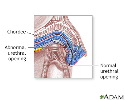 Hypospadias repairUrethroplasty; Meatoplasty; Glanuloplasty Hypospadias repair is surgery to correct a defect in the opening of the penis that is present at birth. The urethra (the tube that carries urine from the bladder to outside the body) does not end at the tip of the penis. Instead, it ends on the underside of the penis. In more severe cases, the urethra opens at the middle or bottom of the penis, or in or behind the scrotum.PenisThe penis is the male organ used for urination and sexual intercourse. The penis is located above the scrotum. It is made of spongy tissue and bloo...ImageRead Article Now Book Mark Article Description Hypospadias repair is done most often when boys are between 6 months and 2 years old. The surgery is done as an outpatient. The child rarely has to spend a night in the hospital. Boys who are born with hypospadias should not be circumcised at birth. The extra tissue of the foreskin may be needed to repair the hypospadias during surgery. HypospadiasHypospadias is a birth (congenital) defect in which the opening of the urethra is on the underside of the penis. The urethra is the tube that carrie...Read Article Now Book Mark Article Before surgery, your child will receive general anesthesia. This will make him sleep and make him unable to feel pain during surgery. Mild defects may be repaired in one procedure. Severe defects may need two or more procedures.The surgeon will use a small piece of foreskin or tissue from another site to create a tube that increases the length of the urethra. Extending the length of the urethra will allow it to open at the tip of the penis.During surgery, the surgeon may place a catheter (tube) in the urethra to make it hold its new shape. The catheter may be sewn or fastened to the head of the penis to keep it in place. It will be removed 1 to 2 weeks after surgery.Most of the stitches used during surgery will dissolve on their own and will not have to be removed later. Why the Procedure Is Performed Hypospadias is one of the most common birth defects in boys. This surgery is performed on most boys who are born with the problem.If the repair is not done, problems may occur later on such as: Difficulty controlling and directing urine stream A curve in the penis during erection Decreased fertility Embarrassment about appearance of penisSurgery is not needed if the condition does not affect normal urination while standing, sexual function, or the deposit of semen. Risks Risks for this procedure include:A hole that leaks urine (fistula) FistulaA fistula is an abnormal connection between two body parts, such as an organ or blood vessel and another structure. Fistulas are usually the result ...ImageRead Article Now Book Mark Article Large blood clot (hematoma) HematomaA bruise is an area of skin discoloration. A bruise occurs when small blood vessels break and leak their contents into the soft tissue beneath the s...ImageRead Article Now Book Mark Article Scarring or narrowing of the repaired urethra Before the Procedure Your child's health care provider may ask for a complete medical history and do a physical exam before the procedure.Always tell your child's provider:What medicines your child is taking Medicines, herbs, and vitamins your child is taking that you bought without a prescription Any allergies your child has to medicine, latex, tape, or skin cleaner Ask your child's provider which medicines your child should still take on the day of surgery.On the day of the surgery:Your child will most often be asked not to drink or eat anything after midnight the night before surgery or 6 to 8 hours prior to surgery. Give your child any medicines your provider told you to give your child with a small sip of water. You will be told when to arrive for the surgery. The provider will make sure your child is healthy enough for surgery. If your child is ill, the surgery may be delayed. After the Procedure Right after surgery, your child's penis may be taped to his belly so that it does not move.Often, a bulky dressing or plastic cup is placed over the penis to protect the surgical area. A urinary catheter (a tube used to drain urine from the bladder) will be put through the dressing so urine can flow into the diaper.Your child will be encouraged to drink fluids so that he will urinate. Urinating will keep pressure from building up in the urethra.Your child may be given medicine to relieve pain. Most of the time, the child can leave the hospital the same day as the surgery. If you live a long way from the hospital, you may want to stay in a hotel near the hospital for the first night after the surgery.Your child's provider will explain how to take care of your child at home after leaving the hospital. How to take care of your child at home ...Your child had hypospadias repair to fix a birth defect in which the urethra does not end at the tip of the penis. The urethra is the tube that carr...ImageRead Article Now Book Mark Article Outlook (Prognosis) This surgery lasts a lifetime. Most children do well after this surgery. The penis will look almost or completely normal and function well. If your child has a complicated hypospadias, he may need more operations to improve the penis appearance or to repair a hole or narrowing in the urethra.Follow-up visits with a urologist may be needed after the surgery has healed. Boys will sometimes need to visit the urologist when they reach puberty. Open ReferencesReferencesCarrasco A, Murphy JP. Hypospadias. In: Holcomb GW, Murphy JP, St. Peter SD, eds. Holcomb and Ashcraft's Pediatric Surgery. 7th ed. Philadelphia, PA: Elsevier; 2020:chap 59.Elder JS. Anomalies of the penis and urethra. In: Kliegman RM, St. Geme JW, Blum NJ, Shah SS, Tasker RC, Wilson KM, eds. Nelson Textbook of Pediatrics. 21st ed. Philadelphia, PA: Elsevier; 2020:chap 559.Long CJ, Zaontz MR, Canning DA. Hypospadias. In: Partin AW, Domochowski RR, Kavoussi LR, Peters CA, eds. Campbell-Walsh-Wein Urology. 12th ed. Philadelphia, PA: Elsevier;