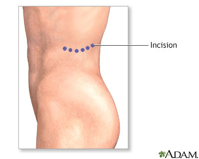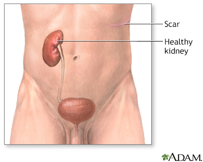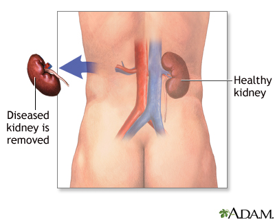 Kidney removalNephrectomy; Simple nephrectomy; Radical nephrectomy; Open nephrectomy; Laparoscopic nephrectomy; Partial nephrectomyKidney removal, or nephrectomy, is surgery to remove all or part of a kidney. It may involve:Part of one kidney removed (partial nephrectomy). All of one kidney removed (simple nephrectomy). Removal of one entire kidney, surrounding fat, and the adrenal gland (radical nephrectomy). In these cases, neighboring lymph nodes are sometimes removed. Description This surgery is done in the hospital while you are asleep and pain-free (general anesthesia). The procedure can take 3 or more hours.Simple nephrectomy or open kidney removal:You will be lying on your side. Your surgeon will make an incision (cut) up to 12 inches or 30 centimeters (cm) long. This cut will be on your side, just below the ribs or right over the lowest ribs. Muscle, fat, and tissue are cut and moved. Your surgeon may need to remove a rib to do the procedure. The tube that carries urine from the kidney to the bladder (ureter) and blood vessels are cut away from the kidney. The kidney is then removed. Sometimes, just a part of the kidney may be removed (partial nephrectomy). The cut is then closed with stitches or staples. Radical nephrectomy or open kidney removal:Your surgeon will make a cut about 8 to 12 inches (20 to 30 cm) long. This cut will be on the front of your belly, just below your ribs. It may also be done through your side. Muscle, fat, and tissue are cut and moved. The tube that carries urine from the kidney to the bladder (ureter) and blood vessels are cut away from the kidney. The kidney is then removed. Your surgeon will also take out the surrounding fat, and sometimes the adrenal gland and some lymph nodes. The cut is then closed with stitches or staples. Laparoscopic kidney removal:Your surgeon will make 3 or 4 small cuts, most often no more than 1 inch (2.5 cm) each, in your belly and side. The surgeon will use tiny probes and a camera to do the surgery. Towards the end of the procedure, your surgeon will make one of the cuts larger (about 4 inches or 10 cm) to take out the kidney. The surgeon will cut the ureter, place a bag around the kidney, and pull it through the larger cut. This surgery may take longer than an open kidney removal. However, most people recover faster and feel less pain after this type of surgery when compared to the pain and recovery period following open surgery. Sometimes, your surgeon may make a cut in a different place than described above.Some hospitals and medical centers are doing this surgery using robotic tools. Surgery using robotic toolsRobotic surgery is a method to perform surgery using very small tools attached to a robotic arm. The surgeon controls the robotic arm with a compute...Read Article Now Book Mark Article Why the Procedure Is Performed Kidney removal may be recommended for:Someone donating a kidney Birth defects Kidney cancer or suspected kidney cancer Kidney cancerRenal cell carcinoma is a type of kidney cancer that starts in the lining of very small tubes (tubules) in the kidney.ImageRead Article Now Book Mark Article A kidney damaged by infection, kidney stones, or other problems Kidney stonesA kidney stone is a solid mass made up of tiny crystals. One or more stones can be in the kidney or ureter at the same time.ImageRead Article Now Book Mark Article To help control high blood pressure in someone who has problems with the blood supply to their kidney High blood pressureBlood pressure is a measurement of the force exerted against the walls of your arteries as your heart pumps blood to your body. Hypertension is the ...ImageRead Article Now Book Mark Article Very bad injury (trauma) to the kidney that cannot be repaired Risks Risks of any surgery are:Blood clots in the legs that may travel to the lungs Blood clotsBlood clots are clumps that occur when blood hardens from a liquid to a solid. A blood clot that forms inside one of your veins or arteries is calle...ImageRead Article Now Book Mark Article Breathing problems Breathing problemsBreathing difficulty may involve:Difficult breathing Uncomfortable breathingFeeling like you are not getting enough airImageRead Article Now Book Mark Article Infection, including in the surgical wound, lungs (pneumonia), bladder, or kidney PneumoniaPneumonia is inflamed or swollen lung tissue due to infection with a germ. This article covers community-acquired pneumonia (CAP). This type of pneu...ImageRead Article Now Book Mark Article Blood loss Blood lossBleeding is the loss of blood. Bleeding may be:Inside the body (internal)Outside the body (external)Bleeding may occur:Inside the body when blood le...ImageRead Article Now Book Mark Article Heart attack or stroke during surgery Heart attackMost heart attacks are caused by a blood clot that blocks one of the coronary arteries. The coronary arteries bring blood and oxygen to the heart. ...ImageRead Article Now Book Mark Article StrokeA stroke occurs when blood flow to a part of the brain stops. A stroke is sometimes called a "brain attack. " If blood flow is cut off for longer th...ImageRead Article Now Book Mark Article Reactions to medicinesRisks of this procedure are:Injury to other organs or structures Kidney failure in the remaining kidney Kidney failureAcute kidney failure is the rapid (less than 2 days) loss of your kidneys' ability to remove waste and help balance fluids and electrolytes in your b...ImageRead Article Now Book Mark Article After one kidney is removed, your other kidney may not work as well for awhile Hernia of your surgical woundHerniaA hernia is a sac formed by the lining of the abdominal cavity (peritoneum). The sac comes through a hole or weak area in the strong layer of the be...ImageRead Article Now Book Mark Article Before the Procedure Tell your surgeon or nurse if:You are or could be pregnant You are taking any medicines, including medicines, drugs, supplements, or herbs you bought without a prescription You h